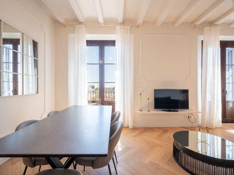 This wonderful apartment with 3 bedrooms is located in the heart of El Born neighbourhood, close to the Santa Caterina Market and Via Laietana. It has been refurbished maintaining the charm of its original features and adding today's comfort. The property has 131 sqm and 12 sqm of common elements according to Cadastre. It was refurbished in 2022. It's on the real 2nd floor of a historic building from 1850, which has been restored and has a lift. There are only 8 neighbours in the building. The spacious living room is bright and welcoming, with access to a pleasant balcony overlooking the street, which can accommodate a breakfast table and 2 chairs. The kitchen and dining area is open in the central part of the flat, with plenty of natural light and ventilation, as it has large windows that can be opened and overlooks the inner courtyard of the building. The flat has 3 bedrooms, a bathroom with bathtub and a toilet/laundry room which could be fitted with a shower tray. The master bedroom is very large and has a large built-in wardrobe and a small balcony. Natural light enters through a courtyard of the building. The second bedroom is a double and the third bedroom, situated between the living room and the dining room, is medium sized. The property has high ceilings with exposed wooden beams, original wooden carpentry, air conditioning by splits, ceiling fans and heating by radiators. The surrounding area has numerous services, shops, public transport options, historical and cultural attractions, and the leisure offer of the eclectic El Born neighbourhood. Do not hesitate to contact Bcn Advisors to visit this property.