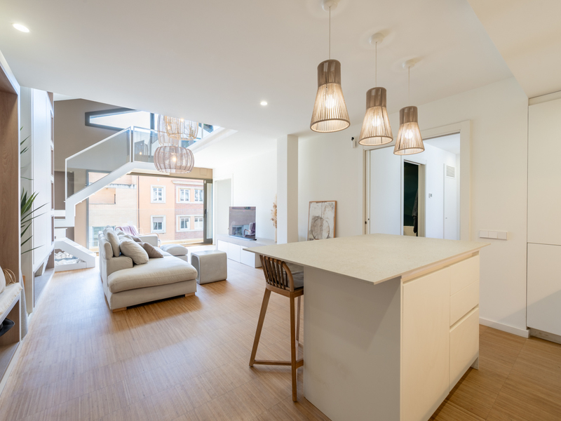 This fantastic flat with lots of natural light is on the sixth and top floor of a regal estate building in an excellent location in the Eixample district, just a few minutes from both Plaza Universitat and Plaza Espanya. The surrounding area offers numerous amenities, neighbourhood shops, shopping centres, bars, restaurants, leisure options and excellent transport links via metro line 1 and buses. This penthouse is extremely quiet, as it overlooks the courtyard, and bright, as it is on the top floor. It has 98 sqm according to the Land Registry and a 1.7 sqm balcony. It was completely refurbished with high-quality finishings, maintaining original features such as restored hydraulic floors, ceilings with mouldings and rosettes, and restored double-glazed windows. In addition, the refurbishment included completely new electrical and plumbing installations. The living area is very spacious: it consists of a living room with an open-plan kitchen and central island, an open gallery area where the dining table is located, and a balcony overlooking the block courtyard, with mountain views and space for a small breakfast table and two chairs. The night area has three interior bedrooms that are very quiet yet bright, as they are on the top floor: one en suite with its own bathroom, one double and one medium-sized. Finally, there's a second separate bathroom. The apartment is equipped with premium materials and finishings such as a Santos kitchen, BORA induction hob with integrated extractor fan, other Siemens household appliances, an osmosis system, Daikin split air conditioning and dimmable lights. The building has a lift and concierge. This is a fantastic opportunity to live in a home with character in one of the best areas of Barcelona. Do not hesitate to contact Bcn Advisors to visit this penthouse.