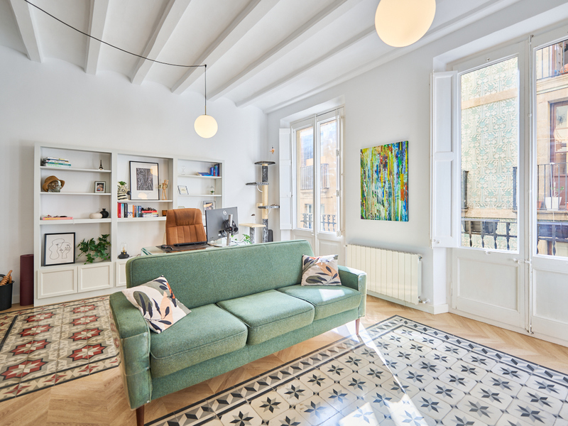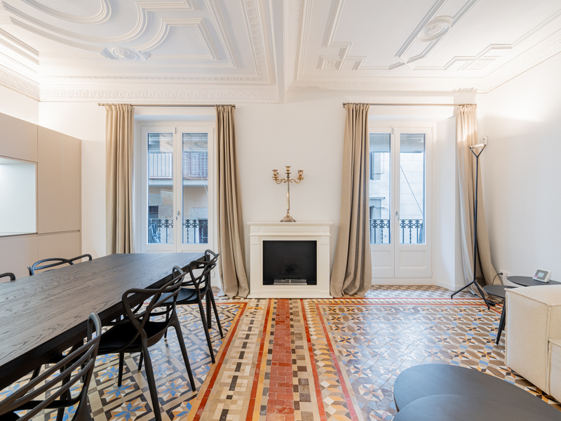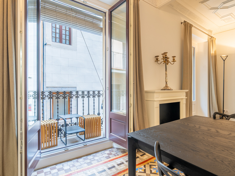 This charming apartment, completely renovated in 2021, stands out for the beauty of its original modernist features, such as the hydraulic floors and mouldings on the high ceilings. It is located in the historic centre of Barcelona, very close to La Rambla, the Gran Teatre del Liceu and the Boqueria Market, ideal for those seeking to combine cosmopolitan life with the charm of history. The property is in flawless condition, almost brand new. It has 100 built interior sqm and a 6 sqm terrace. It's on the real second floor of a listed modernist building from 1890 with no lift. The entrance hall leads to the spacious living-dining room of over 30 sqm with an integrated kitchen. It is very bright and has 2 balconies overlooking the street. Next to it there'ss a laundry room with a wine cooler and a small interior room that can be used as a study, dressing room or storage space. The night area has two double bedrooms. The master bedroom is en suite with its own bathroom and has access to the terrace. It is a perfect place to have breakfast or a drink outdoors and faces the interior courtyard of the buildings. The second bedroom is interior and there is a separate bathroom. The renovation of this flat is of the highest standard, as it was carried out by an interior design studio using top-quality materials. It is sold with the furniture included in the price and is equipped with parquet flooring combined with hydraulic tiles, ducted hot/cold air conditioning, high-end appliances, an alarm system with cameras, sensors and opening detectors, double-glazed windows and shutters, and an ethanol fireplace in the living room. Living in this flat means enjoying all the history, nobility and character of Barcelona in the surrounding area, in a very central location less than a 15-minute walk from Plaza Catalunya. You will have numerous shops and services, shopping centres, restaurants, cafés, museums and places of cultural interest at your fingertips, as well as excellent public transport connections to anywhere in the city. Please do not hesitate to contact Bcn Advisors to visit this apartment.
