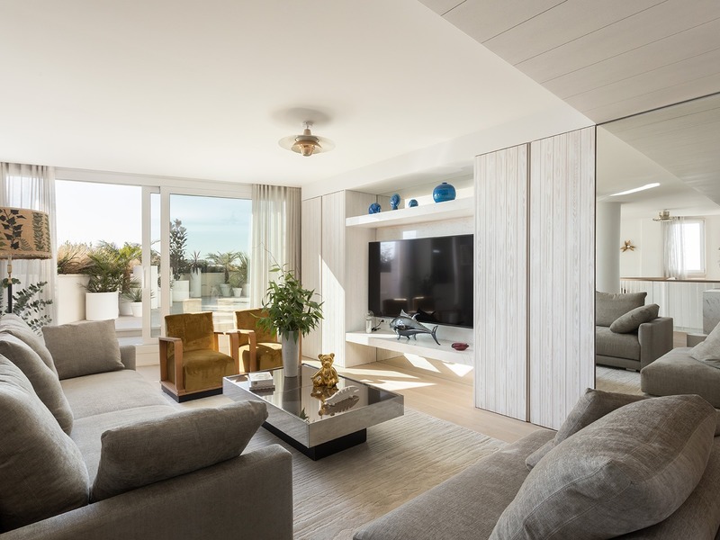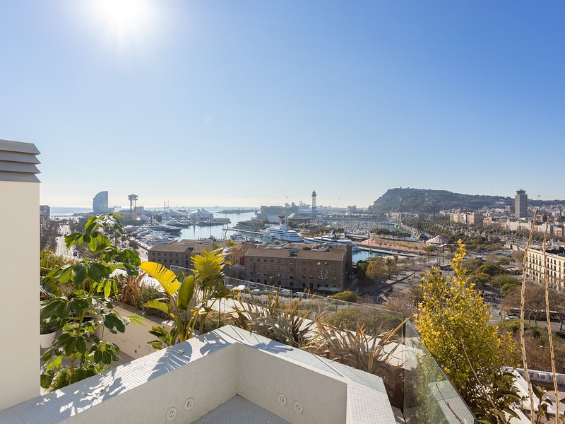 This penthouse is an exceptional opportunity to enjoy privileged views from one of the highest residential buildings in Barcelona. You will be able to see the sea and the whole city from this imposing vantage point: a luxury penthouse of 250 built interior sqm and a 120 sqm terrace with jacuzzi. It's located in a modern building from 2010, very close to Barceloneta beach, with easy access to the coast and a 20-minute drive from the airport. It also enjoys the proximity to the historic centre of the city, with all its services, shops and cultural attractions; the One Ocean Club and the Hotel Vela. The penthouse is accessed directly from the lift, with a private key. We are welcomed by a large entrance hall that leads to the very spacious day area, consisting of living room, dining room and the beautiful open plan kitchen in handmade wood and natural marble and the best household appliances. The living room has direct access to the spectacular terrace, with views of the sea and the entire city, which includes a large jacuzzi. The night area is headed by a large en-suite master bedroom with incredible sea views, an U-shaped dressing room and a spacious en-suite bathroom with a marble bathtub and hydro-massage. In addition, there are two en-suite bedrooms with built-in wardrobes. On the other hand, a spiral staircase leads to the guest apartment, which consists of a large living room with beautiful sea views, an open plan kitchen, a separate bedroom and an en-suite bathroom. It can be used for staff or as a guest house. This luxurious penthouse has recently been renovated to the highest standard by a renowned design firm of architects, finished in the highest quality natural materials, soft tones and nuances of fine design. In addition, the entire property has large windows that offer incredible views from almost every room. Finally, it includes 2 parking spaces and a storage room. The Catalan capital is a city that always surprises, and our luxury penthouses for sale in Barcelona are a testament to its beauty. Explore the available options and find your luxury oasis. Step into a world of elegance with our selection of luxury flats Barcelona.