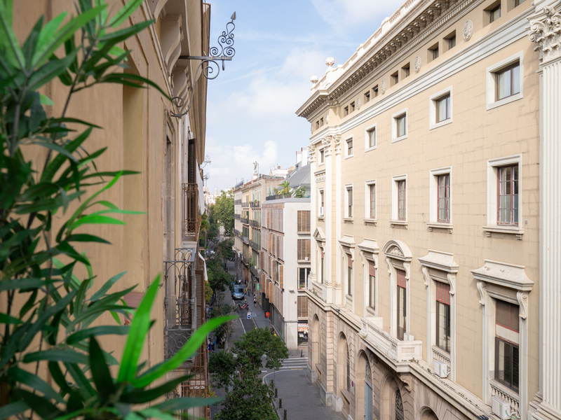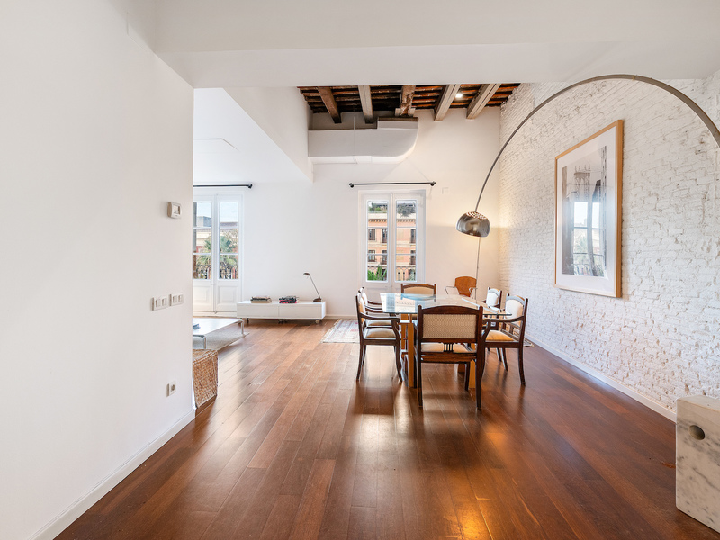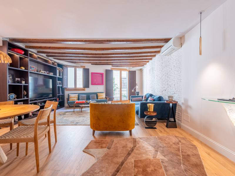 This flat enjoys a truly central location in Barcelona, next to Plaza Catalunya and La Rambla. An excellent place to live if you want to make the most of the city and also to invest in a highly sought-after area with high rental demand. The property has 120 built interior sqm and two terraces totalling 22 sqm. It's on the second floor of a building with a lift. It was renovated in 2013 and retains original features such as high ceilings with Catalan vaulting and exposed wooden beams, as well as doors and skirting boards, which give it a unique character. The flat comprises a living room opening onto the terrace, a kitchen-diner with fitted cupboards featuring sliding doors, a double bedroom opening onto the terrace, an en-suite bathroom and a dressing room, and a single bedroom with an en-suite bathroom. The terraces overlook an block courtyard and feature arcades and high ceilings, ideal for enjoying al fresco dining and conversation. The property is equipped with parquet flooring, industrial-style ducted air conditioning and natural gas radiator heating. The surrounding area offers all kinds of services, shops, shopping centres, designer boutiques, cafés, restaurants, cultural and historical attractions and excellent public transport links to anywhere in Barcelona and its metropolitan area. Please do not hesitate to contact Bcn Advisors to arrange a viewing of this flat.