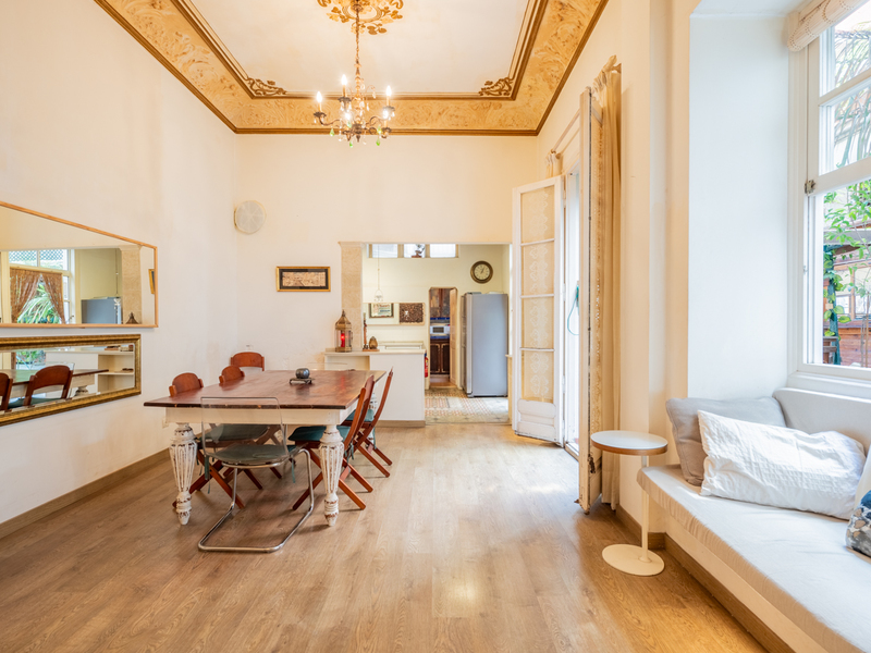 This unique modernist property of 151 built sqm and a 45 sqm interior courtyard is located in a privileged location. In the heart of Barcelona, just a few steps from Plaza Catalunya and La Rambla, the surrounding area offers you the historic charm of Barcelona, numerous neighbourhood shops and top brand boutiques, services, shopping centres and public transport. This property is located on the first floor of a building with lift. Its large spaces and high ceilings of 4 metres create an incredible feeling of spaciousness and offer great versatility in the distribution. In addition, it can be segregated into 2 flats. The property maintains the original elements of the period such as mosaic floors, ceiling mouldings and stained glass windows. The day area is a spacious living-dining room with semi-open kitchen, which occupies its own separate space and has a very large adjoining pantry. The night area has 4 bedrooms. Two of them have a balcony facing the street, in another one there's a mezzanine where a second bed can be placed and the fourth one communicates with a covered area that could be used as a study, office or even a workshop, or converted into another bedroom. There is also a complete bathroom with shower and a toilet. The 45 m2 courtyard, located in the centre of the property, is an oasis in the middle of the city, ideal for relaxing, enjoying outdoor meals or growing an urban garden. It also brings a lot of natural light to the whole flat. The flat is equipped with parquet floors and the electrical installation was completely renovated 10 years ago. Do not hesitate to contact Bcn Advisors to visit this property.
