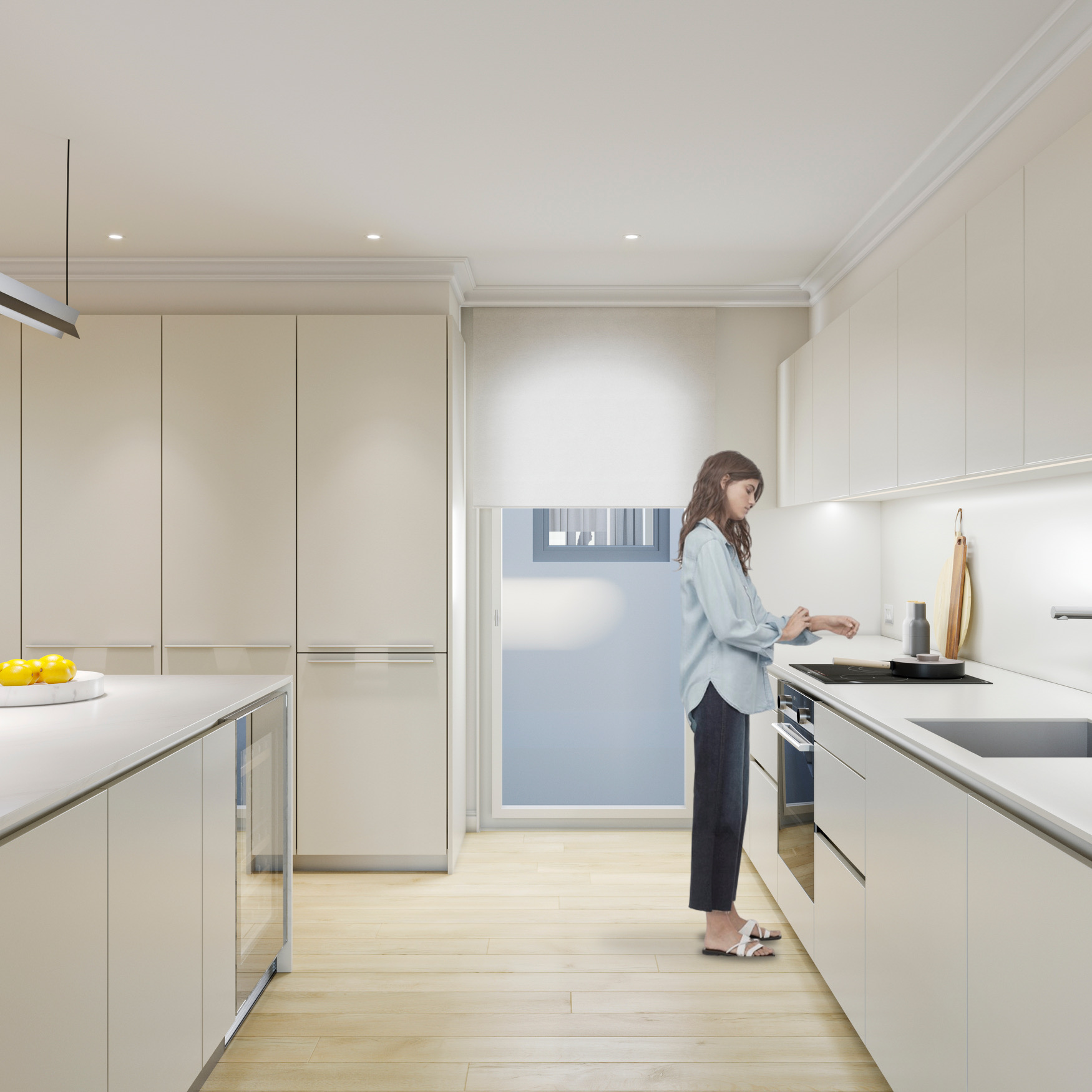 This flat with 185 sqm is on the real 4th floor and enjoys wonderful views of the Port Vell from its living room. A large entrance hall leads us to a corridor that crosses the night area and takes us first to the dining area with open plan kitchen and then to the spacious and bright living room.