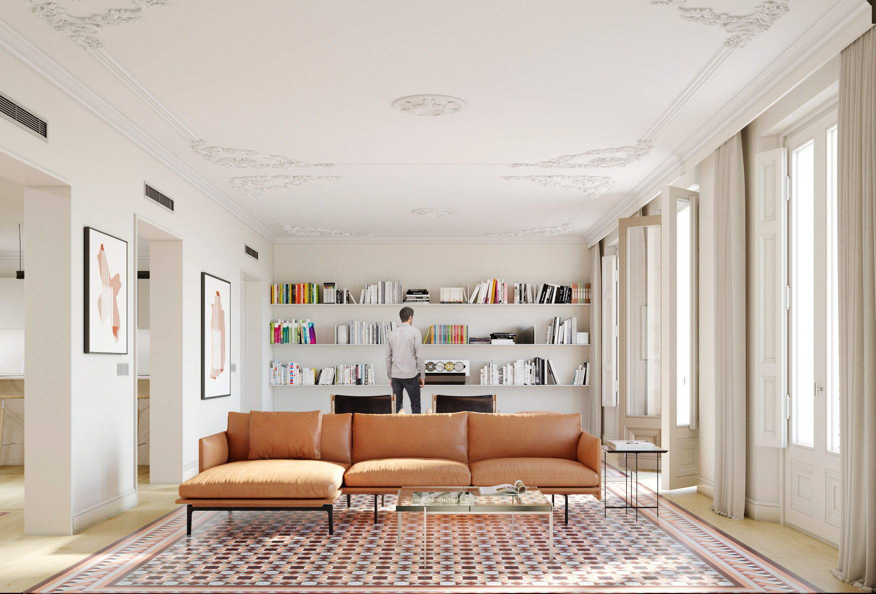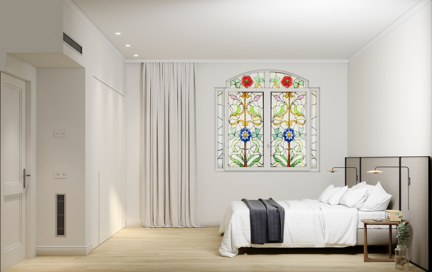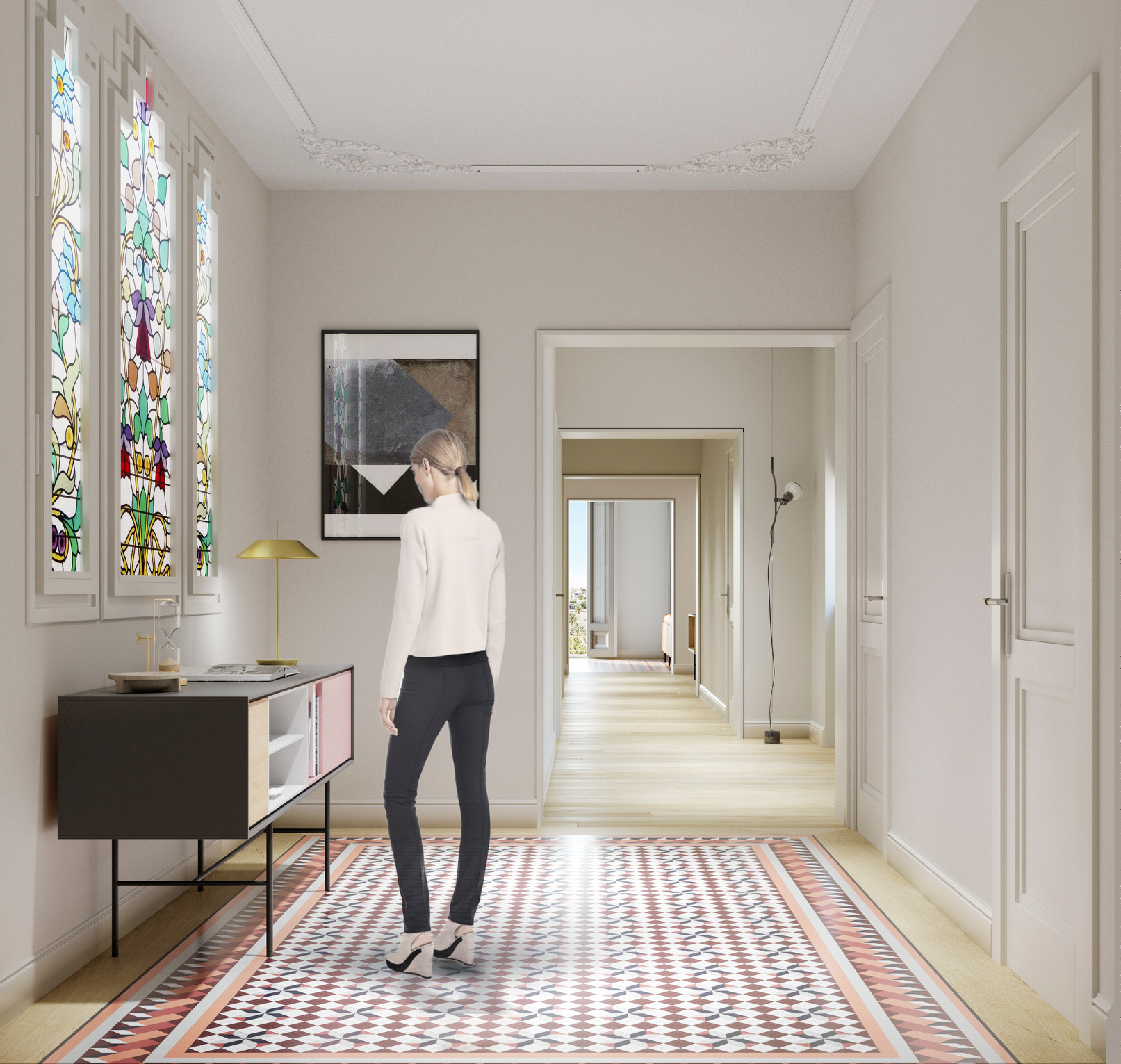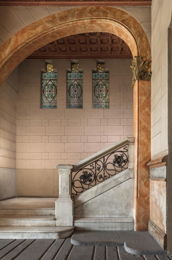 The flat conserves the beautiful original hydraulic floors and has all the comforts of the 21st century in a magnificent modernist building. Beautiful ironwork, stained glass windows, unique hydraulic floors, carved woodwork, all original, combined with the most modern building technologies and the most up to date equipment.