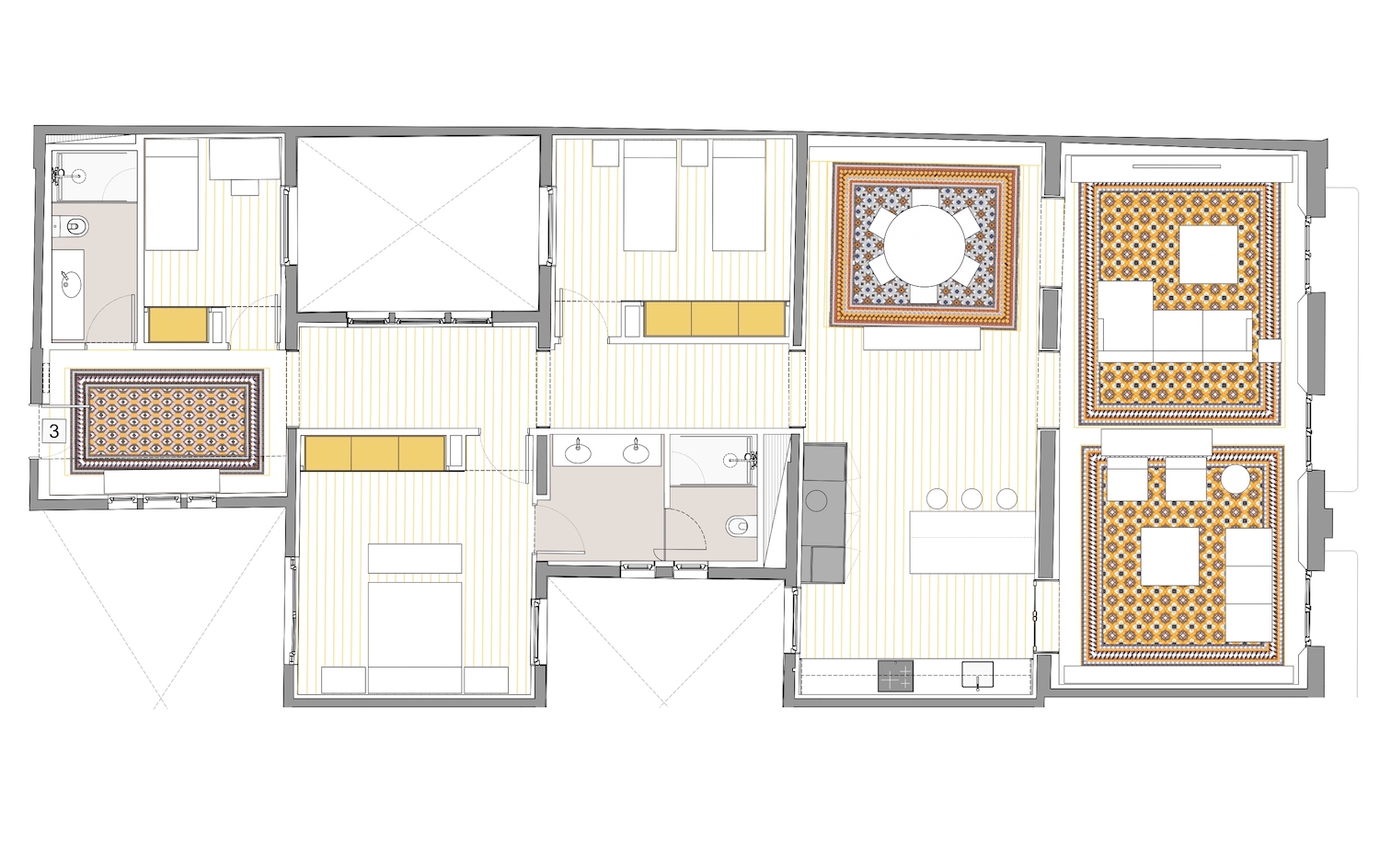 This new-build property is part of an exclusive project in a completely refurbished historic building on Barcelona's Paseo de Gracia, the city's most sought-after avenue and one of the most important in Europe. This is a unique opportunity to live in the centre of the city with maximum comfort and the highest quality materials and finishingss, in a building with terrace and swimming pool. This flat is located on the 1st floor and has 217 built interior sqm with a 30 sqm private terrace. The entrance hall divides the day and night areas on both sides. The day area is a large continuous room in which each area occupies its own differentiated space. The 34 sqm living room has access to 2 balconies facing Paseo de Gracia, with its magnificent urban and architectural views. This communicates with a dining room that leads to the semi-open-plan kitchen, fully equipped with high-end household appliances, which has an adjoining laundry room. A hallway from the entrance hall leads to the night area. The master suite has its own bathroom with bathtub and access to the terrace, a quiet and relaxing place facing the inner courtyard where you can enjoy the outdoors. There is also another bedroom en suite. All the bedrooms have built-in wardrobes. Finally, there is a separate bathroom with bathtub and a toilet. The communal terrace on the top of the building is an oasis above the bustle of the big city, full of plants, tables, sofas and sun loungers. It's the perfect place for the most distinguished meetings with privileged views of the city center and Gaudi's Casa Batllo, to relax or to enjoy the swimming pool. The building has an elevator, concierge and 24-hour security. In the luxury renovation of the property, the best materials, detailed finishes and premium design have been used. In short, the highest quality standards to combine the elegance of tradition and the functionality of the present. The property offers the buyer an interior designer to assist in any change of furniture and / or work for an alternative layout (examples with 4 and 3 bedrooms are proposed) that you want to undertake. The location of this property on Paseo de Gracia is simply unbeatable. You will be able to enjoy the neuralgic and financial center of the city, its wide variety of restaurants and boutiques of top brands, its cultural and architectural charms, and excellent communication by public transport. Do not hesitate to contact Bcn Advisors to know more about this apartment and the rest of the properties that are still available in the building.