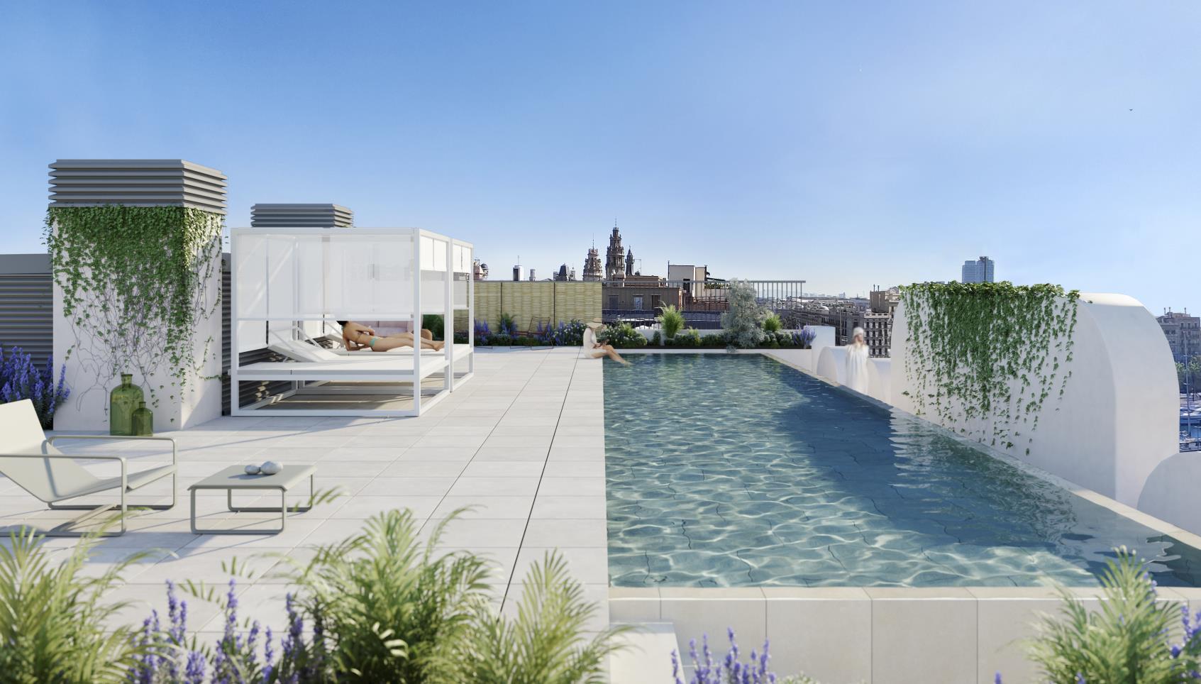 The building has an impressive communal terrace with solarium area and swimming pool. It’s located in a neuralgic point of Barcelona. On the one hand, it is very close to Las Ramblas, one of the most popular thoroughfares in the city, and the Gran Teatre del Liceu. Ease of communication is guaranteed with the nearby Estació de França and the maritime terminals, numerous bus and metro lines, a large public car park and access to the Ronda Litoral which connects to the airport.