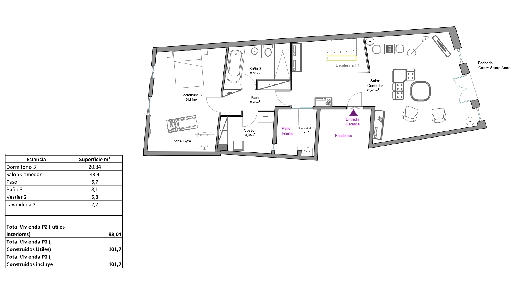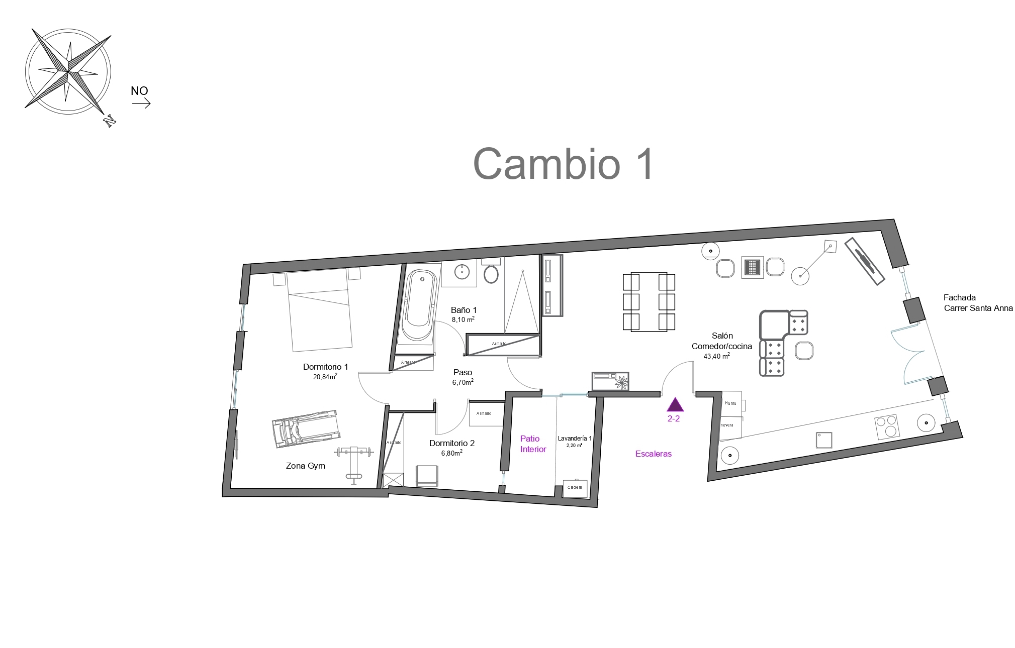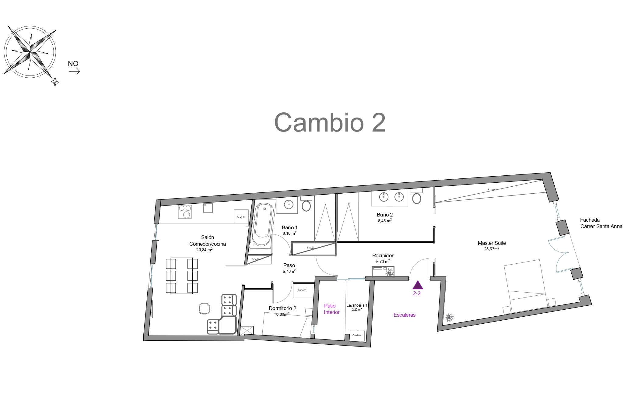 The property has 101 built interior sqm. The living room is very cosy with views of the street and a gallery overlooking the building’s interior courtyard. Then there is a hallway with built-in wardrobes that leads to the master bedroom, with views of an interior block courtyard and plenty of natural light. On either side of the hallway there is a bathroom with a bath and shower and a room used as a dressing room with more wardrobes. However, there is the possibility of creating two bedrooms and two bathrooms (see renovation proposals in the plans).