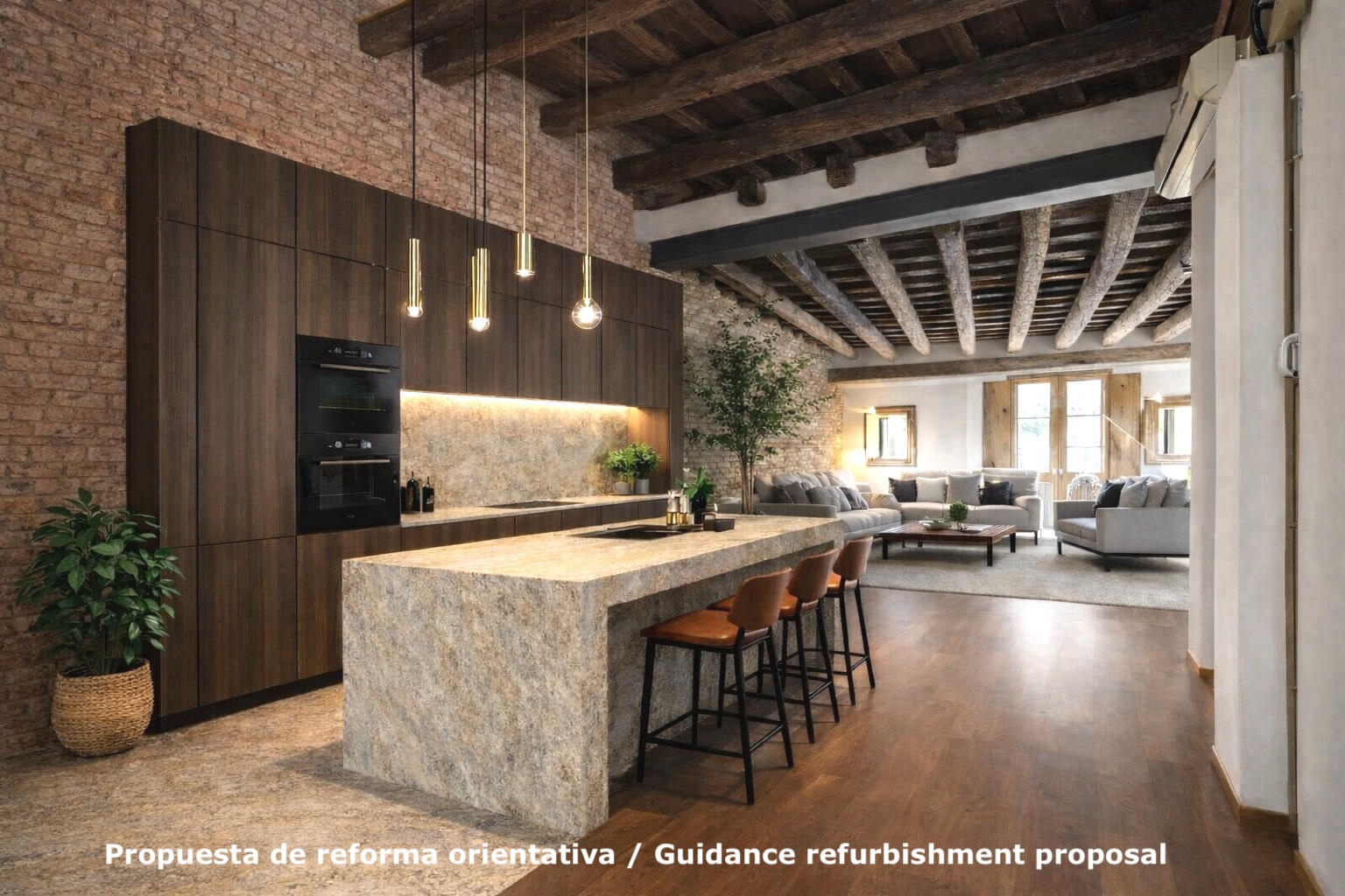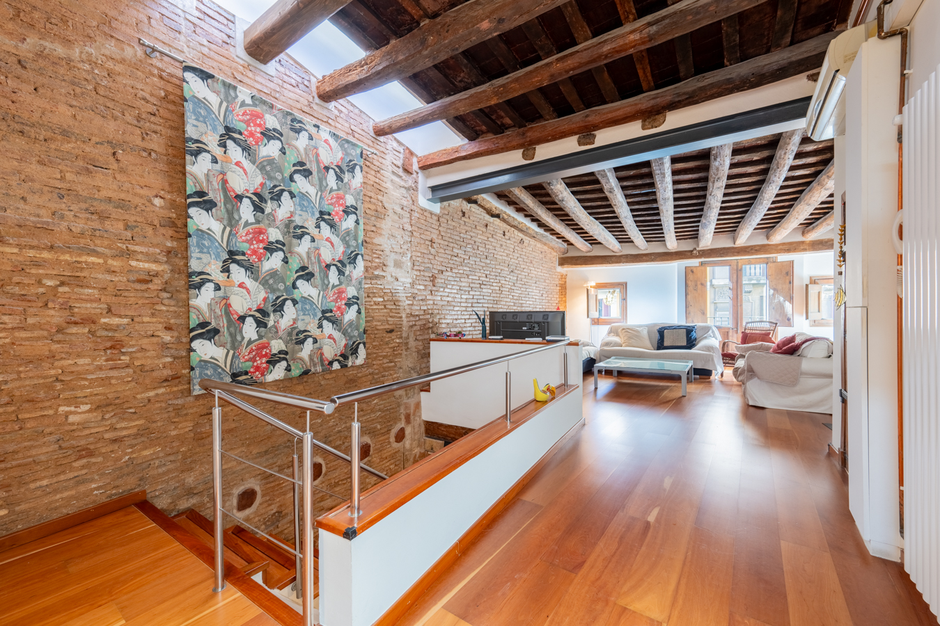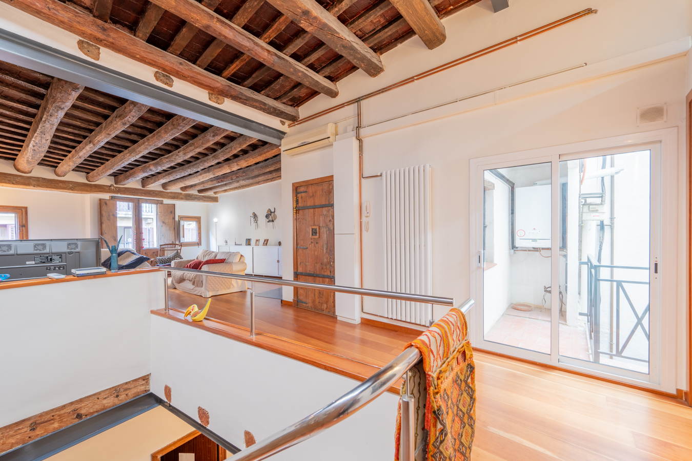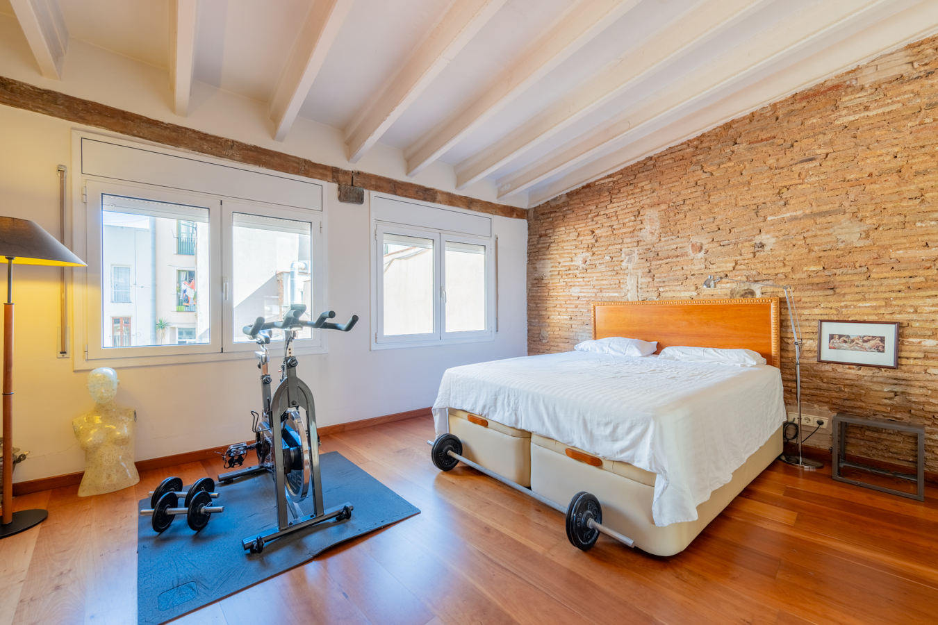This exceptional, newly renovated property is located on one of the most peaceful and charming pedestrian streets in the Gothic Quarter, where Mediterranean light, contemporary design and the historical essence of Barcelona combine in perfect harmony. It is just a few minutes from Soho House Barcelona and the seafront, with numerous shops, services and public transport in the surrounding area. Located on the fourth and top floor of a renovated building with no lift, the flat enjoys double orientation, ensuring natural light throughout the day and a remarkable sense of tranquillity. The open views and the presence of two pleasant interior courtyards reinforce the calm and comfort, something unusual in this area of the city. The renovation has been designed with a clear intention: to open up the spaces, enhance the light and create a fluid home, designed for both everyday use and sharing moments with guests, without sacrificing privacy. The heart of the home is an open-plan space that integrates the living room, dining room and kitchen, ideal for long after-dinner conversations, spontaneous gatherings and an active social life. The microcement floors, combined with original reclaimed mosaics, add character and personality, maintaining a sober and timeless aesthetic. The kitchen is fully equipped with appliances, including a wine refrigerator. The flat currently has one bright and cosy bedroom with built-in wardrobes and custom-designed furniture, as well as a unique porthole window that visually connects with the living area and enhances the feeling of spaciousness. There is the option of creating a second bedroom (see second floor plan with the proposal). The property is sold furnished. It preserves and enhances original features such as exposed beams, woodwork and hydraulic tiles, which dialogue with an elegant and balanced contemporary style. The recessed lighting, the selection of high-quality materials and the attention to detail reflect a careful and coherent renovation. A property designed for those who want to experience the pulse of the city and, at the same time, come home to light, silence and beauty. For those who value well-designed spaces, quality materials and the possibility of enjoying their home with friends, without sacrificing tranquillity or privacy.