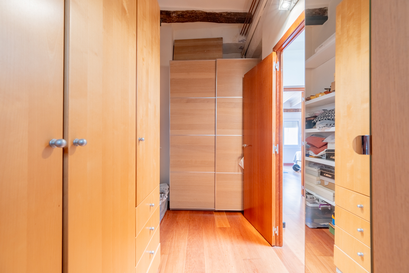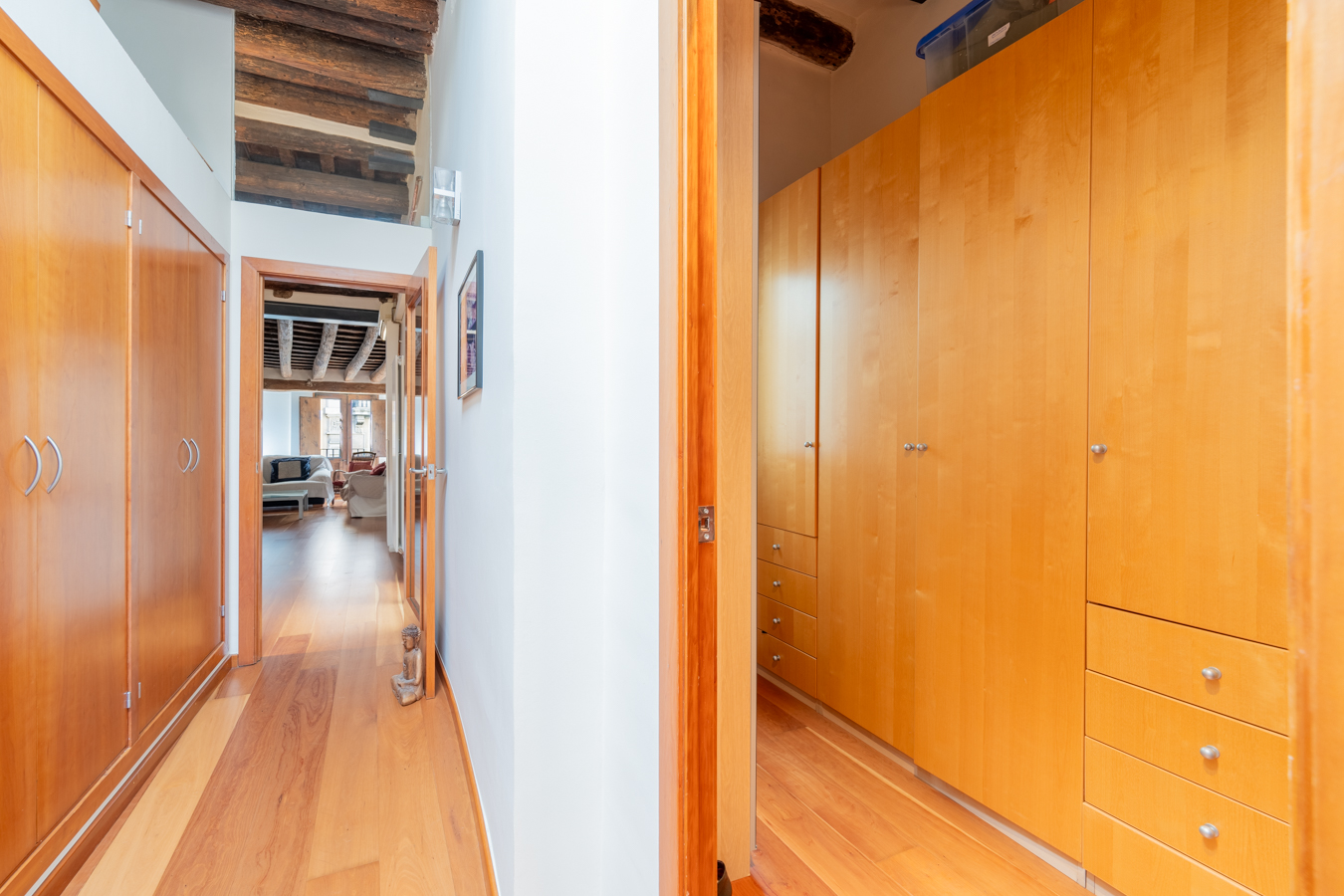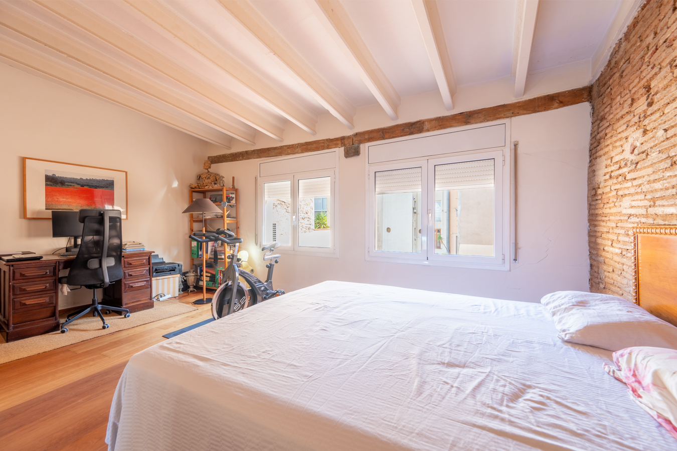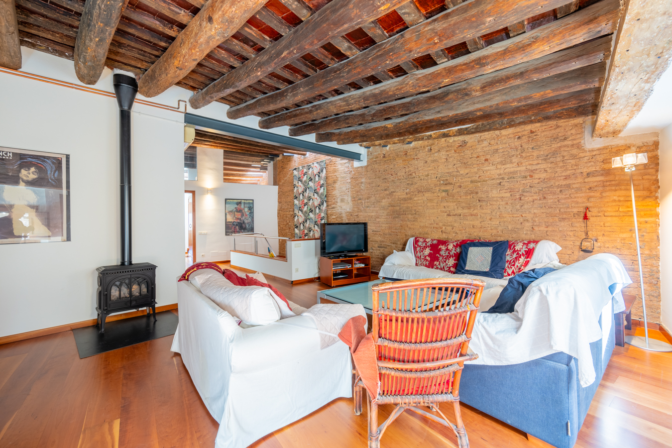 This exceptional, newly renovated property is located on one of the most peaceful and charming pedestrian streets in the Gothic Quarter, where Mediterranean light, contemporary design and the historical essence of Barcelona combine in perfect harmony. It is just a few minutes from Soho House Barcelona and the seafront, with numerous shops, services and public transport in the surrounding area. Located on the fourth and top floor of a renovated building with no lift, the flat enjoys double orientation, ensuring natural light throughout the day and a remarkable sense of tranquillity. The open views and the presence of two pleasant interior courtyards reinforce the calm and comfort, something unusual in this area of the city. The renovation has been designed with a clear intention: to open up the spaces, enhance the light and create a fluid home, designed for both everyday use and sharing moments with guests, without sacrificing privacy. The heart of the home is an open-plan space that integrates the living room, dining room and kitchen, ideal for long after-dinner conversations, spontaneous gatherings and an active social life. The microcement floors, combined with original reclaimed mosaics, add character and personality, maintaining a sober and timeless aesthetic. The kitchen is fully equipped with appliances, including a wine refrigerator. The flat currently has one bright and cosy bedroom with built-in wardrobes and custom-designed furniture, as well as a unique porthole window that visually connects with the living area and enhances the feeling of spaciousness. There is the option of creating a second bedroom (see second floor plan with the proposal). The property is sold furnished. It preserves and enhances original features such as exposed beams, woodwork and hydraulic tiles, which dialogue with an elegant and balanced contemporary style. The recessed lighting, the selection of high-quality materials and the attention to detail reflect a careful and coherent renovation. A property designed for those who want to experience the pulse of the city and, at the same time, come home to light, silence and beauty. For those who value well-designed spaces, quality materials and the possibility of enjoying their home with friends, without sacrificing tranquillity or privacy.