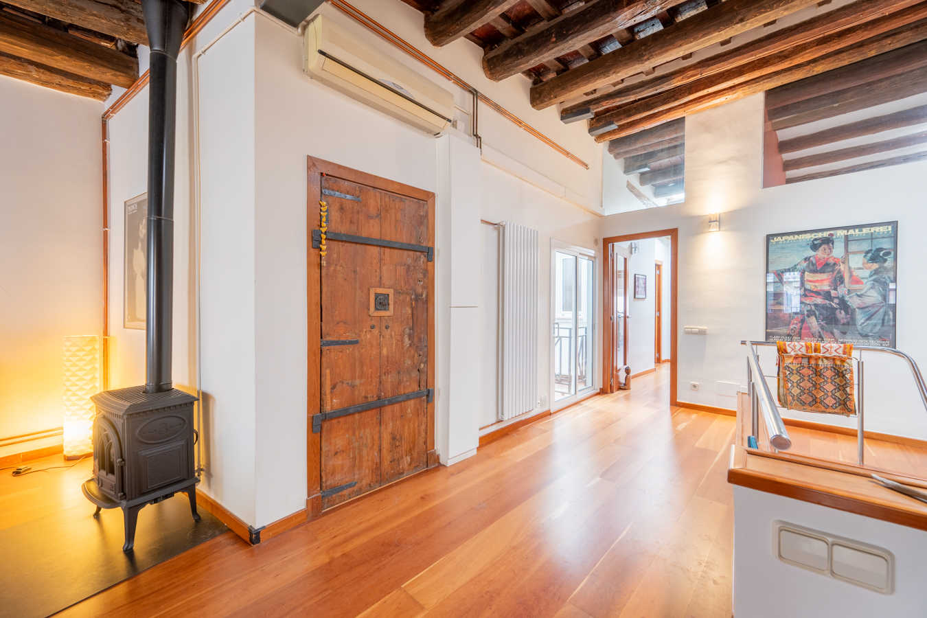 This property retains original features, such as 18th-century wooden ceilings combined with skylights that allow natural light to enter. The property is equipped with wooden floors, radiator heating and split air conditioning. It’s on the real 3rd floor of a building without a lift.