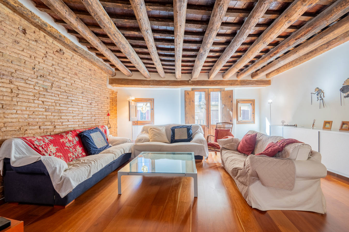 This beautiful flat maintains the charm of its original features such as the very high ceilings with restored Catalan vault with wooden beams and exposed brick walls. It's located in the heart of the historic centre of Barcelona, surrounded by its historic streets and squares, close to Plaza Real and Paseo Colón. The property has 110 built sqm and is on the first floor. The living-dining room is spacious and overlooks a large square, which provides a wonderful open view and plenty of natural light. It also has a balcony. The kitchen is semi-open and is equipped with household appliances. The night area has 2 double bedrooms that open onto large lightwells, so they are very quiet. There is also a bathroom with two sinks and a bathtub. This flat was refurbished about 10 years ago, restoring the ceilings and the brickwork on the walls. It has parquet floors and heating by gas radiators. The building has an approved plan for the installation of a lift, the costs of which will be borne by the current owner. This apartment is an excellent investment opportunity, as it rents for around 1.500 €/month. As well as to live in a historic environment in Barcelona with all the services and shops in the surroundings, with proximity to the city centre and excellently connected by public transport. Do not hesitate to contact Bcn Advisors to visit this flat.