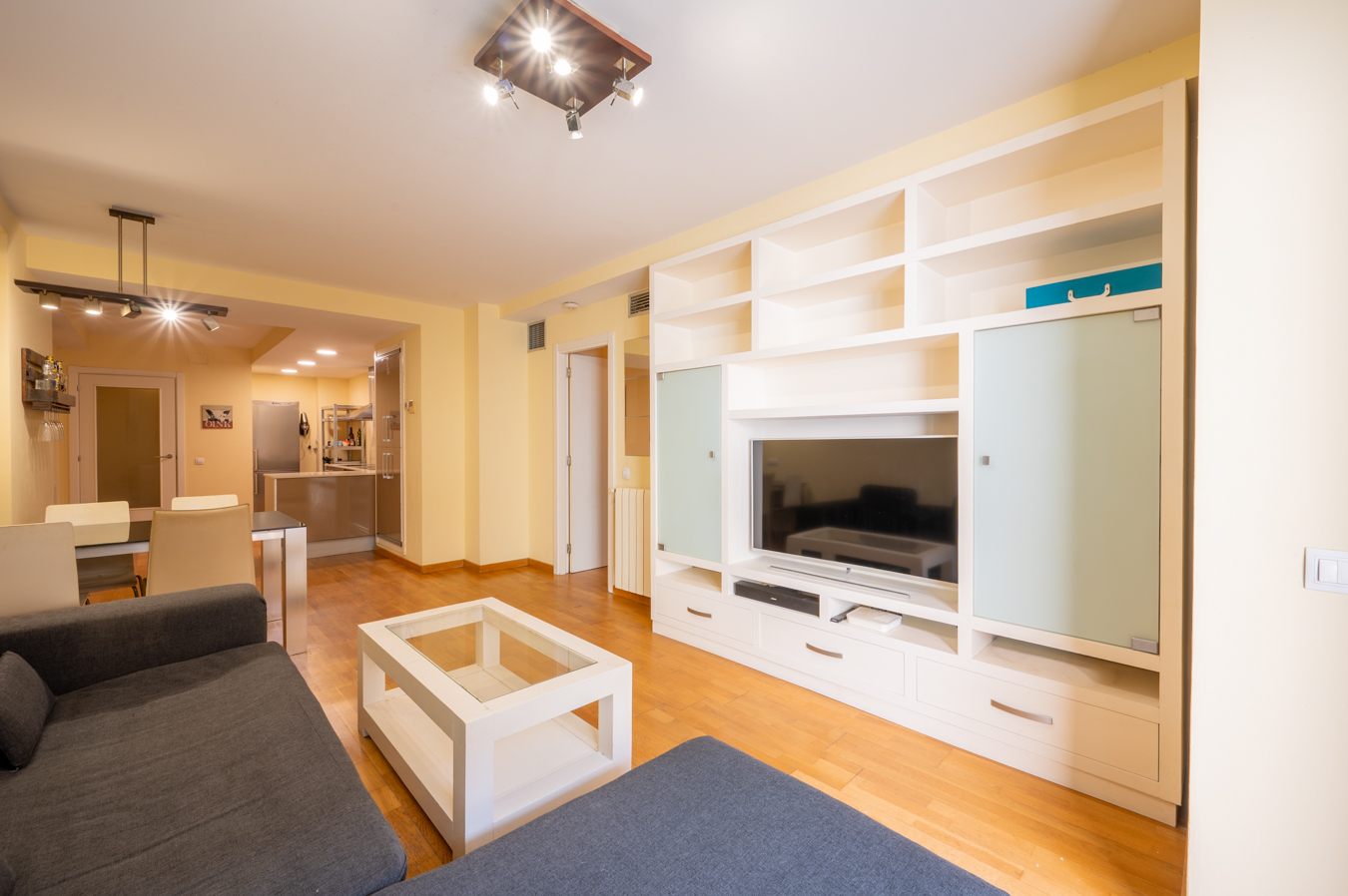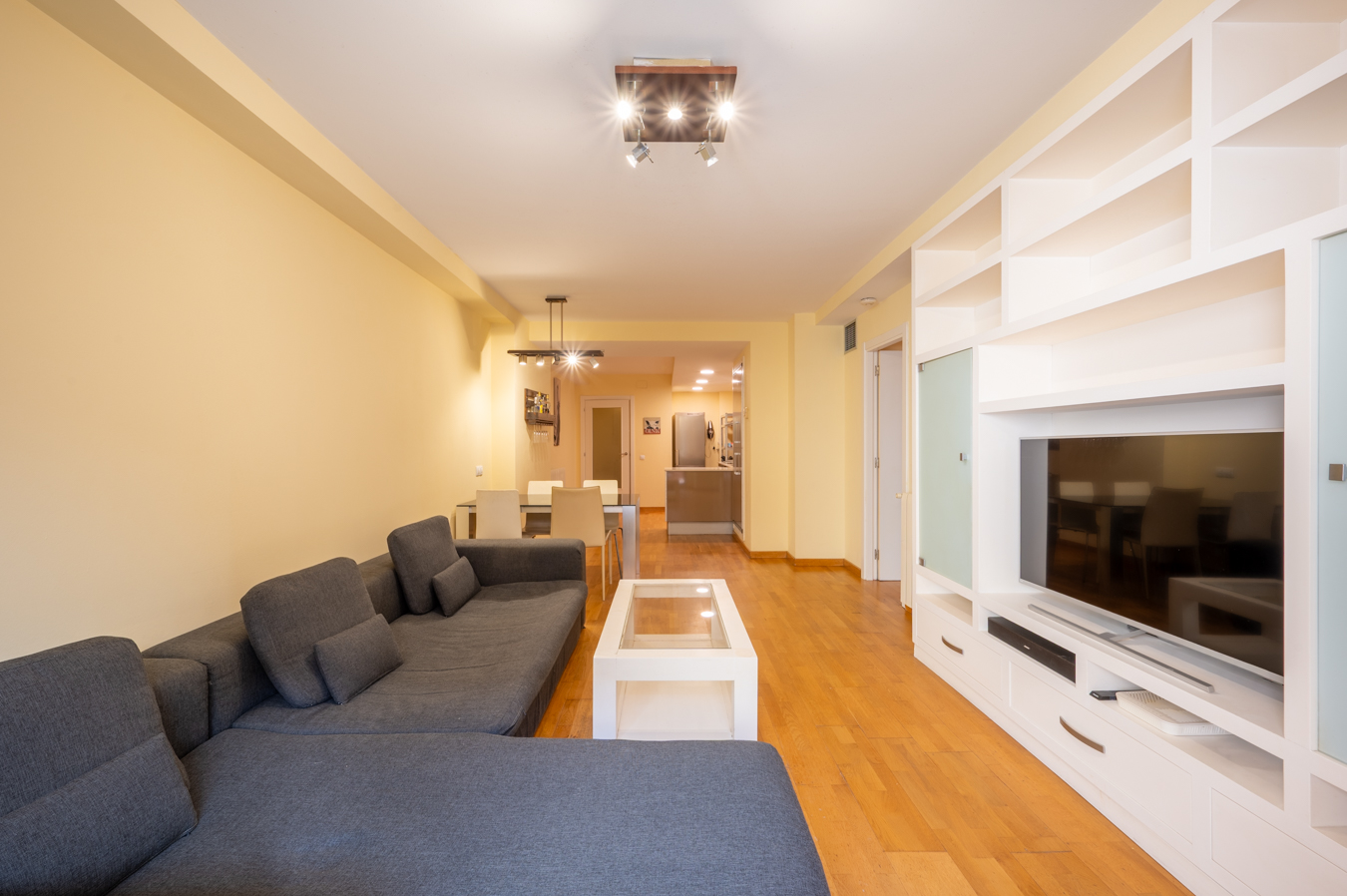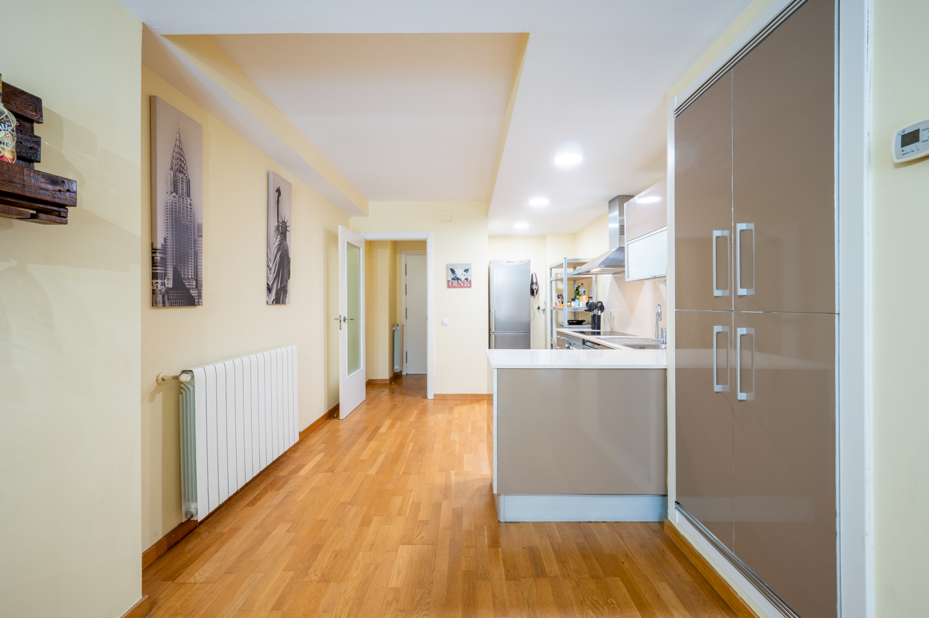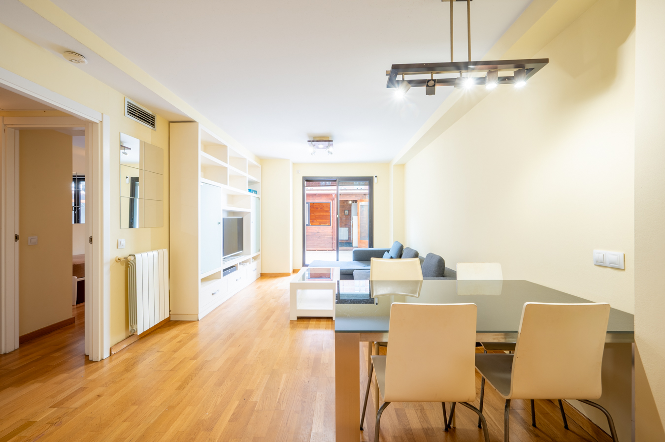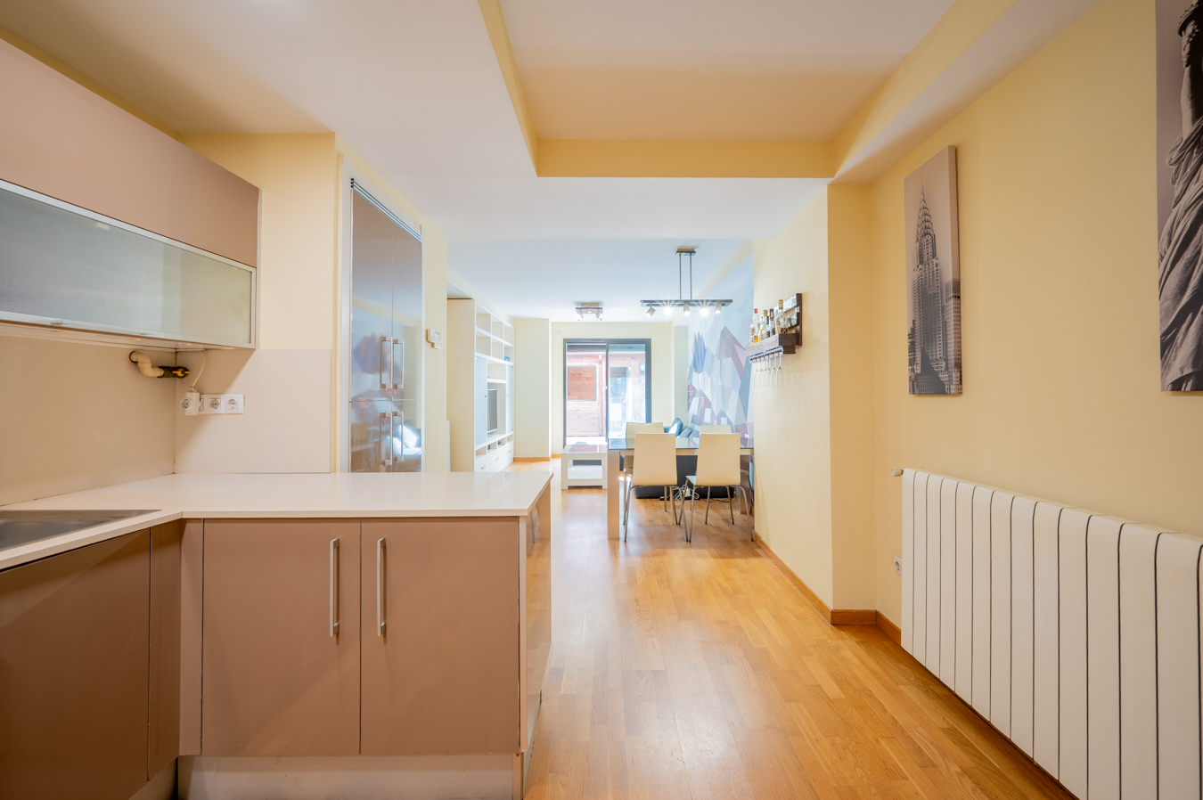 The property has 83.5 built interior sqm and 2 bedrooms. It’s on the first floor of a building with a lift. It’s very quiet and peaceful, as it overlooks the interior courtyard between buildings. An entrance hall welcomes us and leads directly to the living area, which is a spacious living-dining room with an open-plan kitchen.