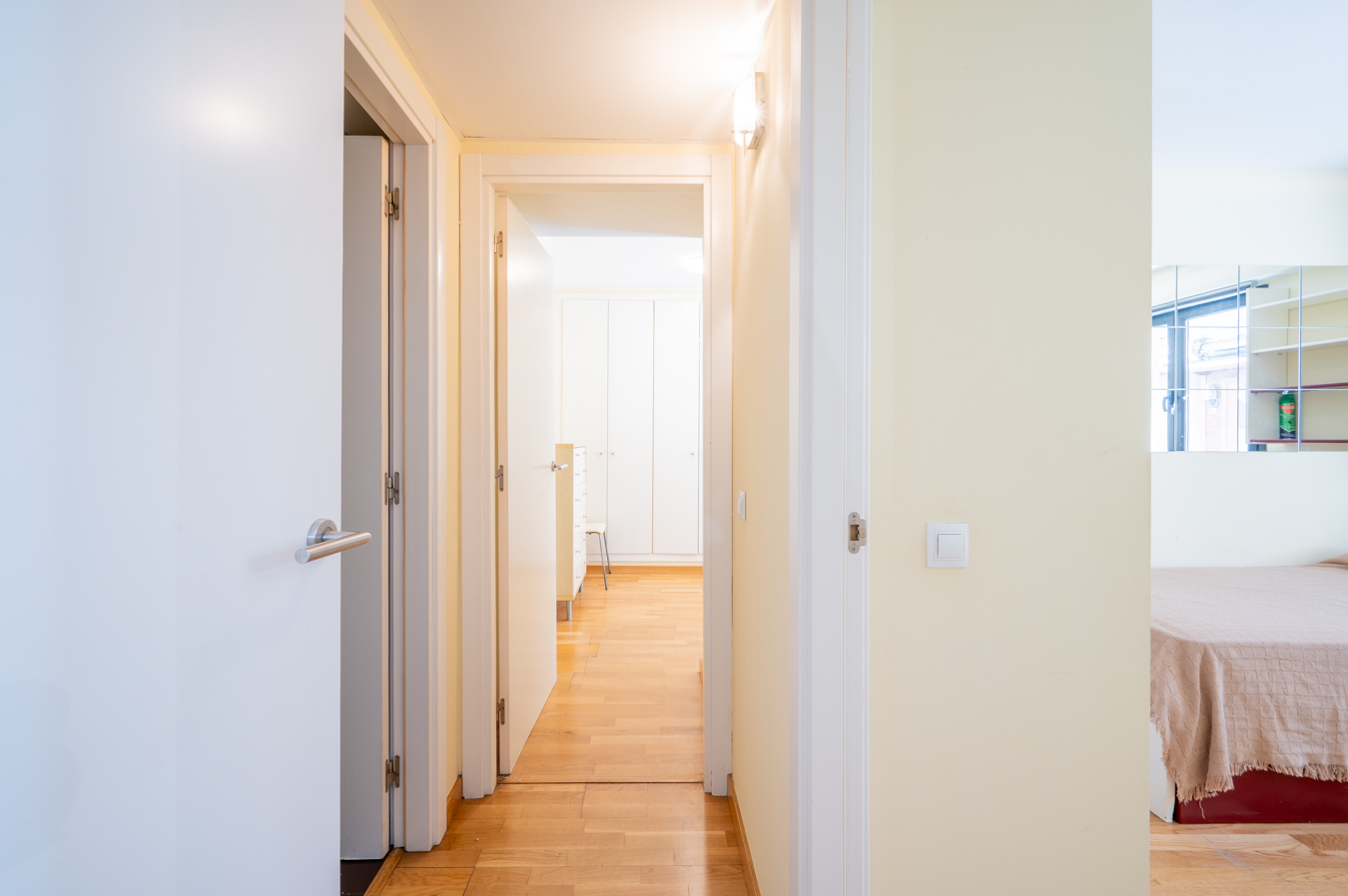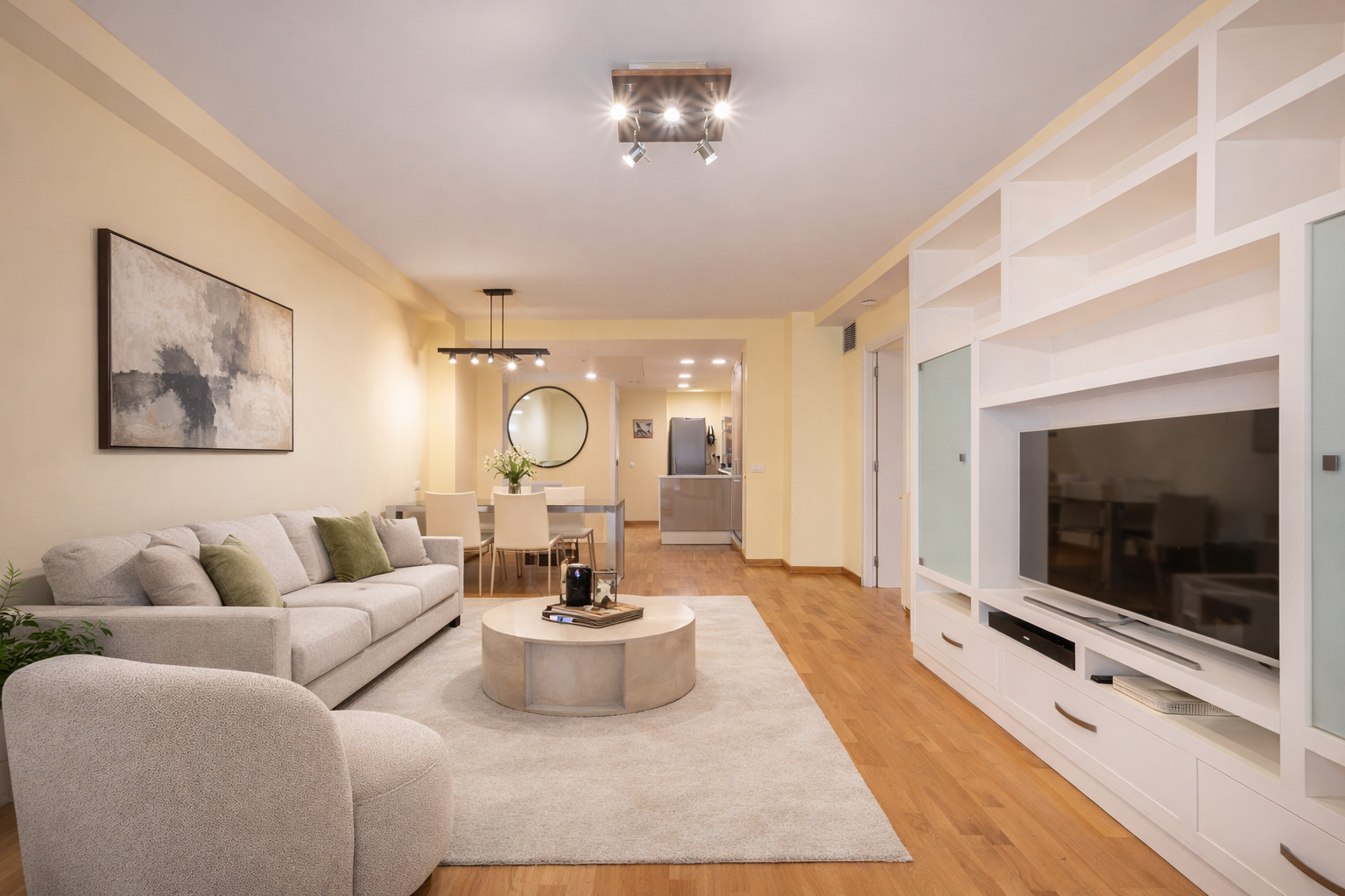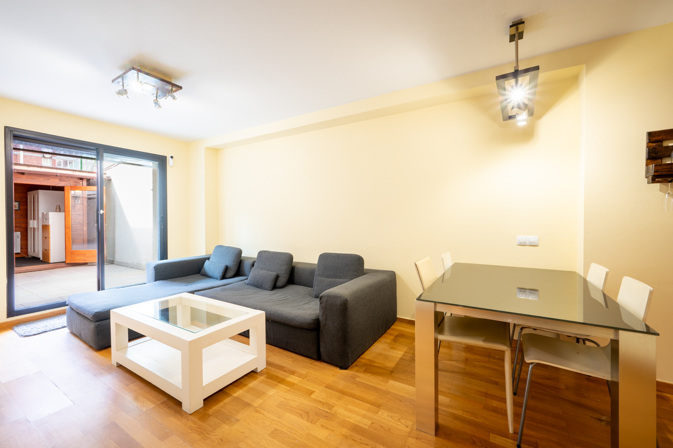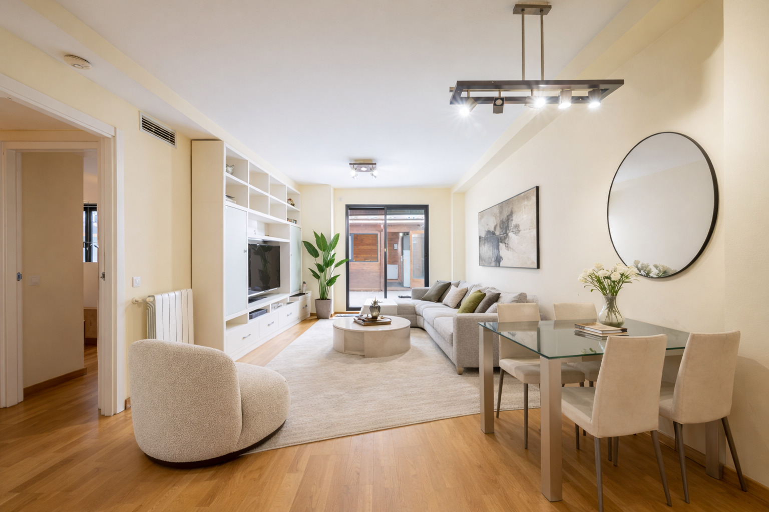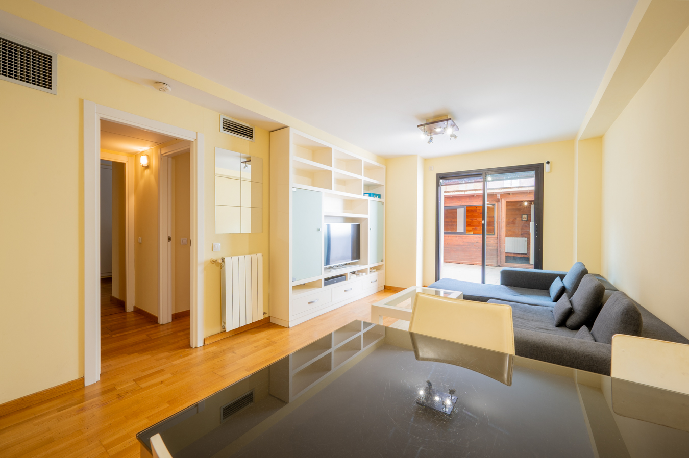 The property has 83.5 built interior sqm and 2 bedrooms. It’s on the first floor of a building with a lift. It’s very quiet and peaceful, as it overlooks the interior courtyard between buildings. An entrance hall welcomes us and leads directly to the living area, which is a spacious living-dining room with an open-plan kitchen.