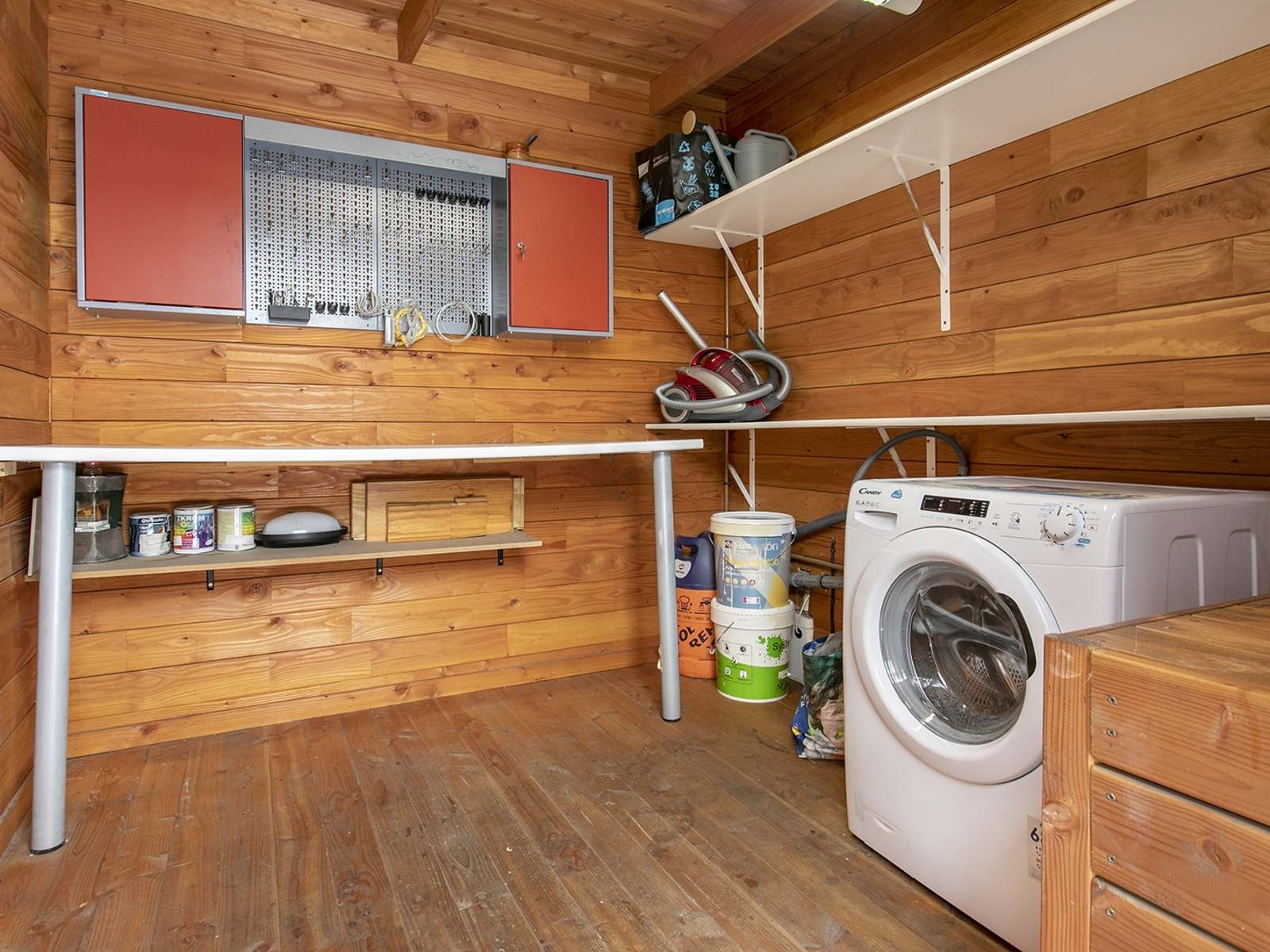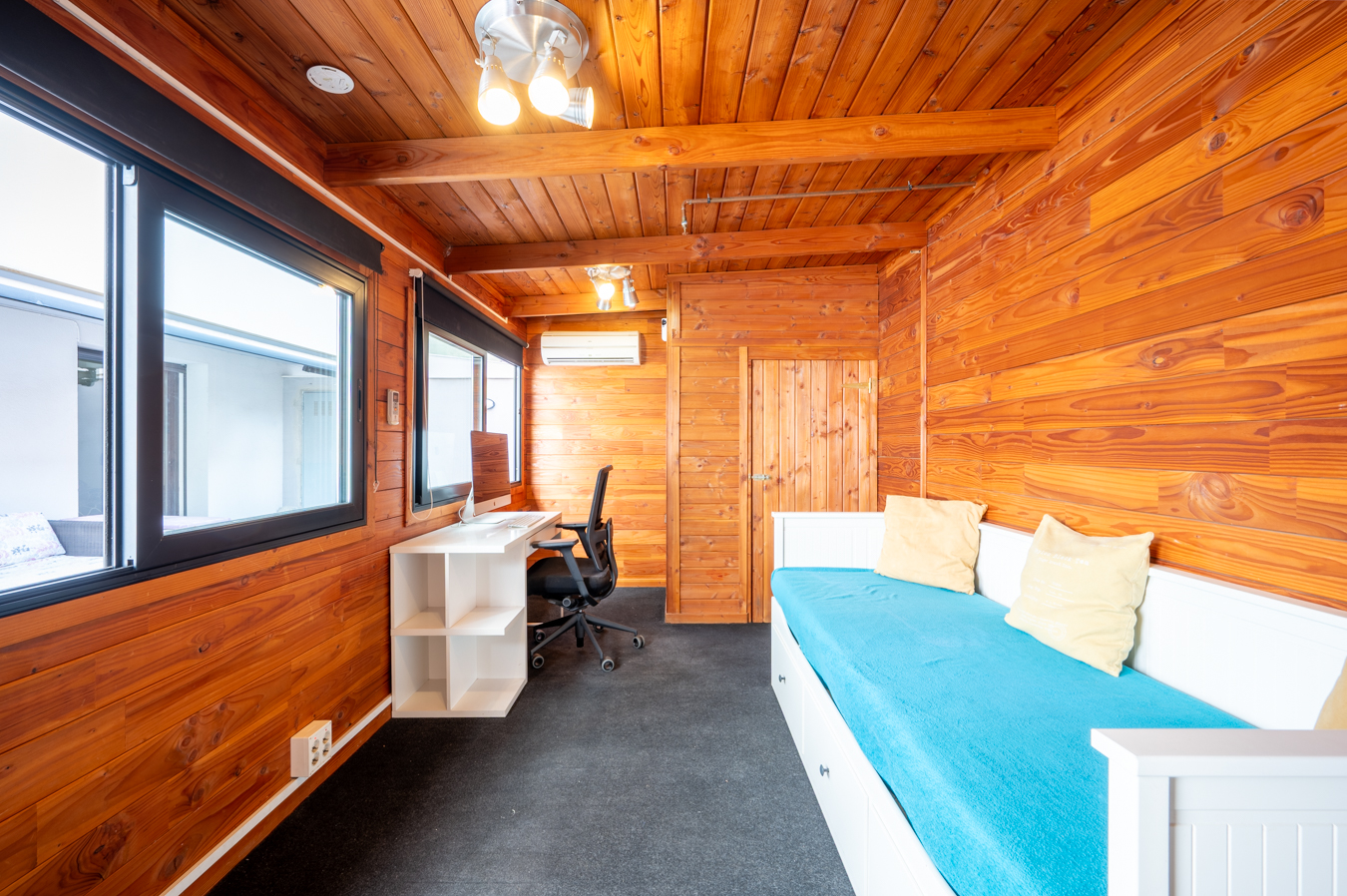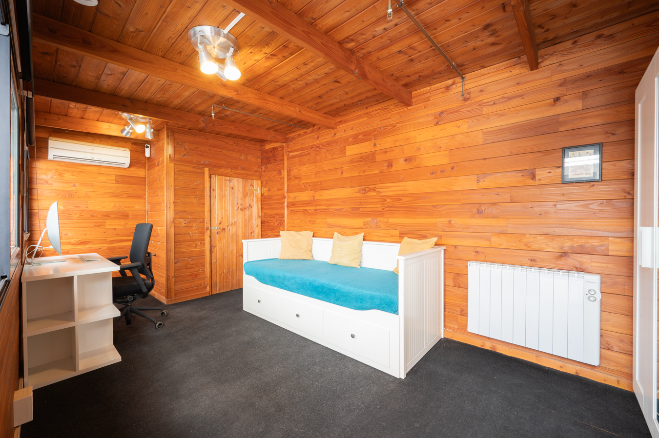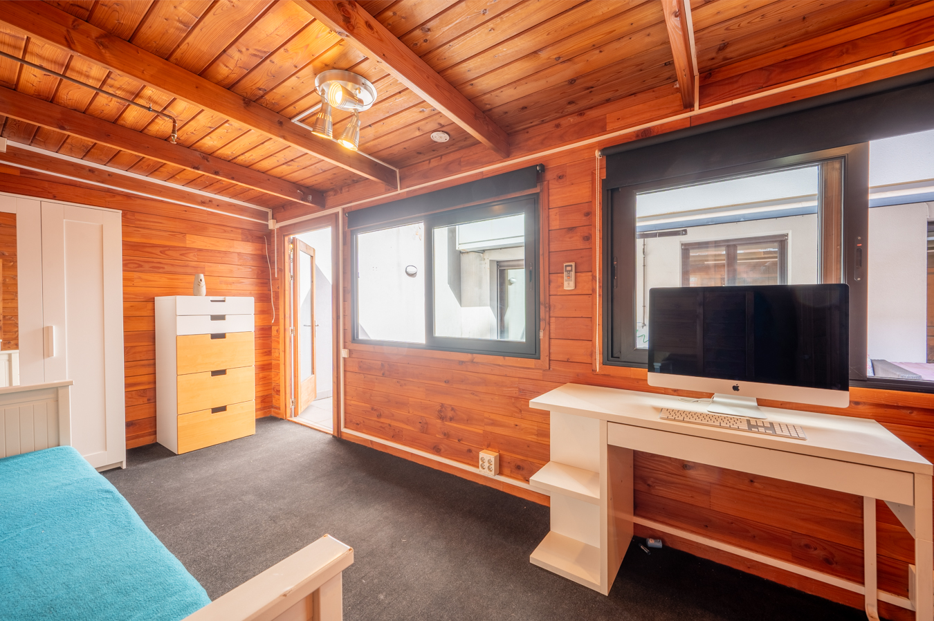 The living room has direct access to the terrace, the oerfect place to eat, meet or relax outdoors. Currently, there’s a 25 sqm shed installed here, included in the price. It is very practical as an additional room, office, games room or even a guest room. It has its own WC, air conditioning and laundry/storage area. Through a door on the terrace, a ramp leads to the communal area of the building, with a terrace and communal swimming pool to enjoy on summer days.