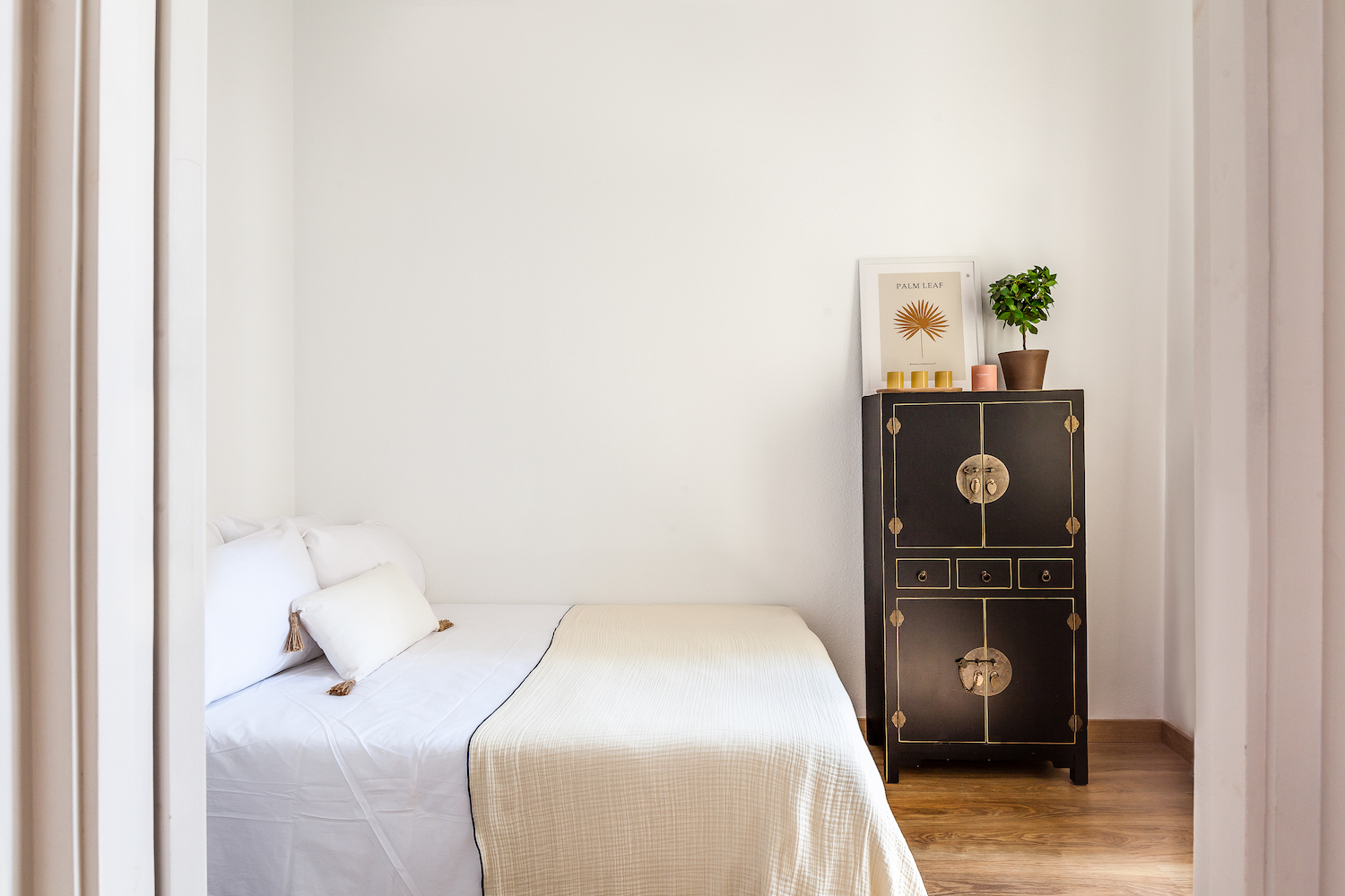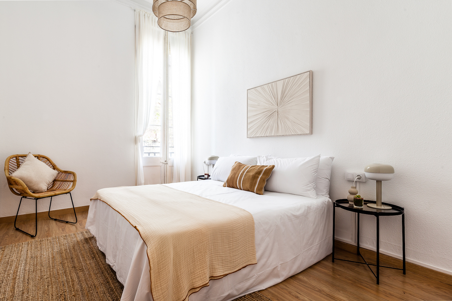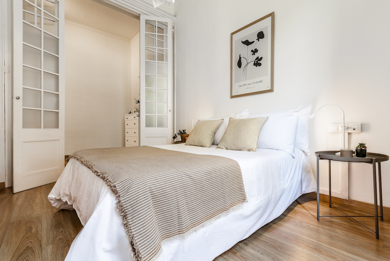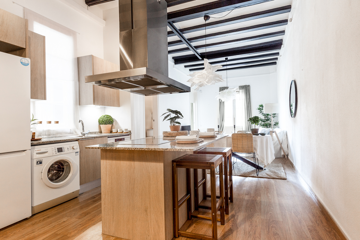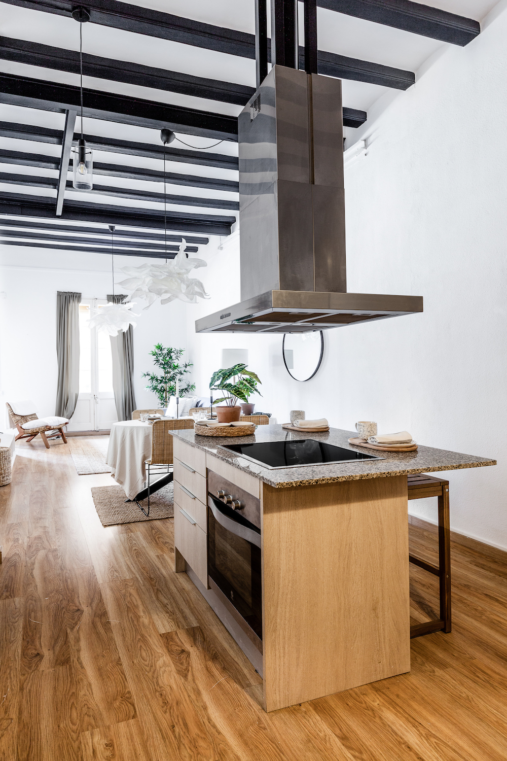 This exceptional, newly renovated property is located on one of the most peaceful and charming pedestrian streets in the Gothic Quarter, where Mediterranean light, contemporary design and the historical essence of Barcelona combine in perfect harmony. It is just a few minutes from Soho House Barcelona and the seafront, with numerous shops, services and public transport in the surrounding area. Located on the fourth and top floor of a renovated building with no lift, the flat enjoys double orientation, ensuring natural light throughout the day and a remarkable sense of tranquillity. The open views and the presence of two pleasant interior courtyards reinforce the calm and comfort, something unusual in this area of the city. The renovation has been designed with a clear intention: to open up the spaces, enhance the light and create a fluid home, designed for both everyday use and sharing moments with guests, without sacrificing privacy. The heart of the home is an open-plan space that integrates the living room, dining room and kitchen, ideal for long after-dinner conversations, spontaneous gatherings and an active social life. The microcement floors, combined with original reclaimed mosaics, add character and personality, maintaining a sober and timeless aesthetic. The kitchen is fully equipped with appliances, including a wine refrigerator. The flat currently has one bright and cosy bedroom with built-in wardrobes and custom-designed furniture, as well as a unique porthole window that visually connects with the living area and enhances the feeling of spaciousness. There is the option of creating a second bedroom (see second floor plan with the proposal). The property is sold furnished. It preserves and enhances original features such as exposed beams, woodwork and hydraulic tiles, which dialogue with an elegant and balanced contemporary style. The recessed lighting, the selection of high-quality materials and the attention to detail reflect a careful and coherent renovation. A property designed for those who want to experience the pulse of the city and, at the same time, come home to light, silence and beauty. For those who value well-designed spaces, quality materials and the possibility of enjoying their home with friends, without sacrificing tranquillity or privacy.
