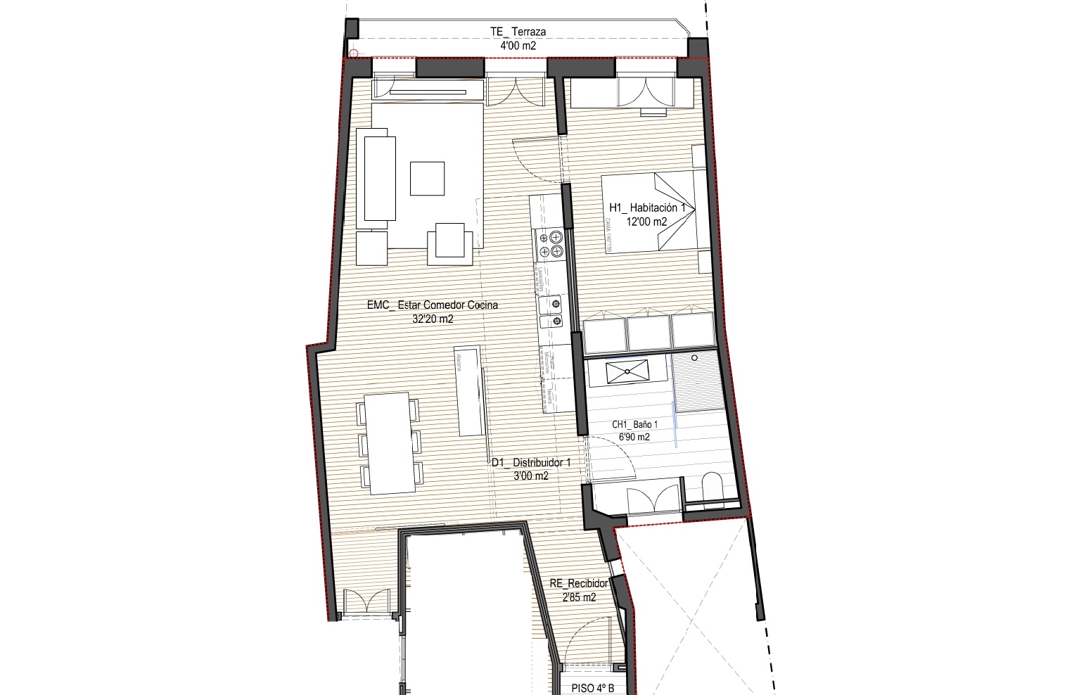 The apartment maintains original elements such as Catalan vault and beams in the ceiling. It’s equipped with parquet floors.