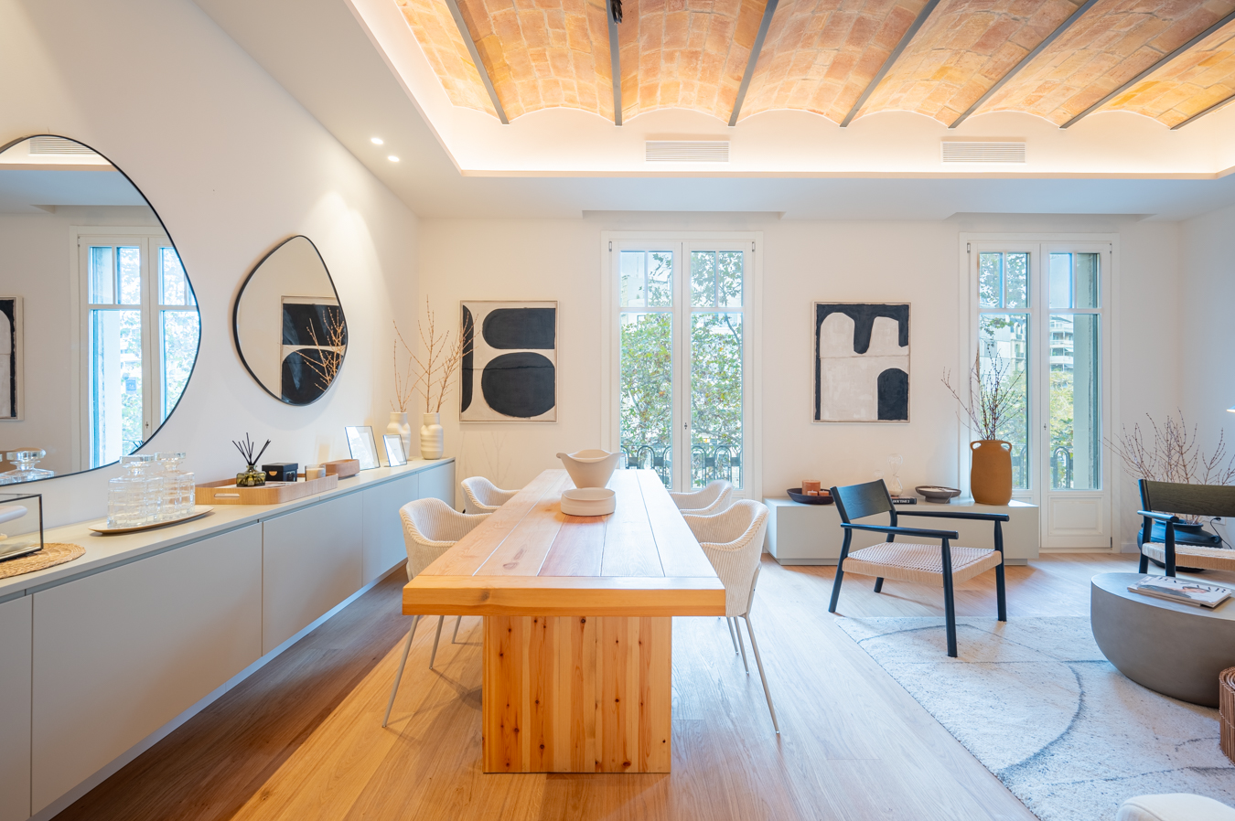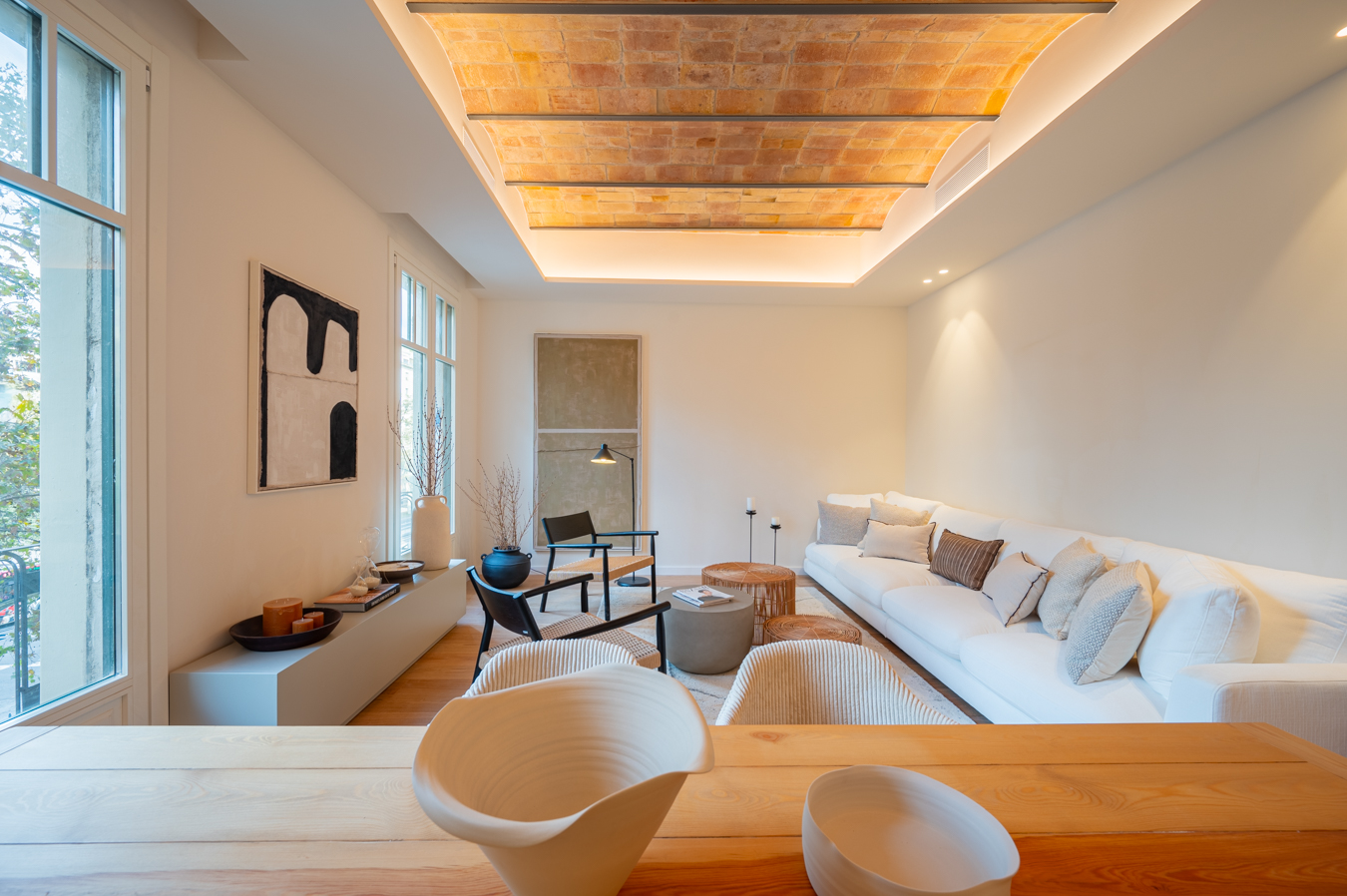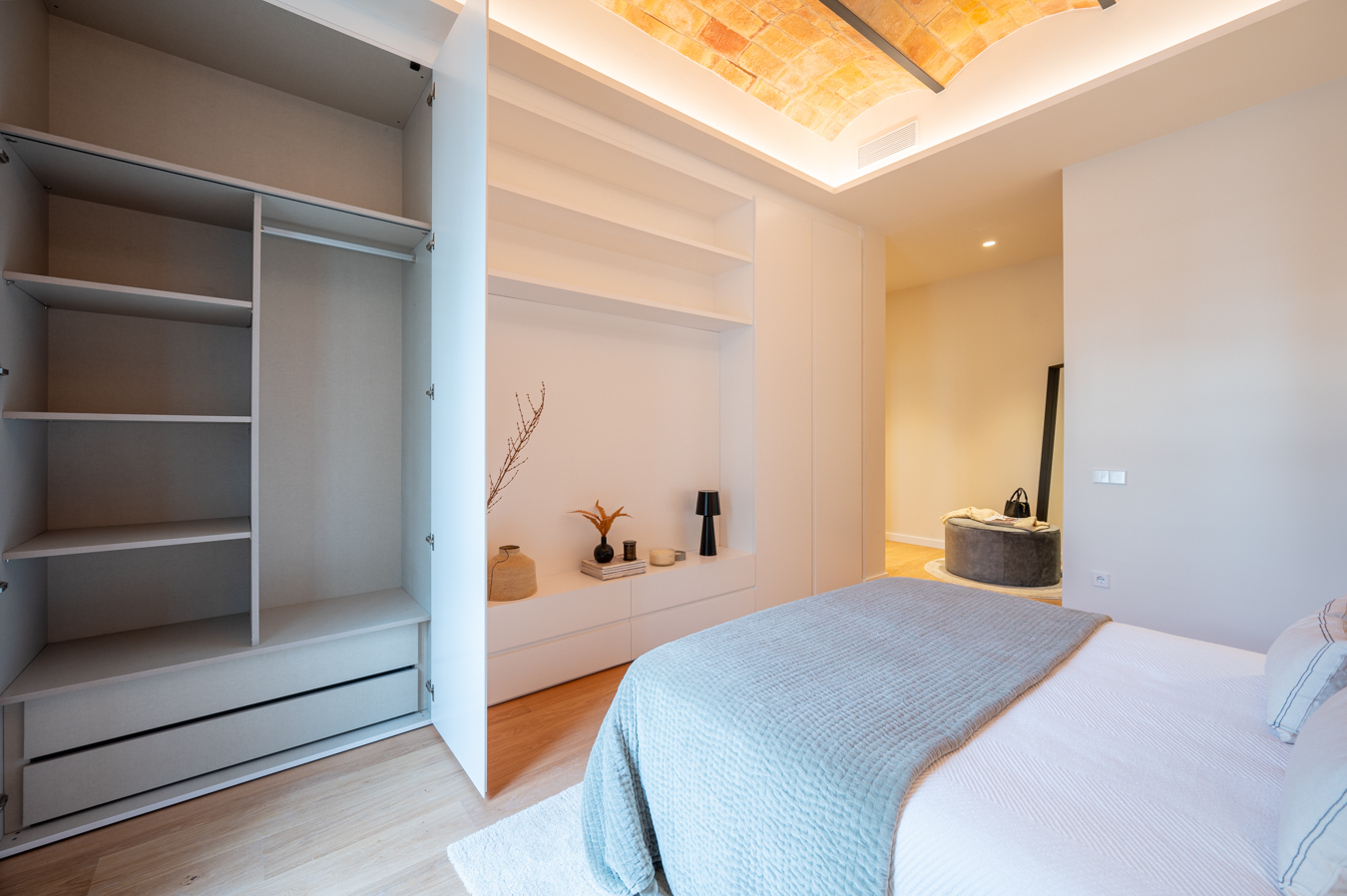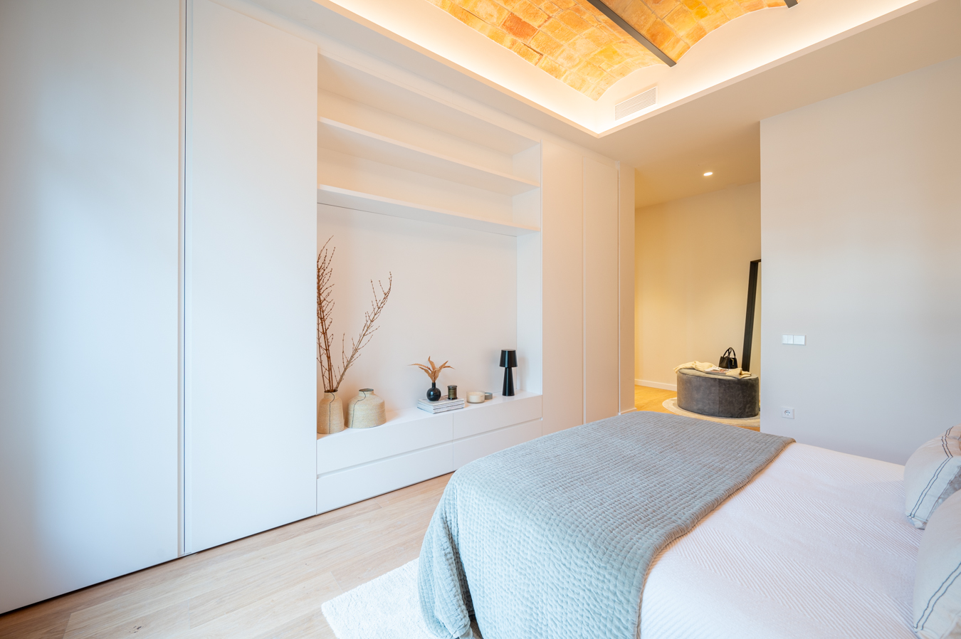 The flat has the highest quality materials and finishings, as well as an interior design with attention to detail that will combine the classic elements of the regal estate buildings with the most modern. Large spaces and brightness will be important, achieving a balance between traditional elements such as the restored Catalan vaulted ceilings and the comfort and amenities of a new building: underfloor heating and hot-cold air conditioning powered by aerothermics (the latest technology in air conditioning systems that produces energy savings of between 60% and 70% compared to conventional systems), top-of-the-range Siemens appliances, natural wood parquet floors, entrance door with security lock, built-in wardrobes, porcelain tiling on the bathroom walls, Italian designer taps, LED lighting, fibre optic connection, Internet and TV signal sockets, etc.