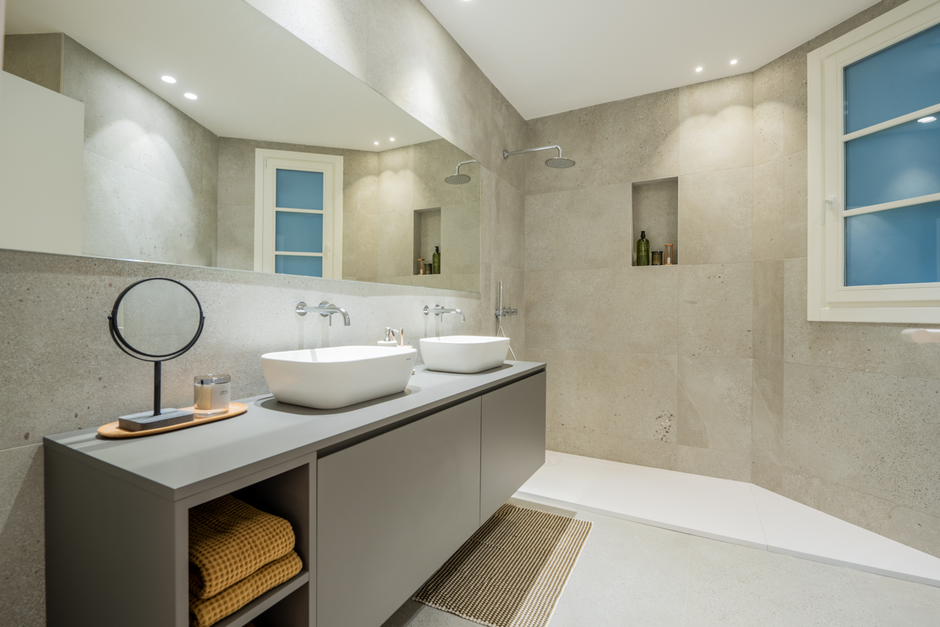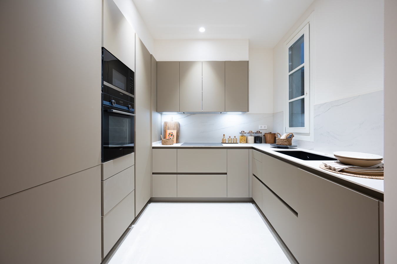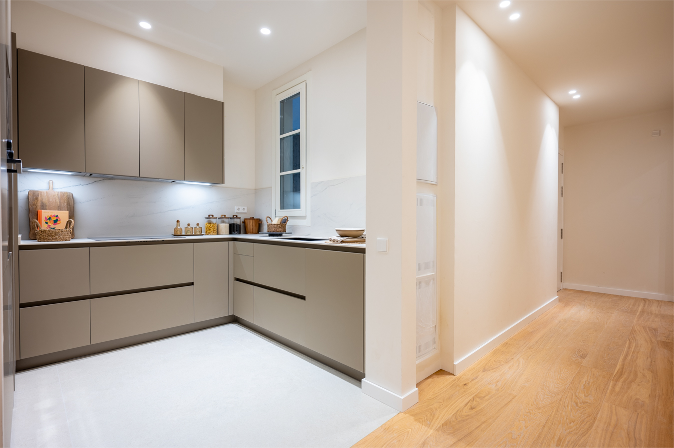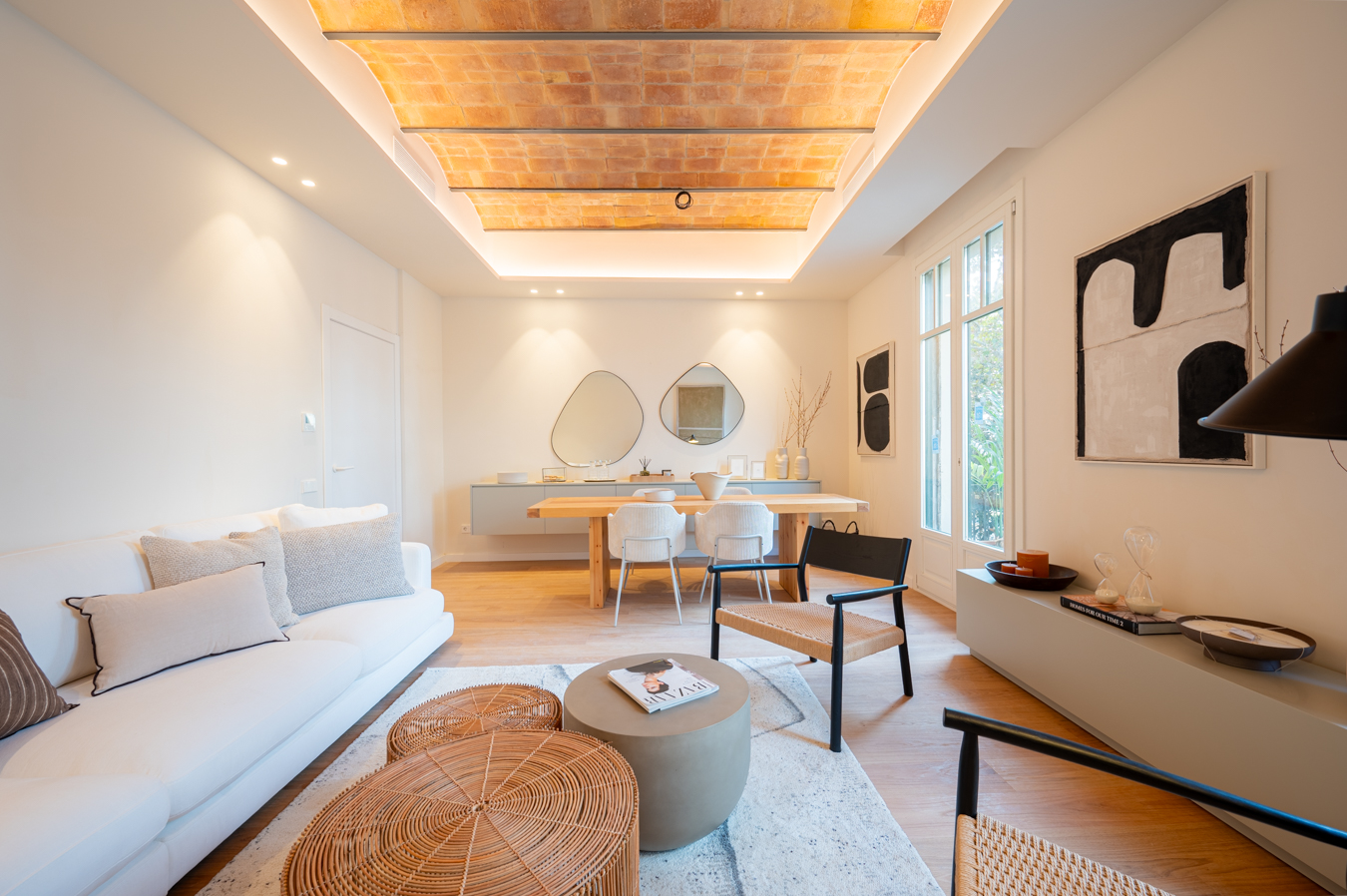 The flat has the highest quality materials and finishings, as well as an interior design with attention to detail that will combine the classic elements of the regal estate buildings with the most modern. Large spaces and brightness will be important, achieving a balance between traditional elements such as the restored Catalan vaulted ceilings and the comfort and amenities of a new building: underfloor heating and hot-cold air conditioning powered by aerothermics (the latest technology in air conditioning systems that produces energy savings of between 60% and 70% compared to conventional systems), top-of-the-range Siemens appliances, natural wood parquet floors, entrance door with security lock, built-in wardrobes, porcelain tiling on the bathroom walls, Italian designer taps, LED lighting, fibre optic connection, Internet and TV signal sockets, etc.