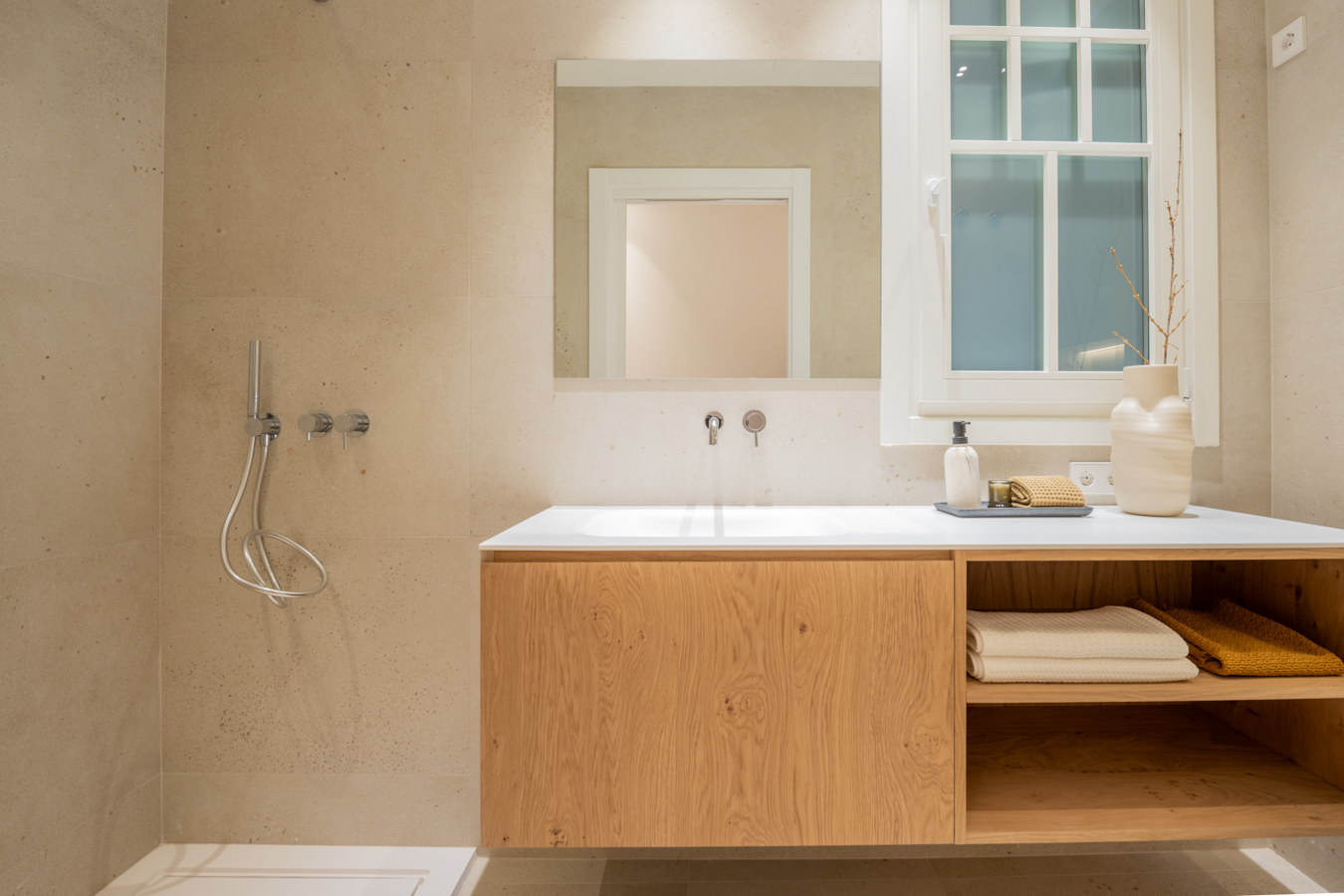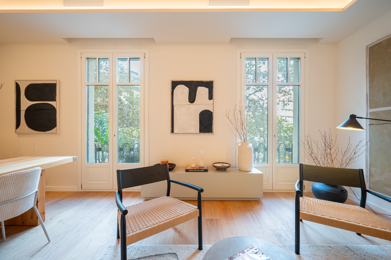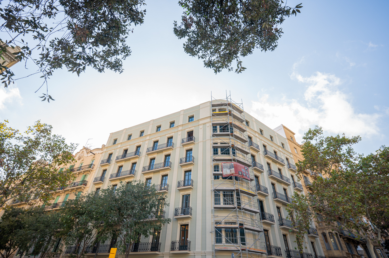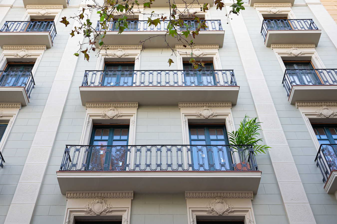 The extensive main façade of the building, as well as the many interior courtyards and the rear façade, provide the building with excellent lighting and ventilation. The unusual distance to the buildings parallel to the façade further enhances the feeling and perception of spaciousness. As this is a modernist building with important historical value, the interior design team has prioritised the recovery of some of the original elements. For example, a complete restoration and rehabilitation of the modernist stuccoes of the staircase core has been carried out; and in the independent vestibules, recovered hydraulic mosaic tiles will be installed to maintain the historical value of the property. In addition, the exterior joinery has been replaced with wooden windows and balconies with thermal break and laminated insulating glass.