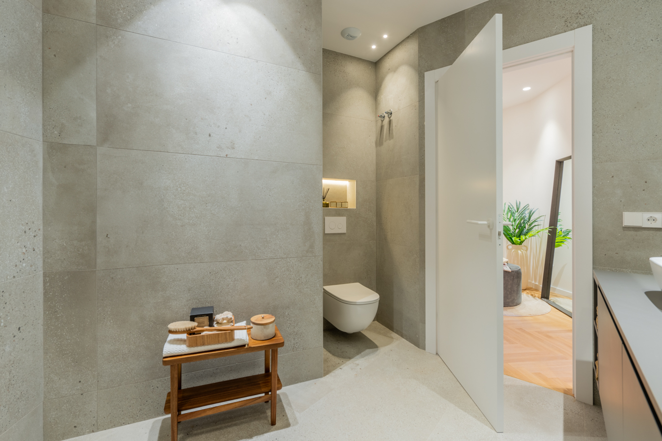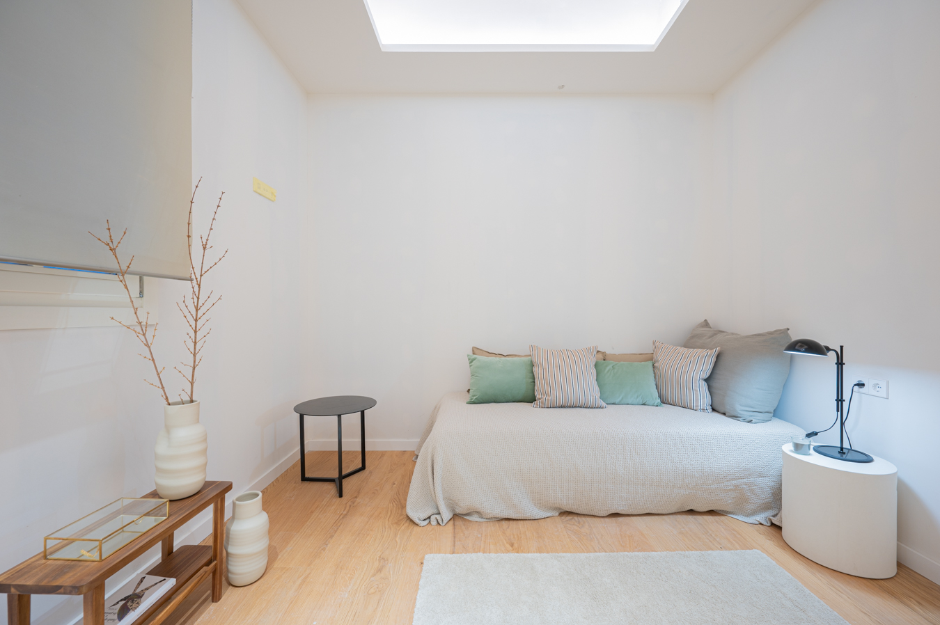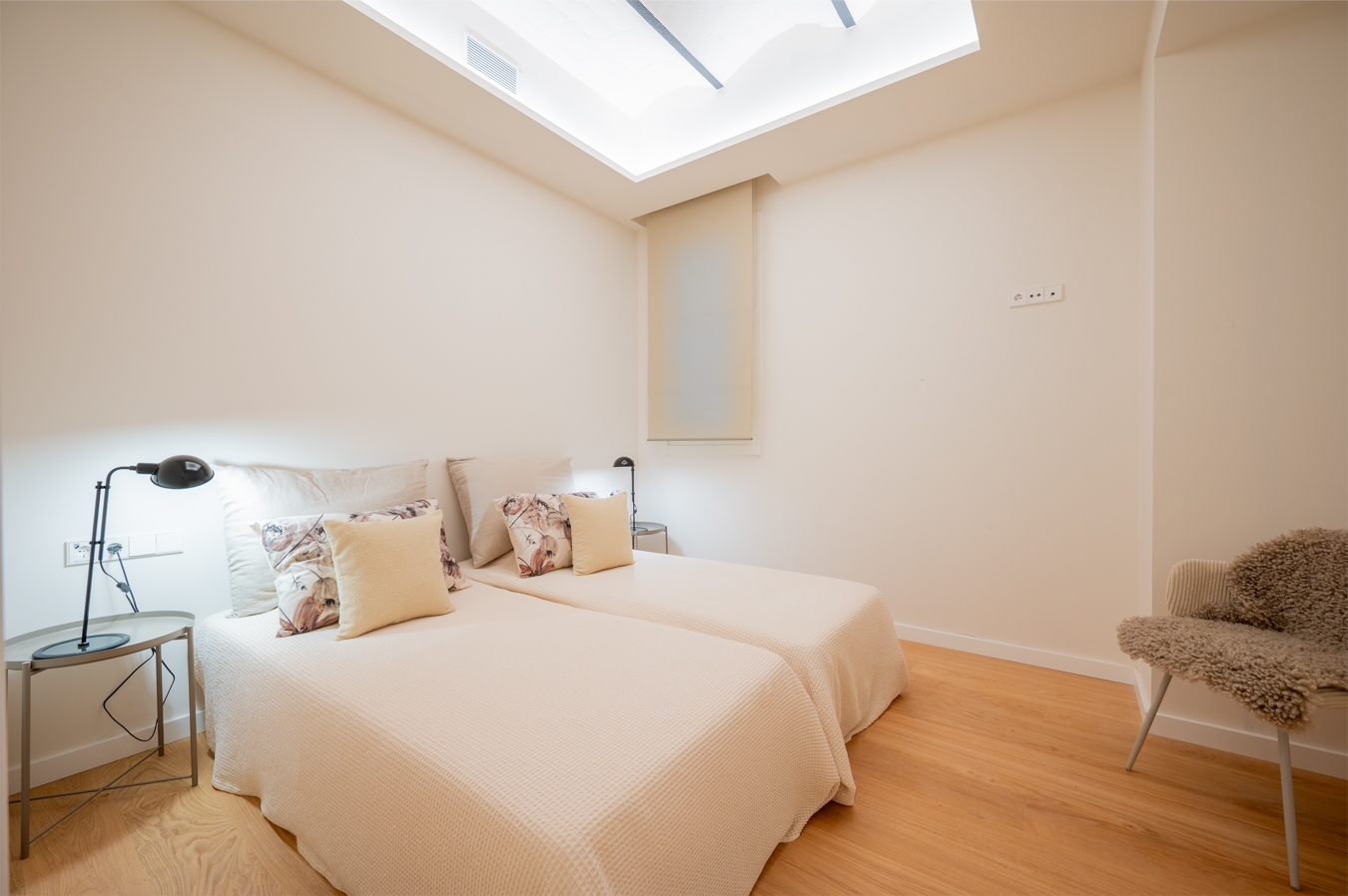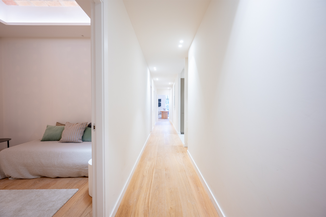 The extensive main façade of the building, as well as the many interior courtyards and the rear façade, provide the building with excellent lighting and ventilation. The unusual distance to the buildings parallel to the façade further enhances the feeling and perception of spaciousness. As this is a modernist building with important historical value, the interior design team has prioritised the recovery of some of the original elements. For example, a complete restoration and rehabilitation of the modernist stuccoes of the staircase core has been carried out; and in the independent vestibules, recovered hydraulic mosaic tiles will be installed to maintain the historical value of the property. In addition, the exterior joinery has been replaced with wooden windows and balconies with thermal break and laminated insulating glass.