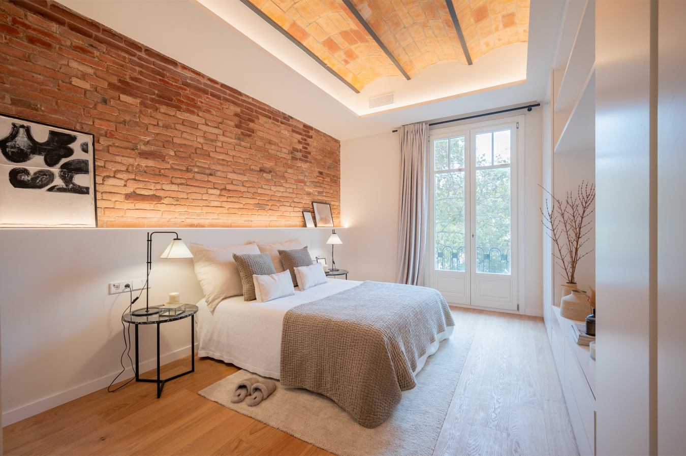 This fabulous property has an exceptional location in Barcelona and is part of a comprehensive refurbishment project in a 1910 building with luxury apartments. The building is on the corner of Carrer Girona, which is already being transformed into a pedestrian street and the works are almost finished, and Avenida Diagonal, which is being converted into a boulevard-style avenue with a large pedestrian area, green areas and a bicycle lane, significantly reducing vehicle traffic. You will be able to enjoy the best of Barcelona in an incomparable setting: in the heart of Eixample, very close to Paseo de Gracia, the city centre and all the shops and services. This property, on the 4th real floor, has 110 built interior sqm and two balconies totalling 4.75 sqm. As it's a corner building, it offers great natural light, which is unusual in the Eixample, and unique views with a good amount of depth. An entrance hall leads to the hallway, which leads to the large living-dining room with open-plan kitchen of 43 sqm, which has a balcony facing the street. The night area offers 2 bedrooms. The stunning master suite has a dressing room at the entrance and a private bathroom. It also has a balcony facing the street. In addition, there's a double bedroom and, next to it, a separate bathroom. Construction of this property is scheduled to be completed in the fourth quarter of 2024 and the keys will be handed over in the first quarter of 2025. The property will be equipped with the highest quality materials and finishes, as well as a carefully designed interior design that will combine the classic elements of the regal estate buildings with the most modern.The ample spaces and luminosity will be highlighted, achieving a balance between traditional features such as the restored Catalan vaulted ceilings and the elements of comfort of a new building:underfloor heating, hot and cold air conditioning powered by aerothermics (the latest technology in air conditioning systems that produces energy savings of between 60% and 70% compared to conventional systems), high-end home appliances, natural wood floors, entrance door with security lock, built-in wardrobes, porcelain tiling on bathroom walls, LED lighting, fibre optic connection, Internet and TV signal sockets, etc. The building, which will be fully refurbished, will have 2 lifts (the original one restored respecting its wooden cabin with a new mechanism and a completely new one), a concierge, an area for charging electric bicycles and a private modernist-vintage style gym with 2 toilets. The large main façade of the estate, as well as the numerous inner courtyards and the rear façade, provide the building with ideal lighting and ventilation. The unusual distance to the buildings parallel to the façade further enhances the feeling and perception of amplitude. As this is a modernist building of significant historical value, priority has been given to recovering some of the original elements. For example, there has been a complete restoration and rehabilitation of the modernist stuccoes of the staircase core; and in the independence lobbies, recovered hydraulic mosaic will be installed in order to maintain the historical value of the property. In addition, the exterior joinery has been replaced with wooden windows and balconies with thermal break and laminated insulating glass. This building has 1, 2 and 3 bedroom flats with prices starting at 511,560 €, 613,480 € and 938,840 €, respectively. Contact Bcn Advisors for more information. * The renderings and square metres in this listing may be subject to change. These images are merely informative and may change depending on the needs of the clients or changes that may be made during the execution process of the refurbishment project and/or project works. * The floorplan and the content of this listing are not a contractual document, it's part of the executive project and may be subject to modifications due to technical requirements, administration or public organisations. The surfaces will be provisional. The furniture (including the kitchen), gardening and accessory elements are only illustrative.