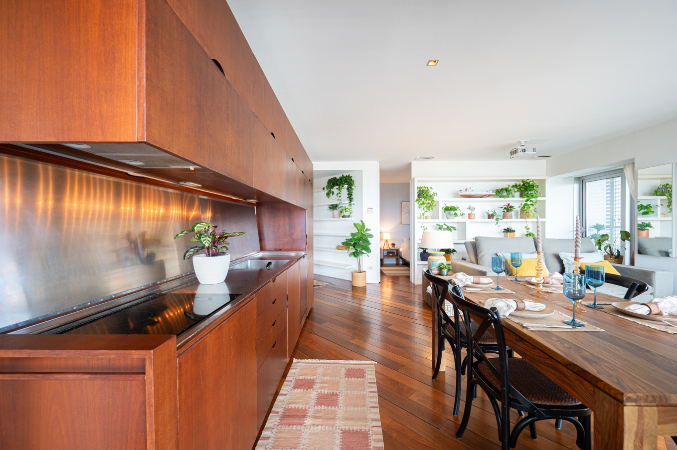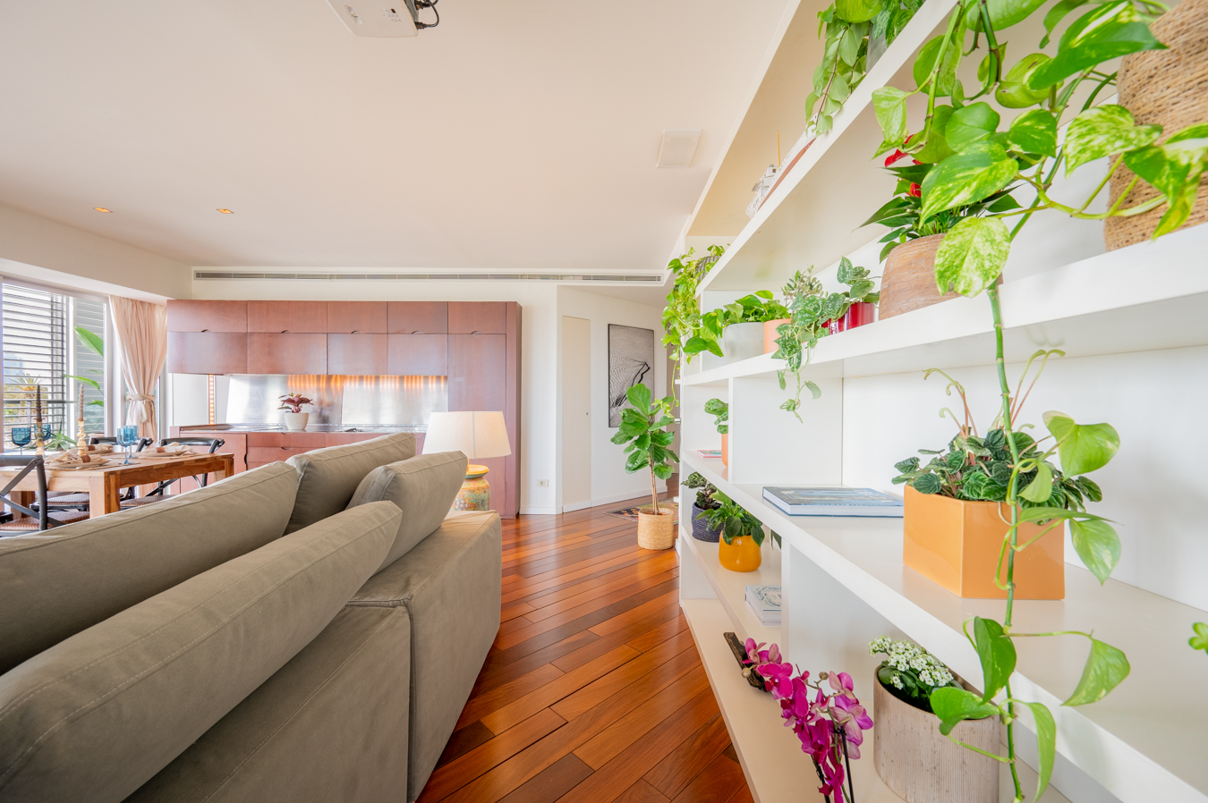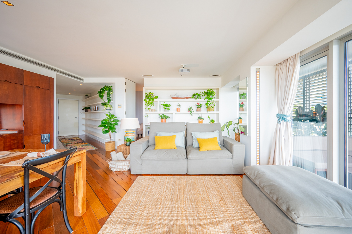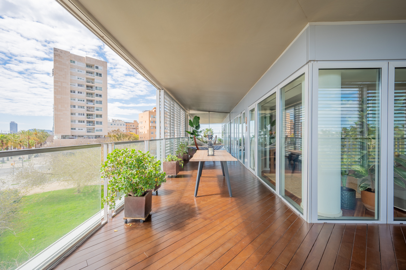 The jewel of this flat is the terrace that surrounds the entire exterior. Its large 56 sqm surface area allows you to create various ambiences, from a chill-out area to enjoy with friends, a dining area to enjoy your meals outdoors and a relaxation area with hammocks to escape in Barcelona’s pleasant climate all year round.