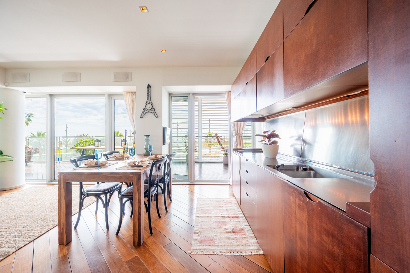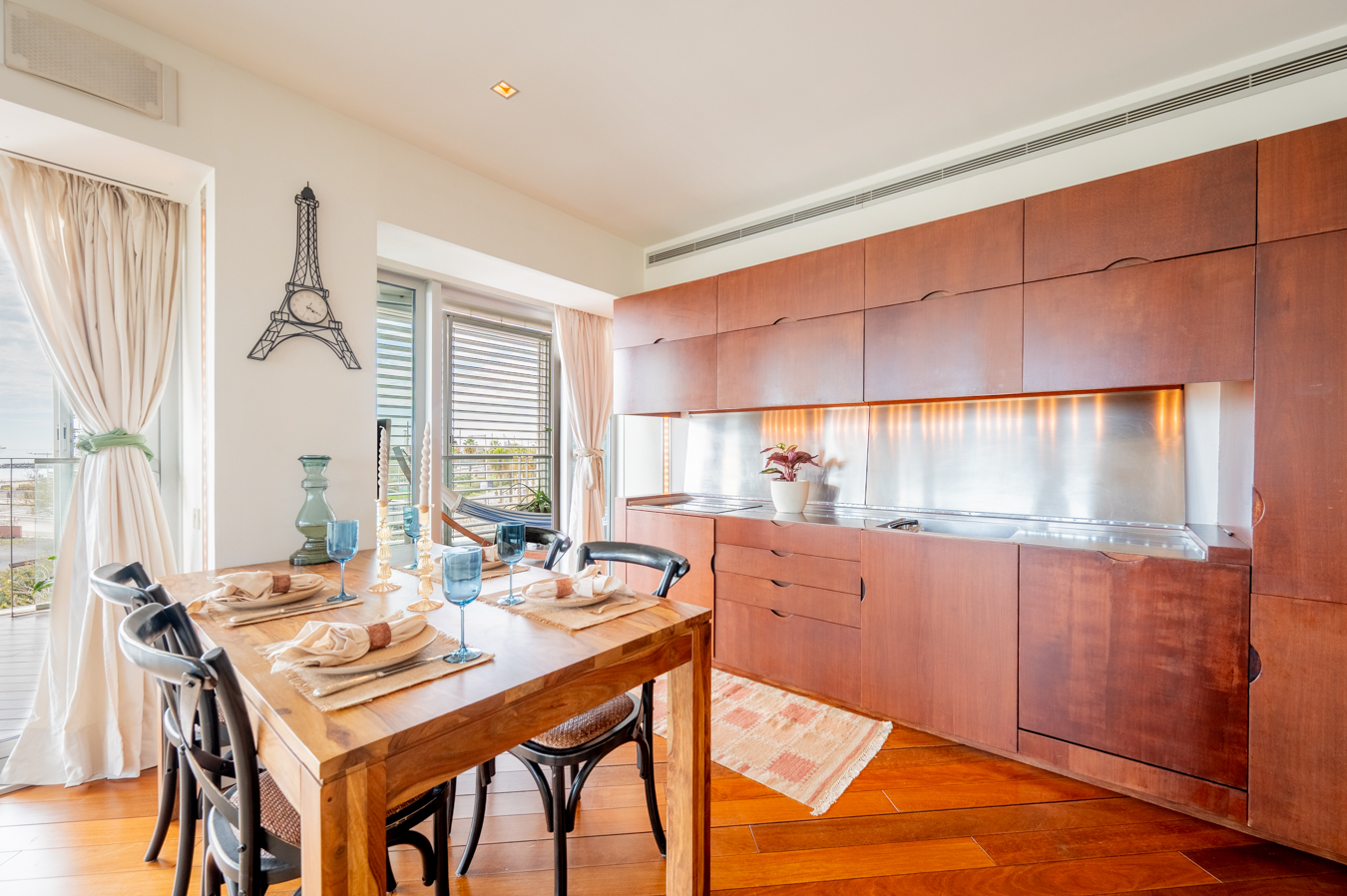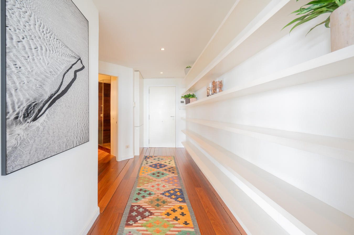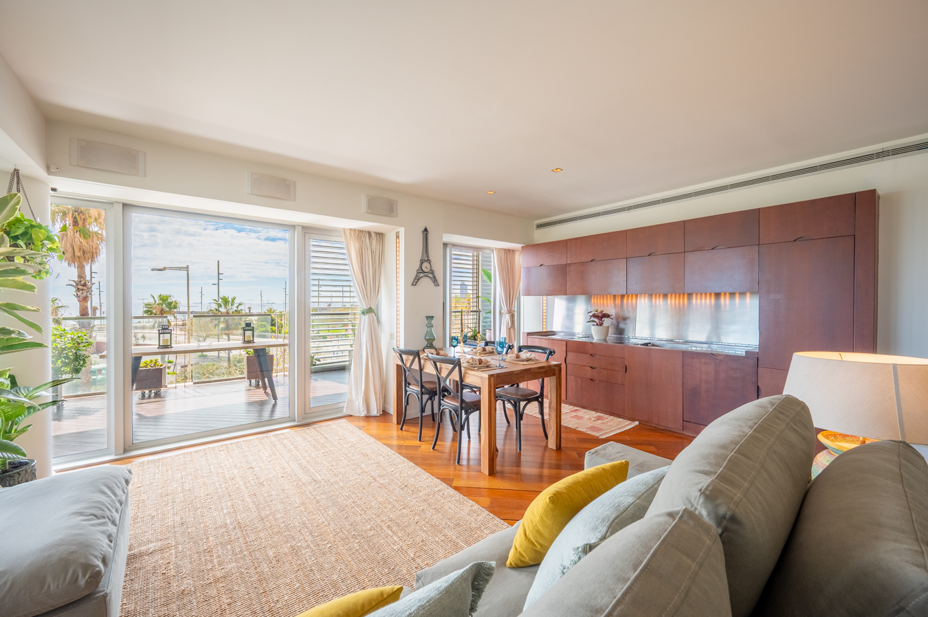 The jewel of this flat is the terrace that surrounds the entire exterior. Its large 56 sqm surface area allows you to create various ambiences, from a chill-out area to enjoy with friends, a dining area to enjoy your meals outdoors and a relaxation area with hammocks to escape in Barcelona’s pleasant climate all year round.