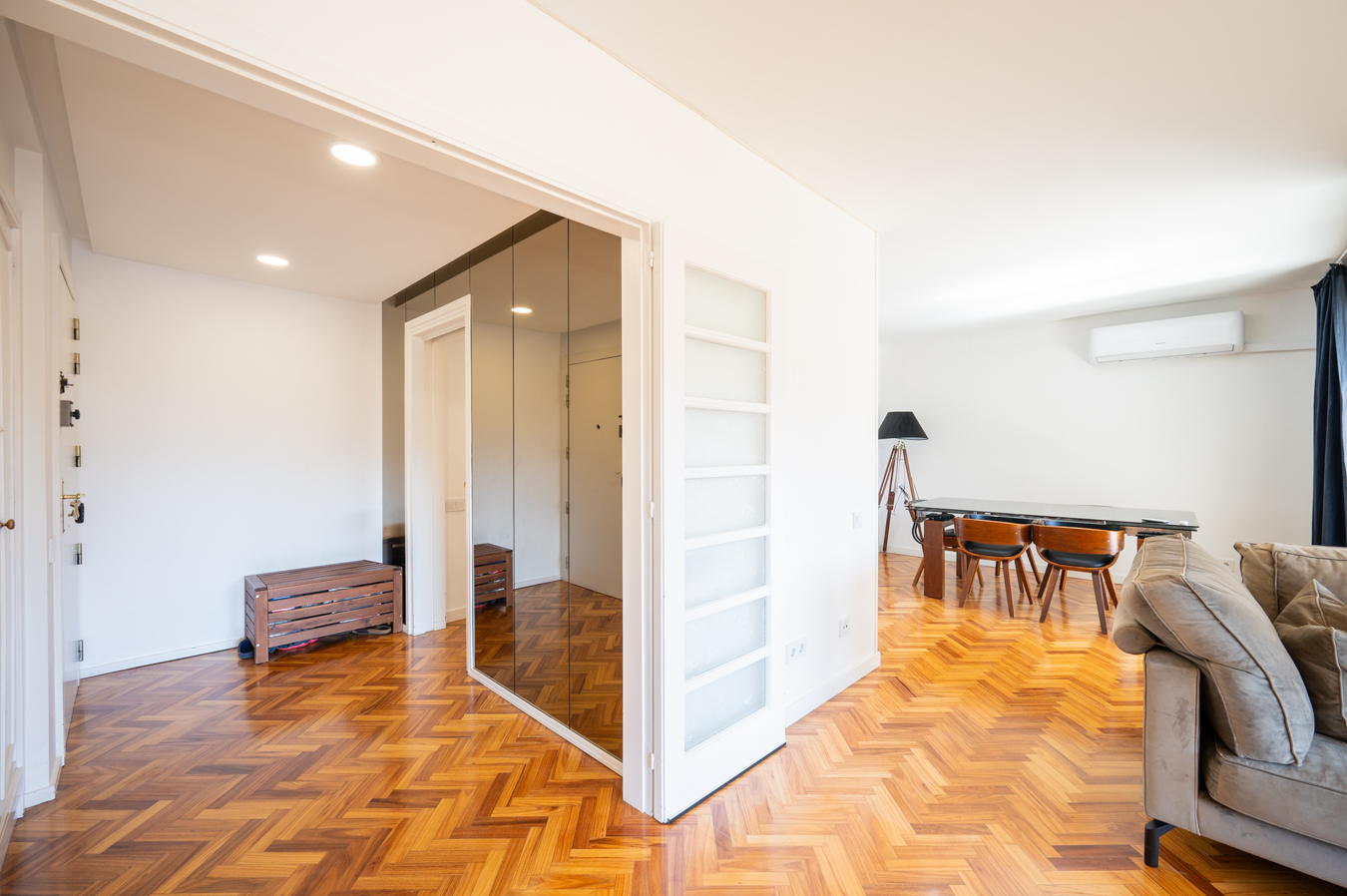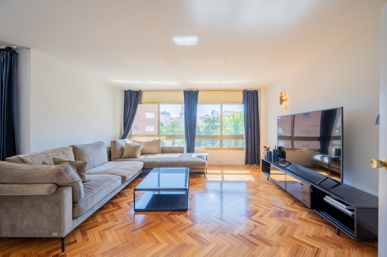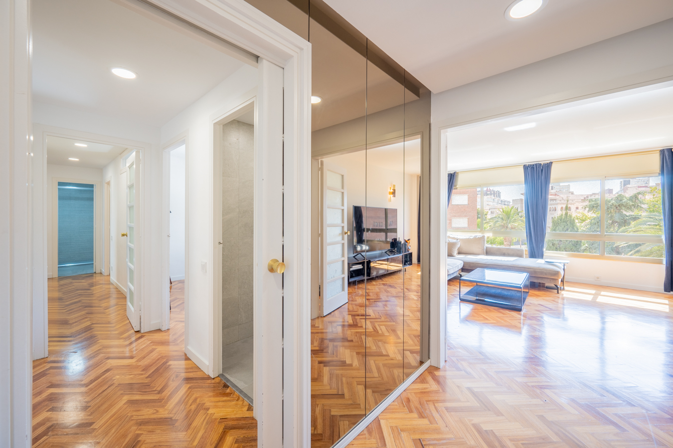 This amazing refurbished flat in excellent condition, practically brand new, is located in a prestigious regal estate building on the corner of the sought-after pedestrian Girona street. As it's on the real 5th floor and has double orientation, it's very bright and quiet. The property has 157 built sqm. The day area overlooks the block courtyard, so it's very quiet and receives a lot of natural light. It's a fantastic living-dining room with a gallery area and a semi-open kitchen, separated by glass and aluminium. The kitchen furniture is custom-made and is equipped with white marble worktop, Bosch appliances, Smeg industrial cooker and osmosis system. At the end of the living room, we find an open work area that could be closed off and converted into a totally independent bedroom or office, which would be the fourth bedroom. The night area has 3 double bedrooms. Two of them are very spacious and totally exterior, with access to a balcony with views to Diputació and Girona streets. The third bedroom is interior to a lightwell. Besides, there are 2 complete bathrooms, one with shower and the other one with bathtub. Both have polished micro-cement cladding and built-in stainless steel taps and fittings. The flat is equipped with parquet floors and air conditioning hot/cold divided in two rooms (day area and night area). All the carpentry is new, with double glazing and total acoustic isolation. The building has a very nice and well maintained entrance, suitable for people with reduced mobility as there are no stairs from the street to the lift. The property is located two streets away from the pleasant Paseo Sant Joan, with numerous restaurants and bars, as well as close to Paseo de Gracia and the Born district. The surrounding area offers a wide range of services, schools and public transport. Do not hesitate to contact Bcn Advisors to request a visit to this property.