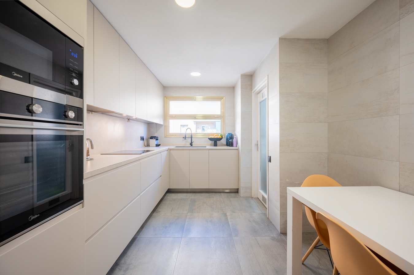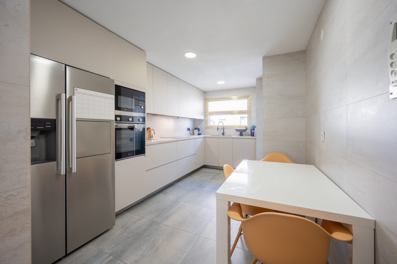 The flat has 2 entrances: one to the hall and the other directly to the kitchen. The hall leads to the day area, located at the entrance of the flat. The spacious living-dining room has large windows and pleasant open views of the communal area and many trees. It also has access to a 6 sqm terrace with space for table and chairs, to eat outdoors. The kitchen is spacious and has a laundry area. This day area is completed with a guest toilet.