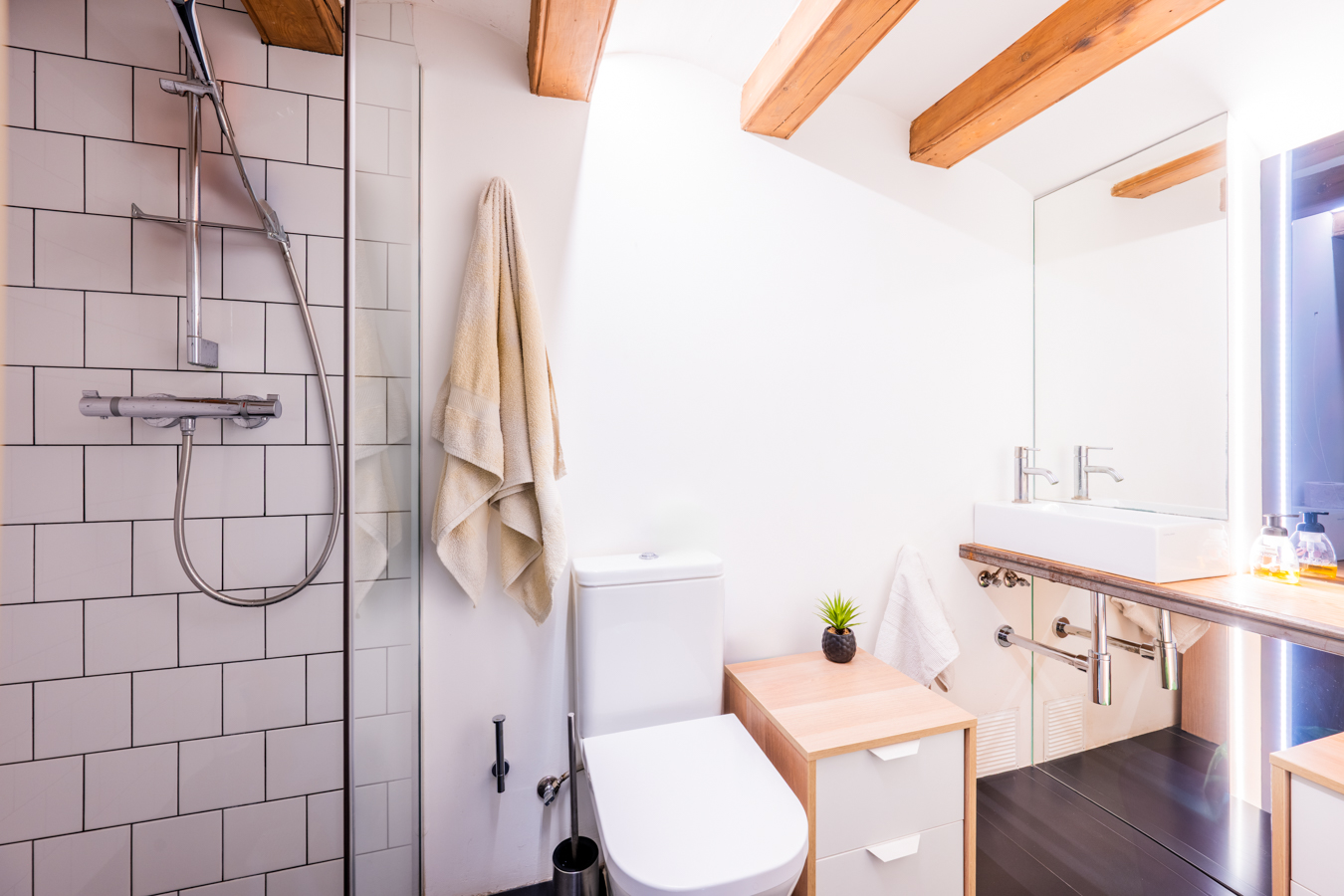 Returning to the main floor, we go up the stairs to the loft floor. Here we find a study area perfect for teleworking, 2 double bedrooms and a full bathroom. The exposed beams are still present, as are the vaulted ceilings in the rooms.