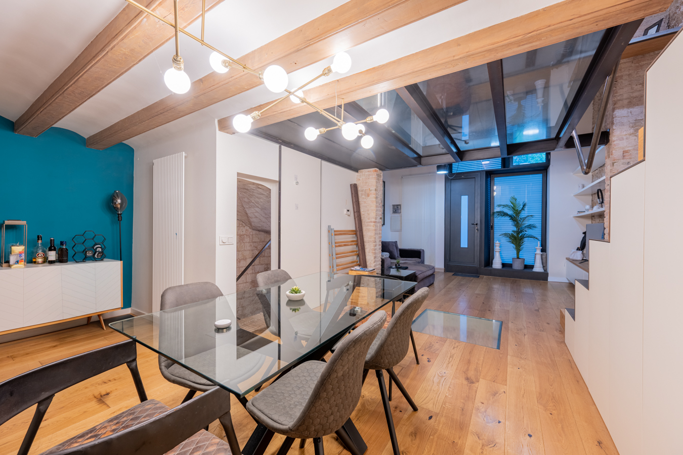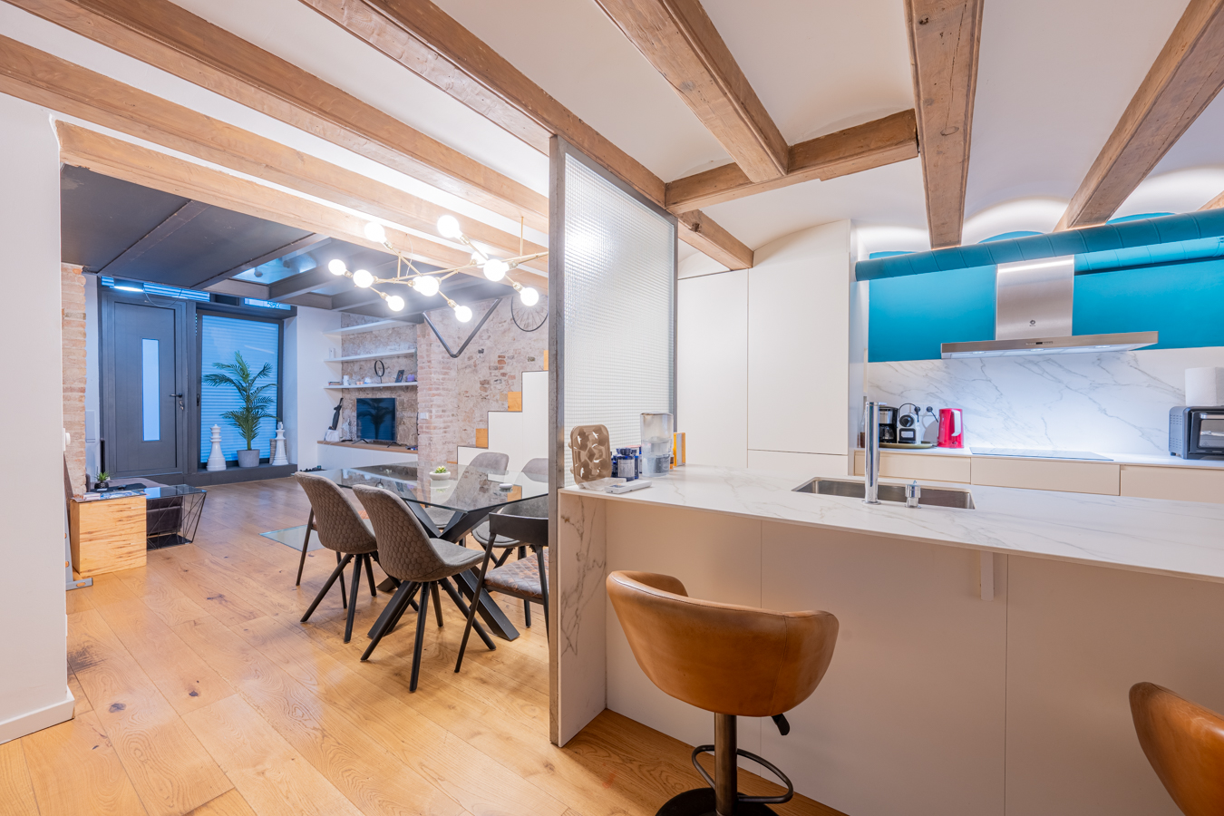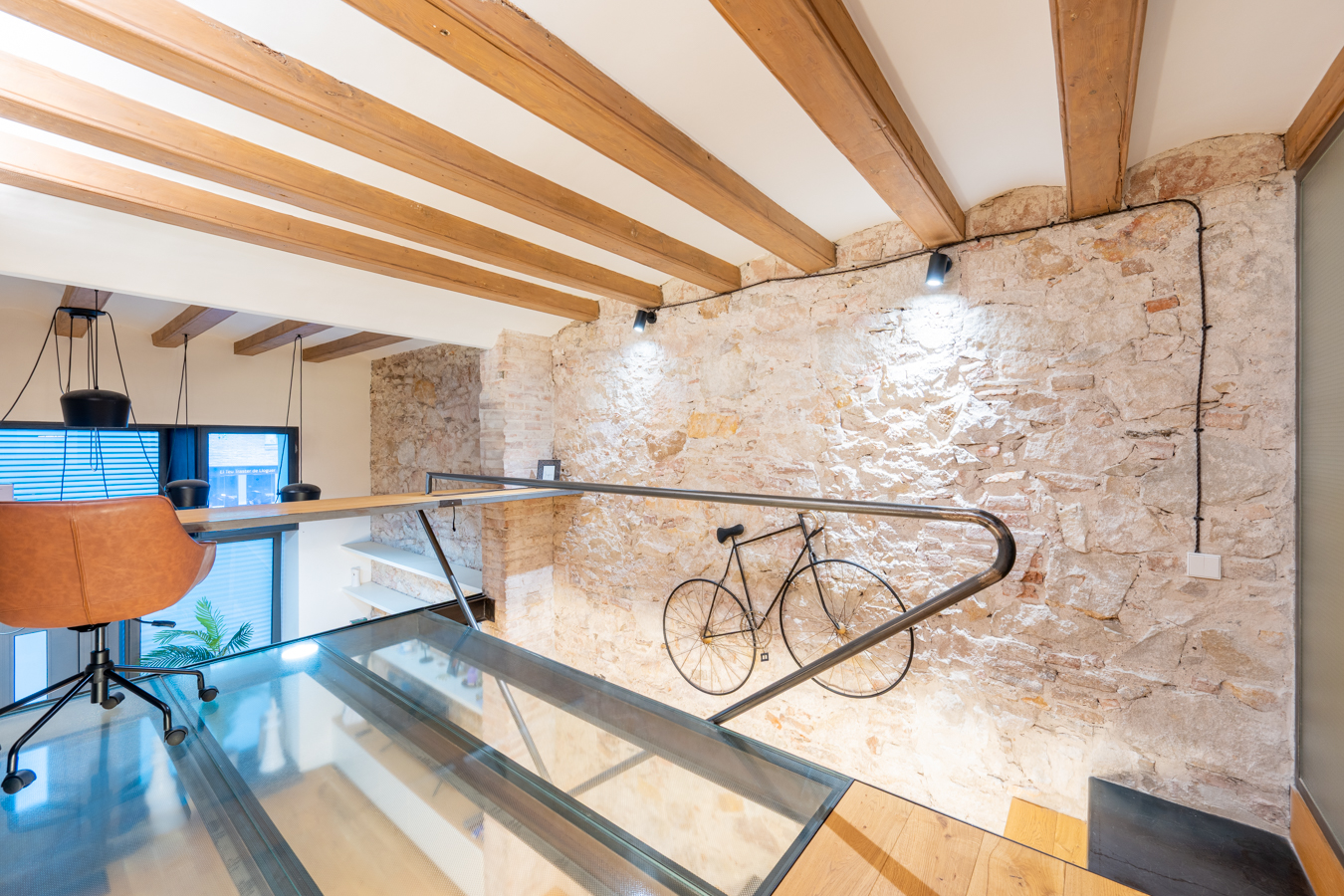 The property is on the ground floor and has 168 m2 of interior space spread over 3 floors, as well as a 5 m2 patio. The main floor is the living area, a spacious area that allows you to create different environments such as a living room, dining room and a more relaxed chill-out area. The kitchen is integrated into this space and has a peninsula that can also be used as a bar. On this floor is the patio, ideal for enjoying the outdoors. A storage room and a toilet complete this floor. The exposed brick walls and wooden beams are noteworthy features of this floor.