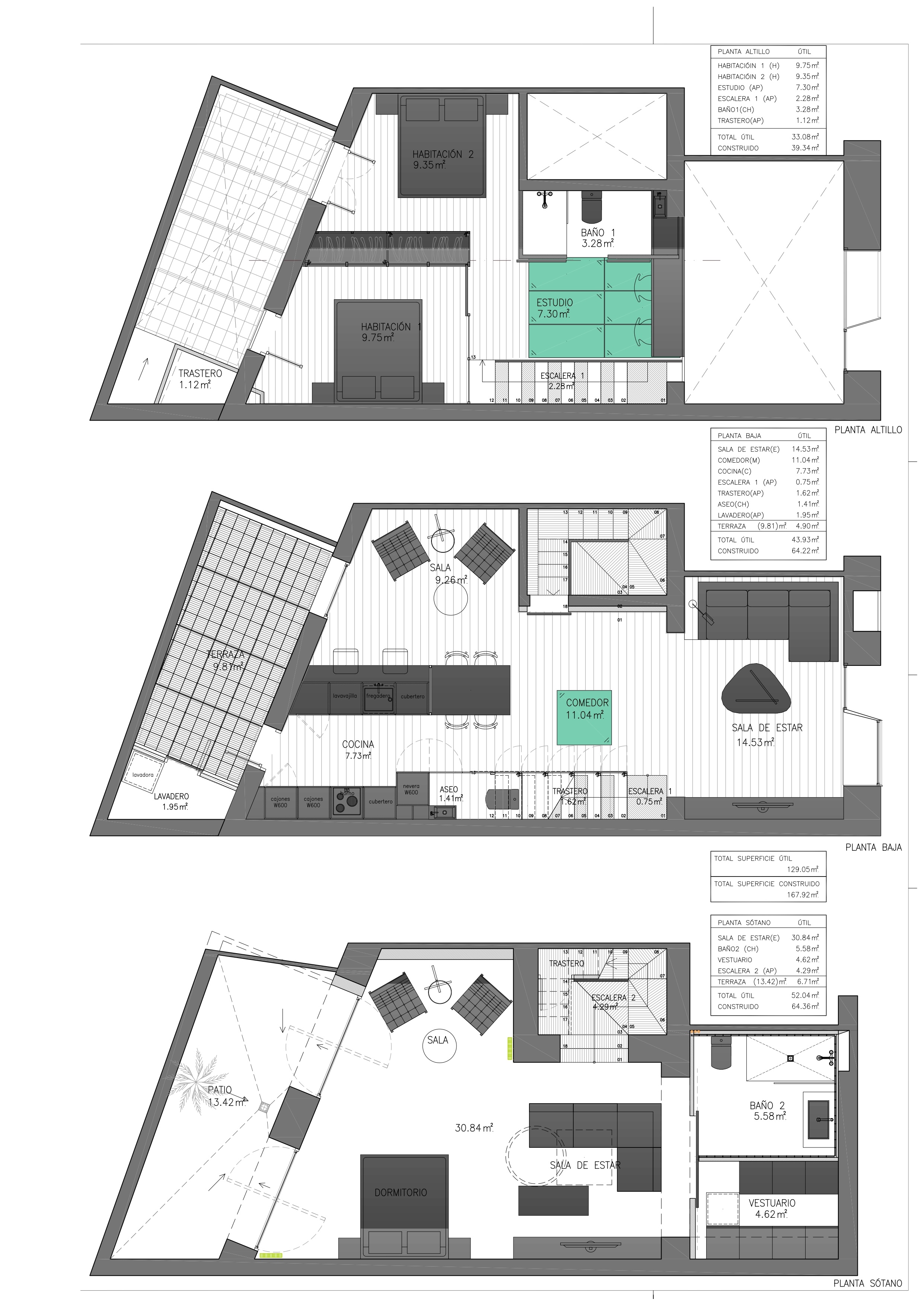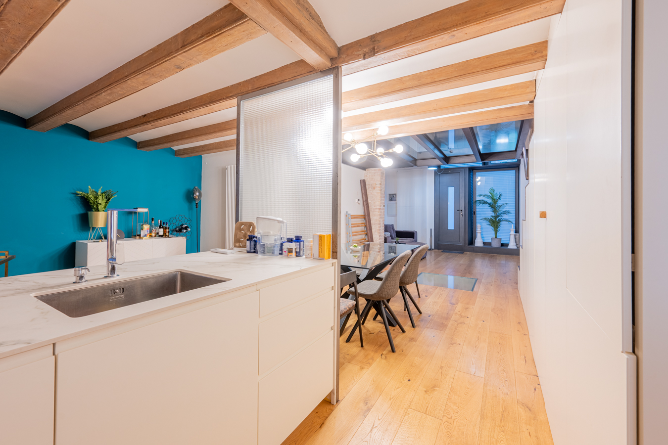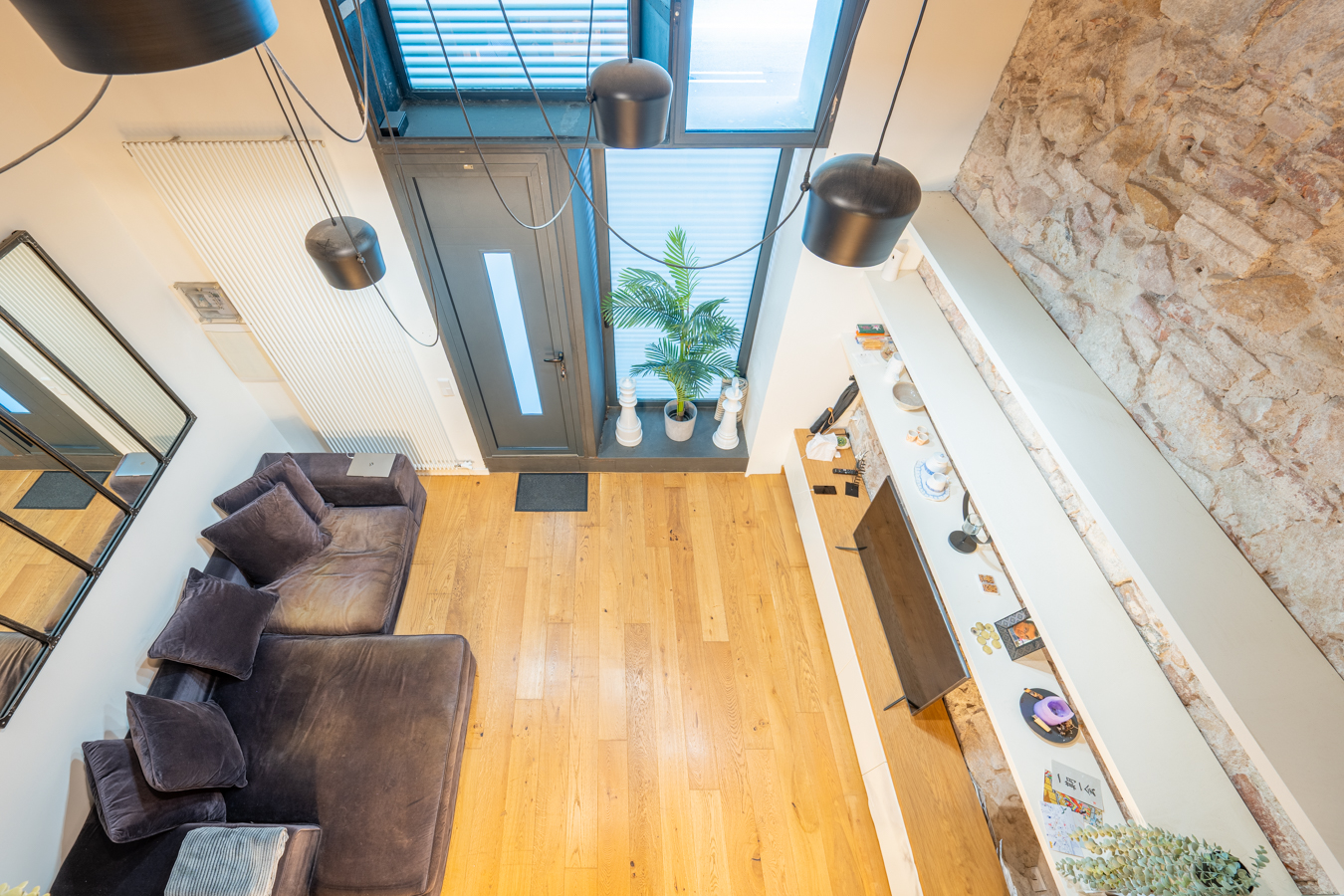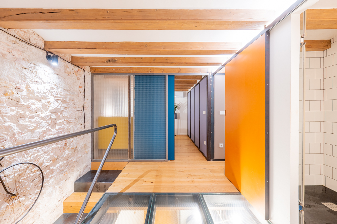 The property is on the ground floor and has 168 m2 of interior space spread over 3 floors, as well as a 5 m2 patio. The main floor is the living area, a spacious area that allows you to create different environments such as a living room, dining room and a more relaxed chill-out area. The kitchen is integrated into this space and has a peninsula that can also be used as a bar. On this floor is the patio, ideal for enjoying the outdoors. A storage room and a toilet complete this floor. The exposed brick walls and wooden beams are noteworthy features of this floor.