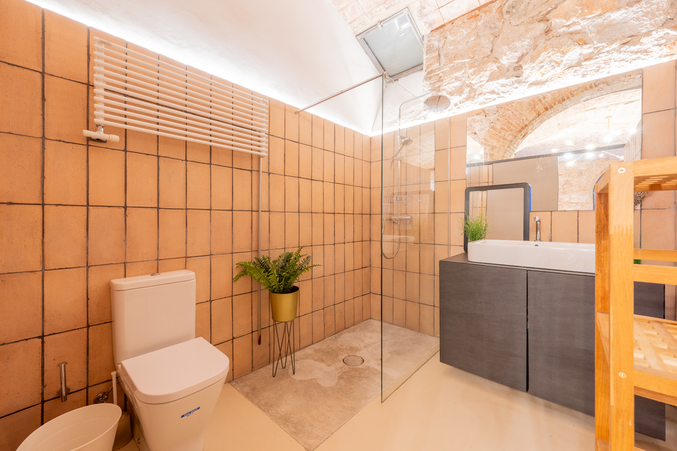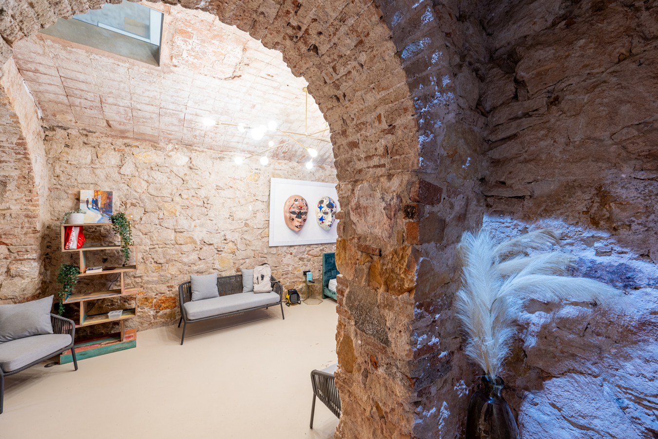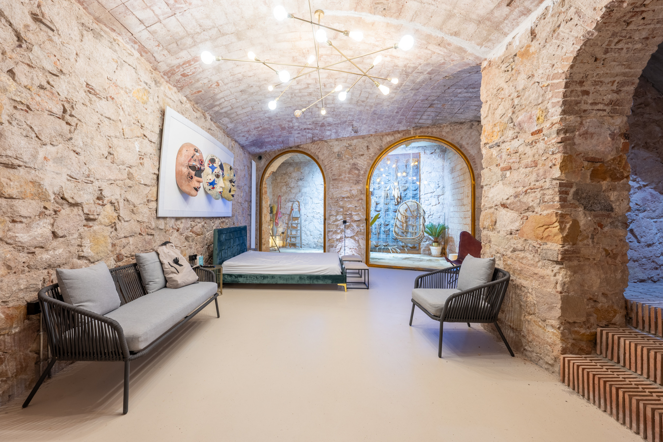Going down to the basement, we find a spectacular area that welcomes us with an archway, where we can contemplate all the brick and stone walls as a vestige of the past, creating a unique atmosphere. On this floor, we find the master bedroom with a huge space for relaxation areas, a dressing room and a bathroom. In addition, two arches give us access to a covered patio to create another atmosphere.