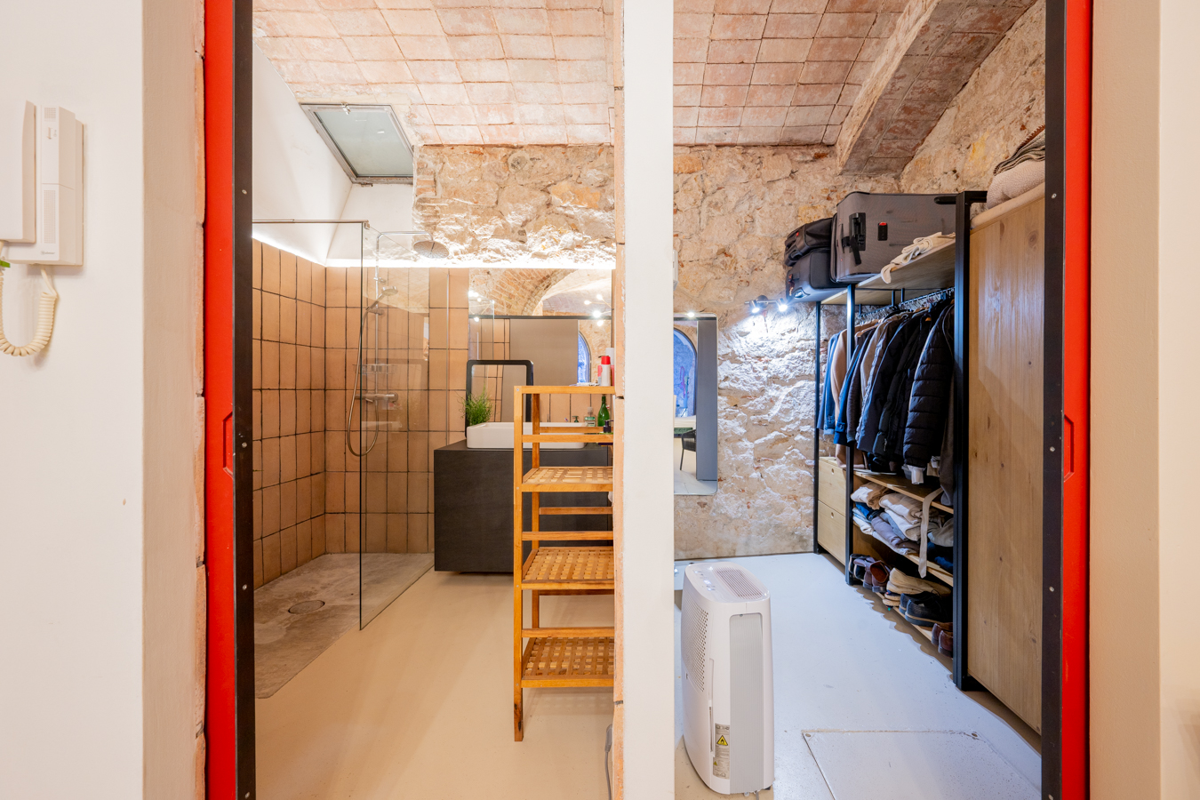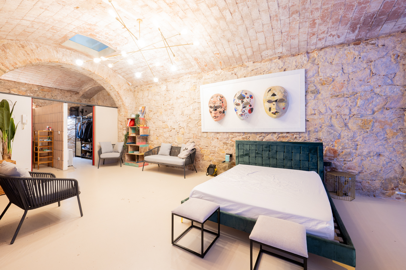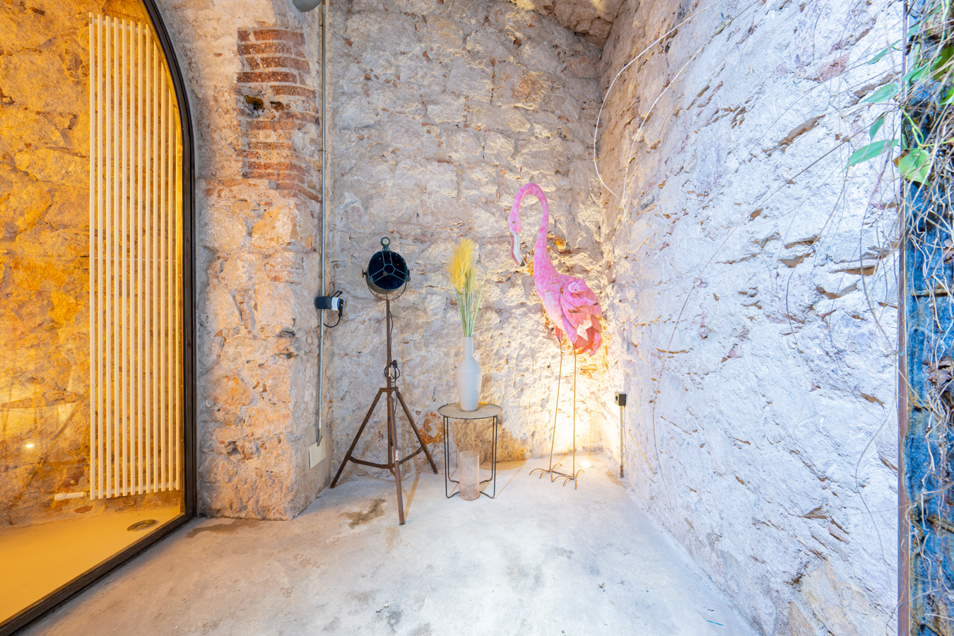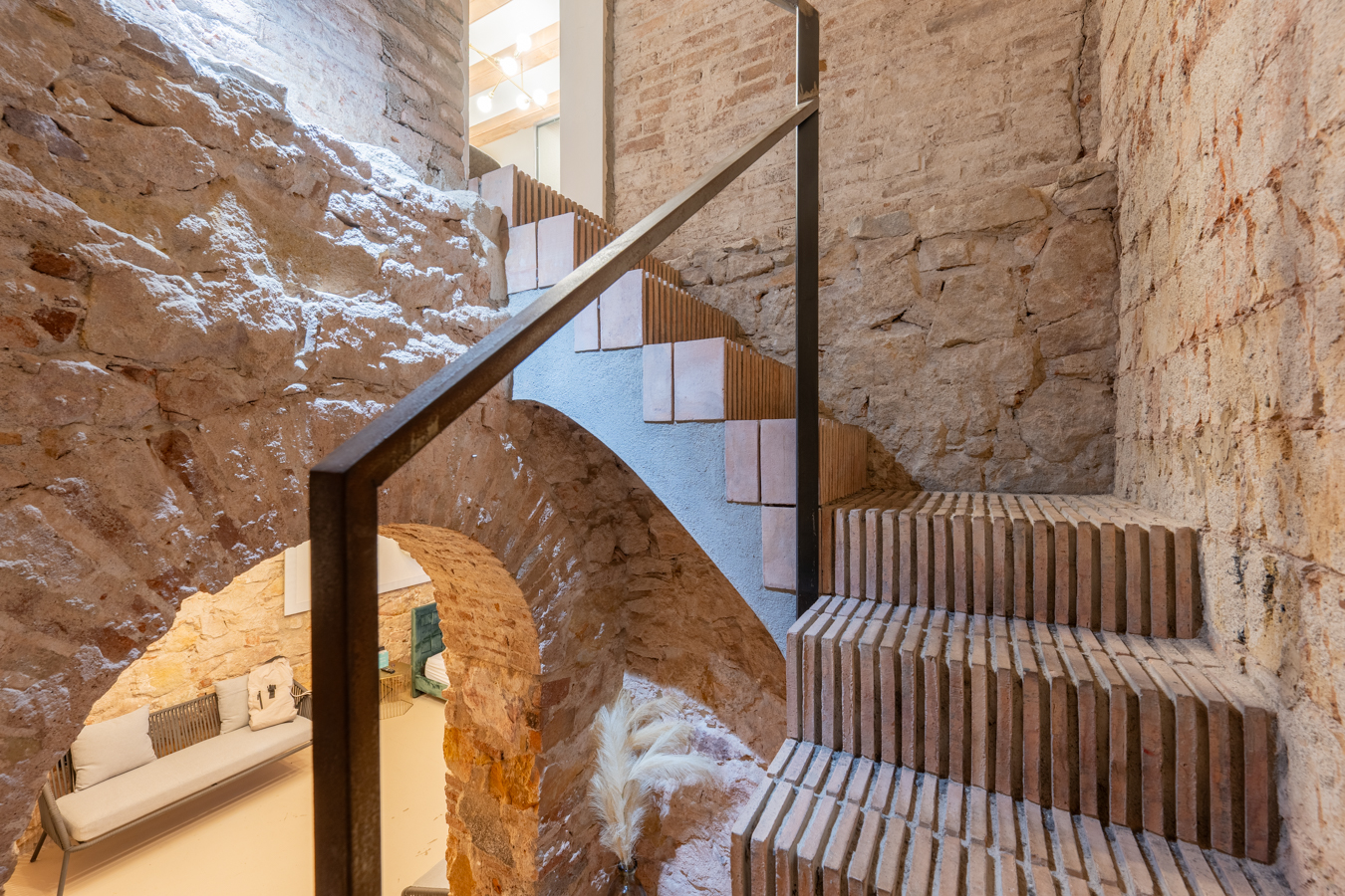 Going down to the basement, we find a spectacular area that welcomes us with an archway, where we can contemplate all the brick and stone walls as a vestige of the past, creating a unique atmosphere. On this floor, we find the master bedroom with a huge space for relaxation areas, a dressing room and a bathroom. In addition, two arches give us access to a covered patio to create another atmosphere.