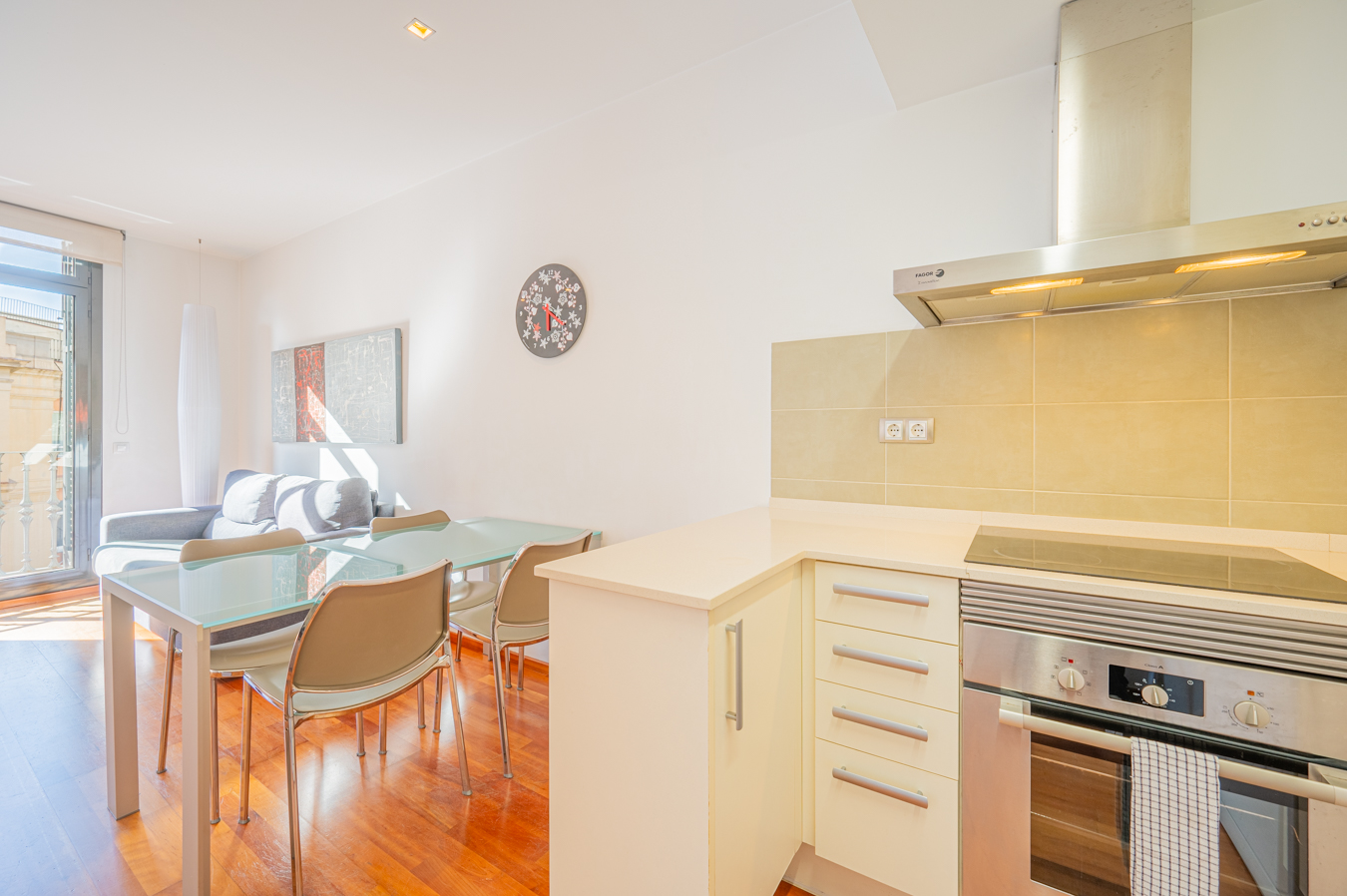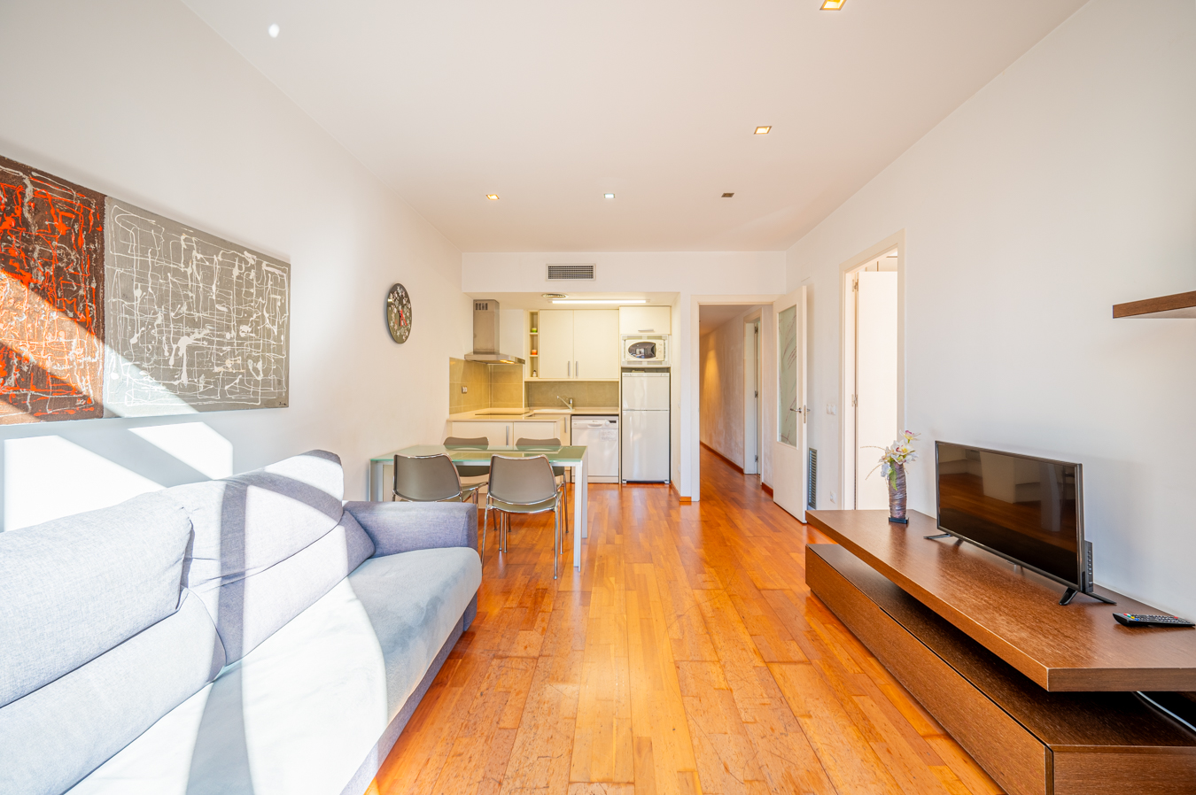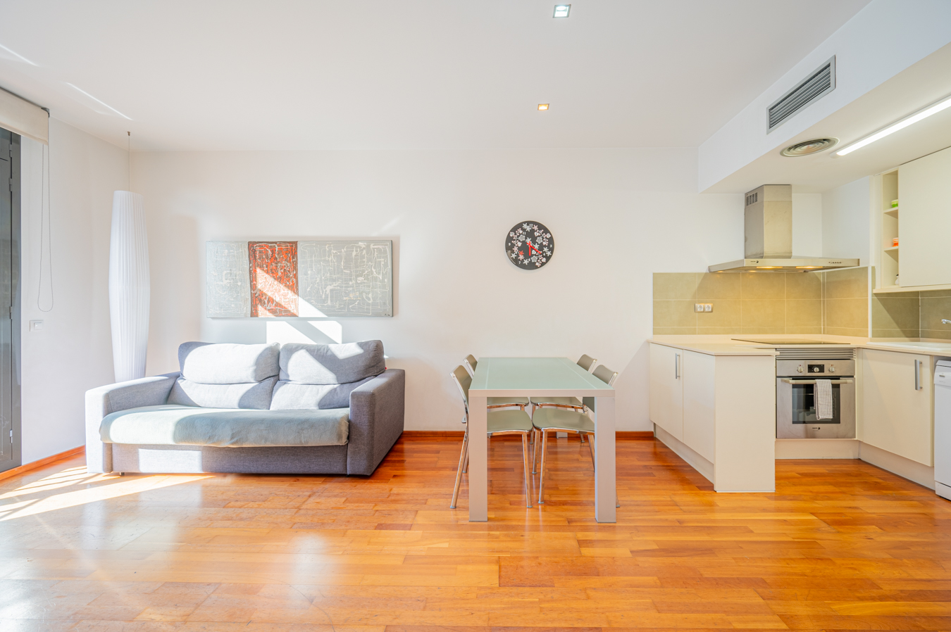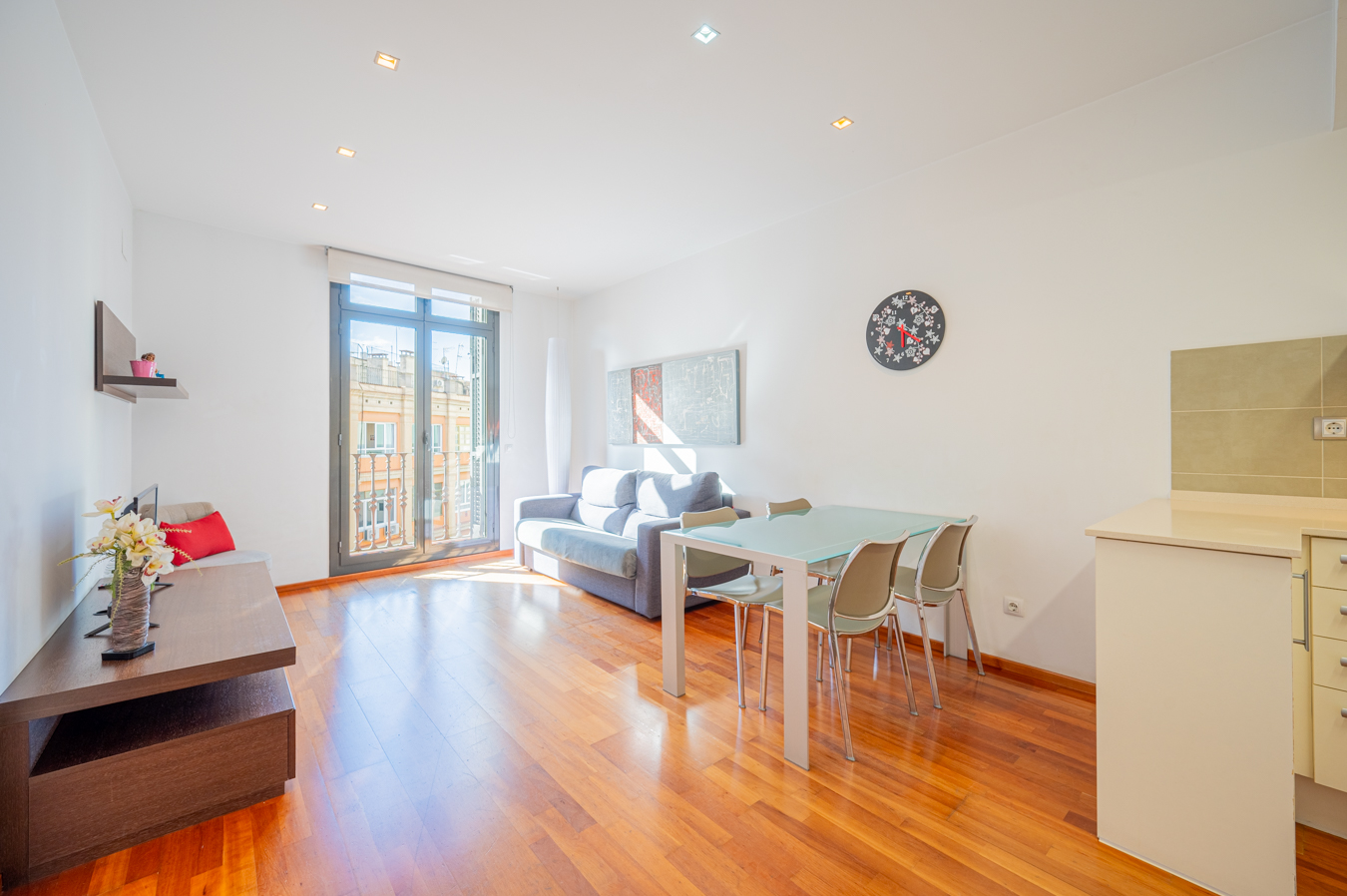 This flat is in a building from 2020 with only 10 apartments, just a few metres from the city center, Plaza Catalunya, Plaza Universitat, Las Ramblas and Ronda Sant Antoni. It enjoys an enviable location in the centre of Barcelona, with all kinds of shops, services and public transport nearby. This flat is on the first floor of the building and has 65 built interior sqm and a 9 sqm patio. It includes a storage room in the basement of the building. The living-dining room is spacious and bright, with integrated kitchen and exit to the pleasant patio, ideal to have a drink outdoors. The sleeping area consists of a double bedroom and a single bedroom, both facing the street, and a bathroom. The second bedroom can be a support to the living-dining room, or be converted into a more private space for reading, working, music, dressing room... The living room and the bedrooms have large floor-to-ceiling windows that give spaciousness and let in natural light. The building's installations are designed for comfort and the optimisation of resources and sustainability. Domestic hot water production, underfloor heating and air conditioning control are supplied through ducts, which are linked to an aerothermal system, with electricity and water being the only supplies. The property also has a home automation system that is controlled via a Gira touchscreen, which incorporates a video entry system and exterior cameras on the roof. The kitchen is equipped with Bosch appliances, including an integrated washer-dryer. The building has a lift and a communal rooftop solarium terrace. Do not hesitate to contact Bcn Advisors to visit this flat.