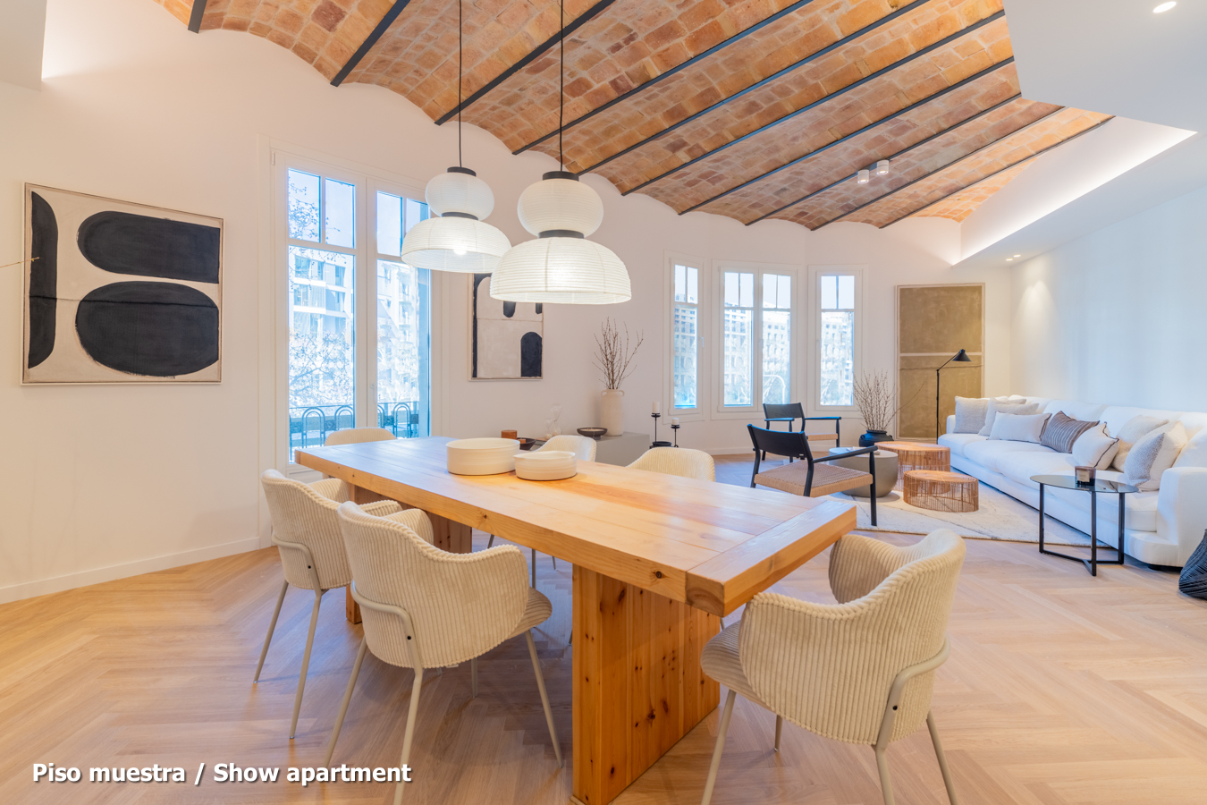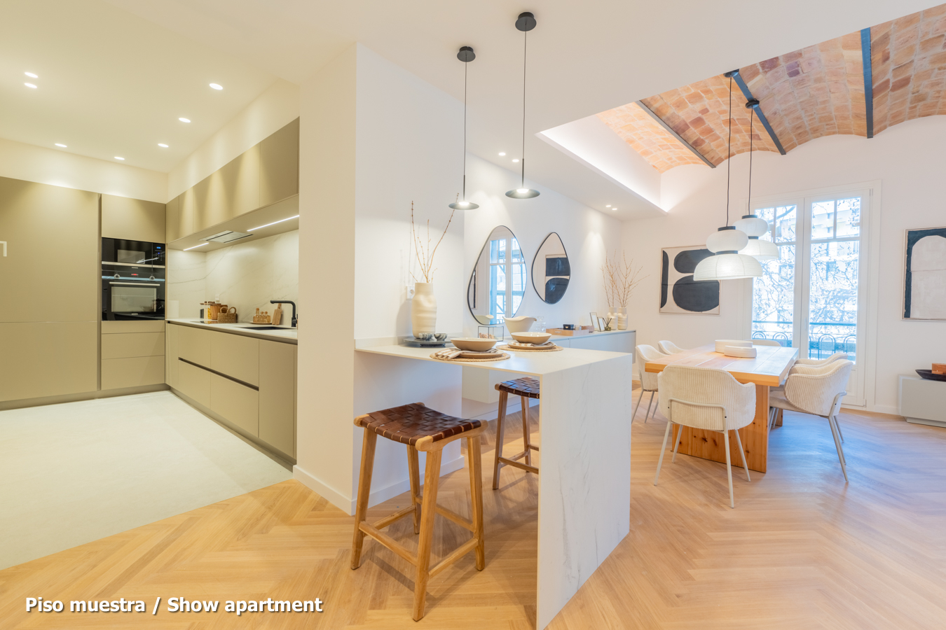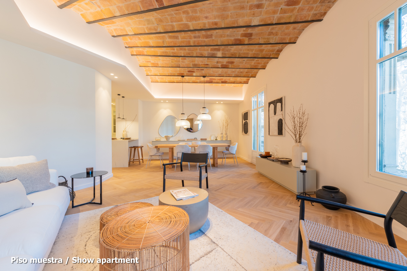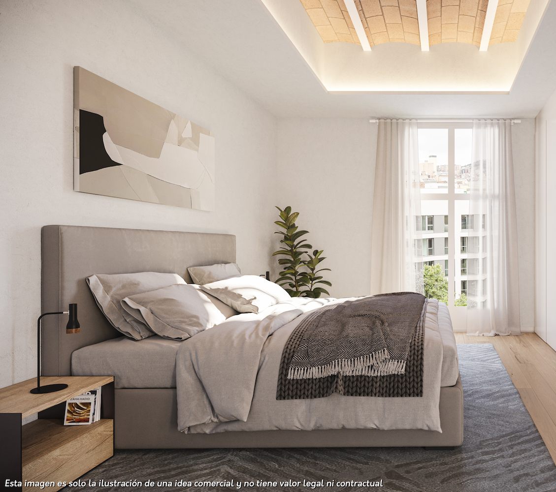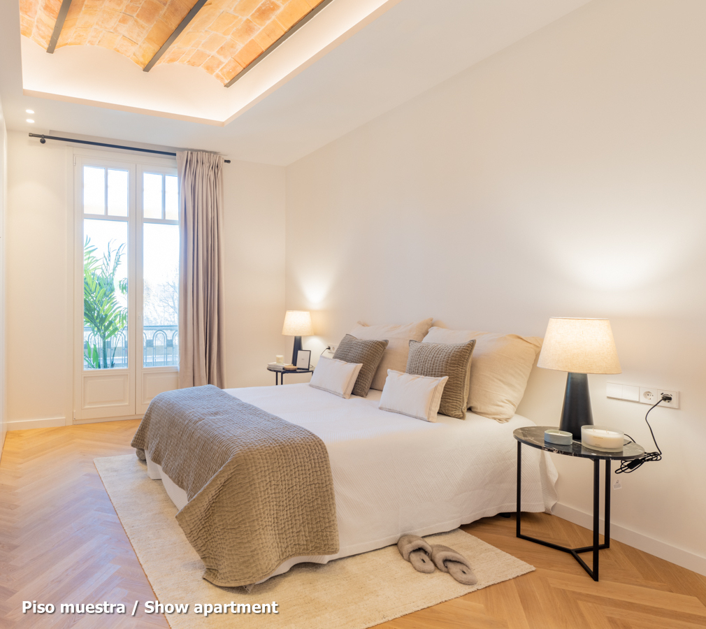 The flat, which is scheduled to be completed in the last quarter of 2024 and handed over in the first quarter of 2025, will have the highest quality materials and finishings, as well as an interior design with attention to detail that will combine the classic elements of the regal estate buildings with the most modern. Large spaces and brightness will be important, achieving a balance between traditional elements such as the restored Catalan vaulted ceilings and the comfort and amenities of a new building: underfloor heating and hot-cold air conditioning powered by aerothermics (the latest technology in air conditioning systems that produces energy savings of between 60% and 70% compared to conventional systems), top-of-the-range Siemens appliances, natural wood parquet floors, entrance door with security lock, built-in wardrobes, porcelain tiling on the bathroom walls, Italian designer taps, LED lighting, fibre optic connection, Internet and TV signal sockets, etc.