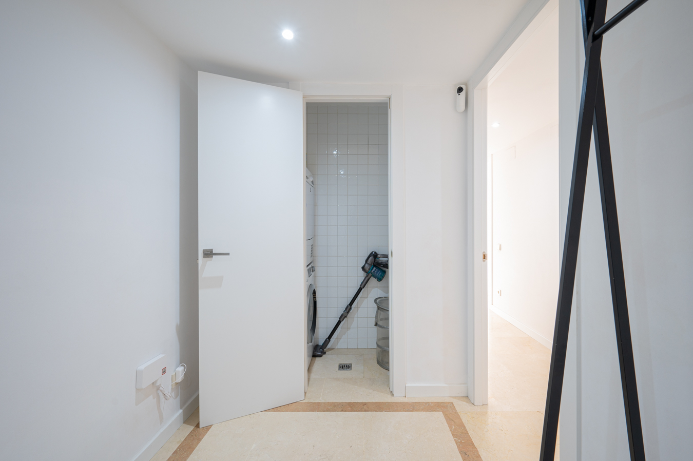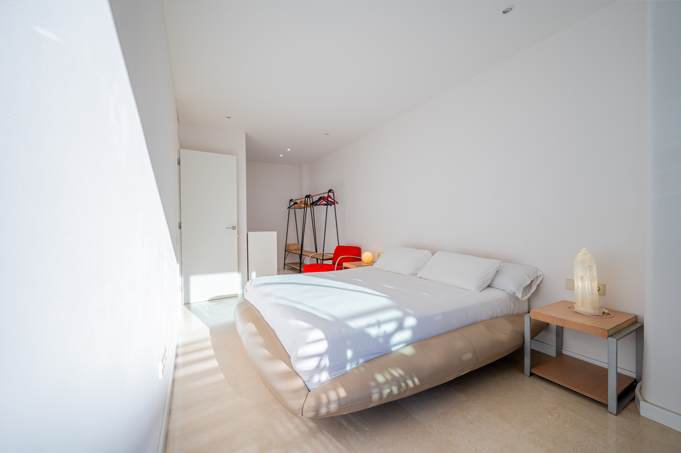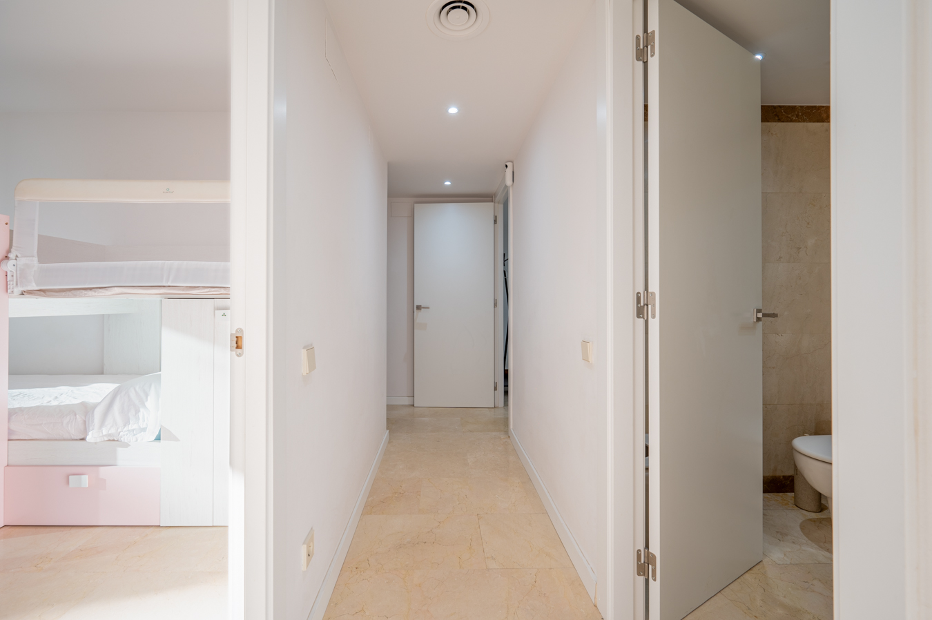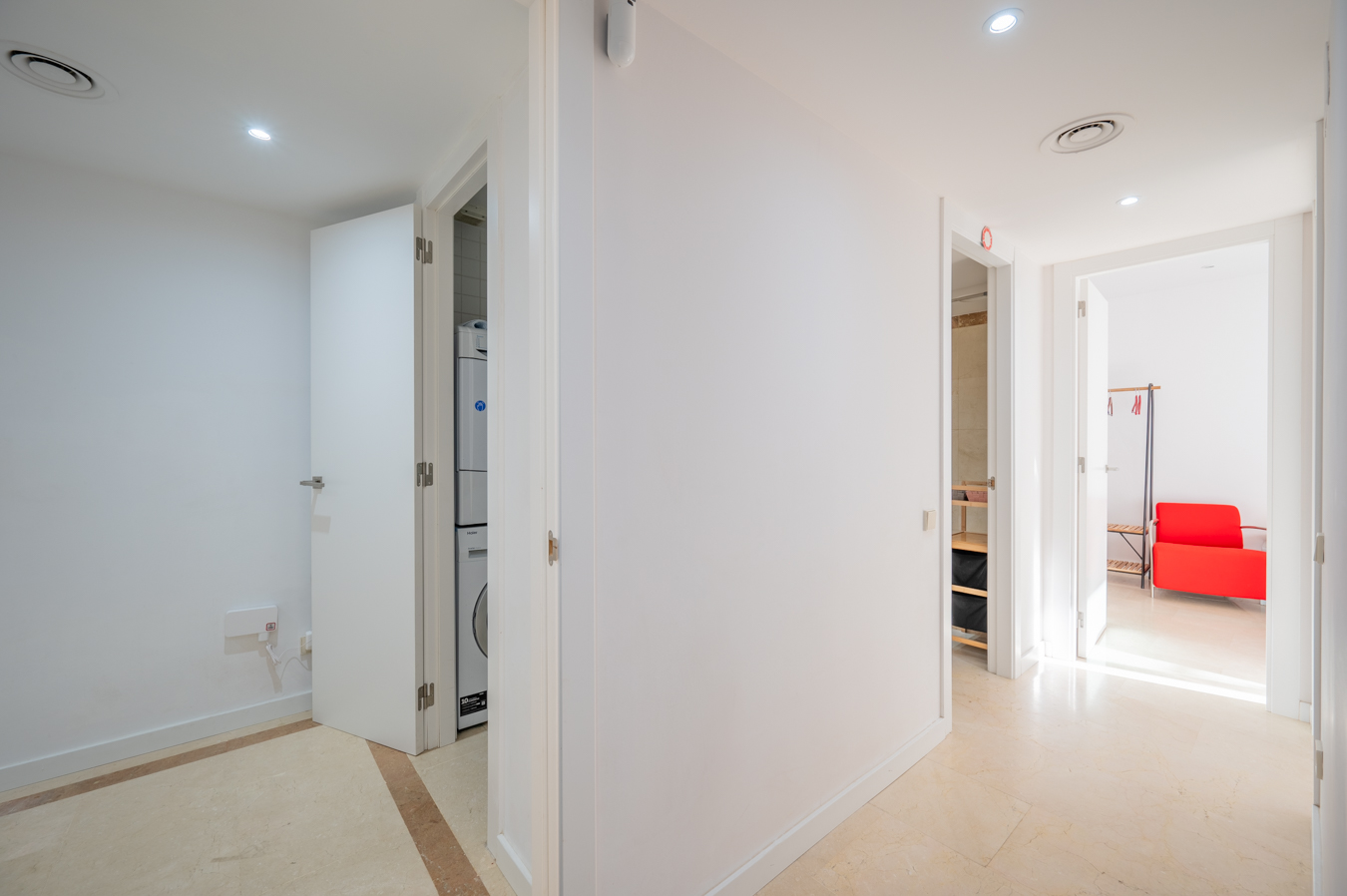 If we go back to the entrance hall, we access a hallway that divides the night area, which has 2 bright bedrooms with access to the aforementioned terrace. The master bedroom is very large, with 17 sqm, and the other one measures 9 sqm. In addition, there’s a separate bathroom and a utility room.