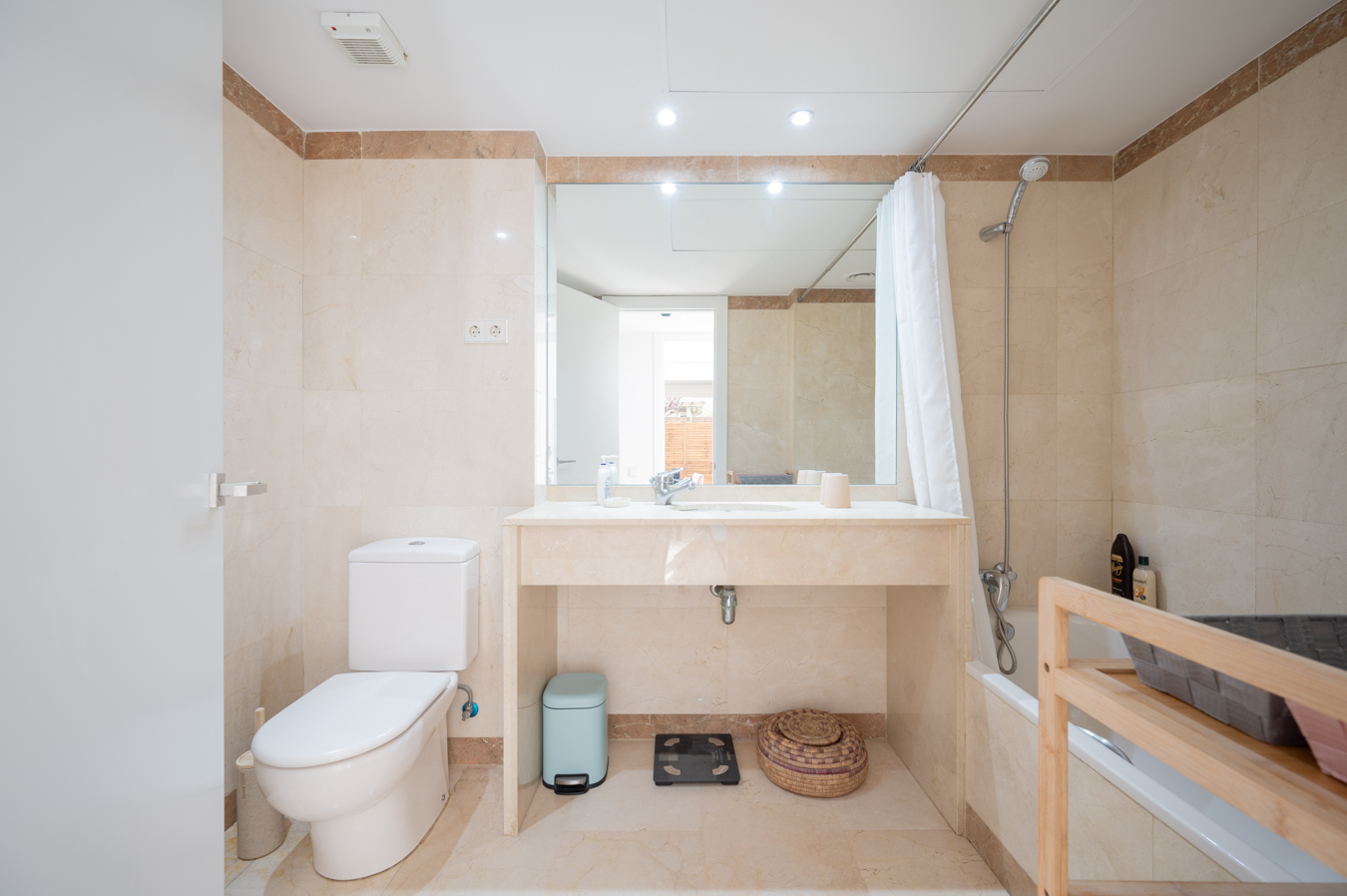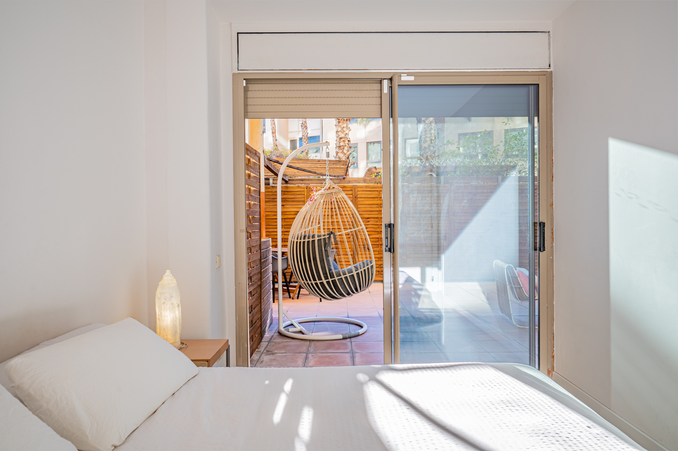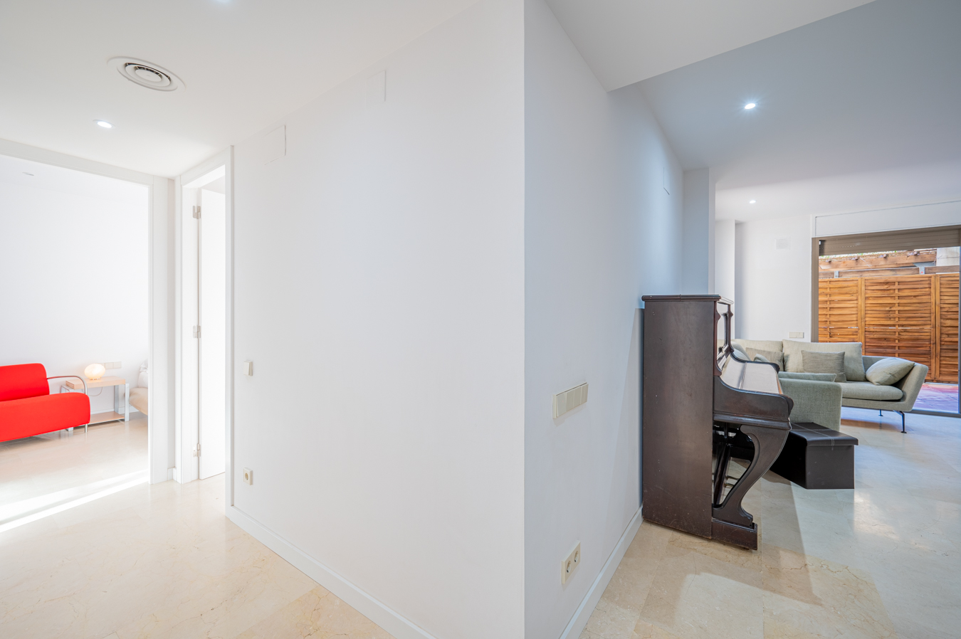 If we go back to the entrance hall, we access a hallway that divides the night area, which has 2 bright bedrooms with access to the aforementioned terrace. The master bedroom is very large, with 17 sqm, and the other one measures 9 sqm. In addition, there’s a separate bathroom and a utility room.