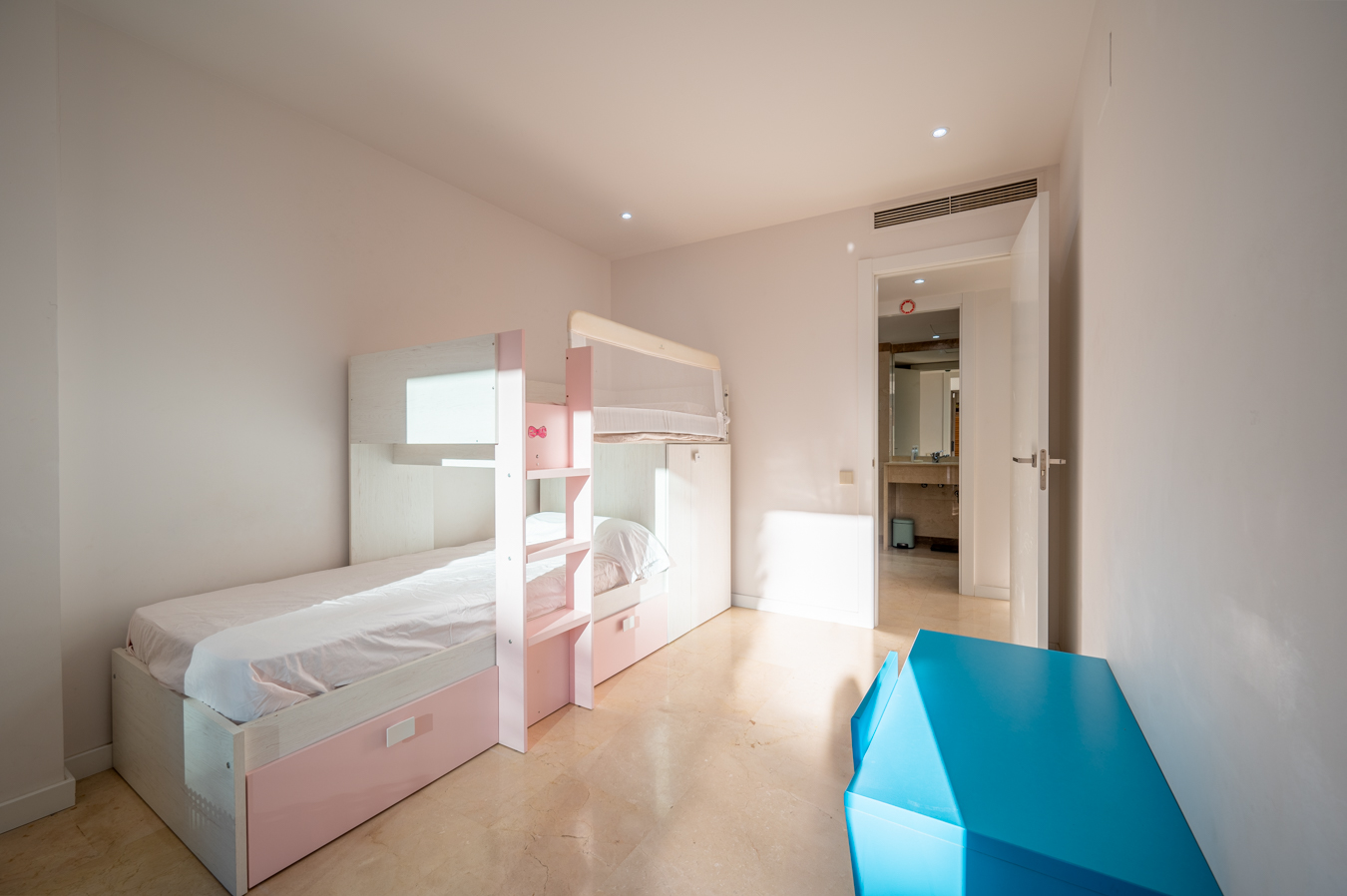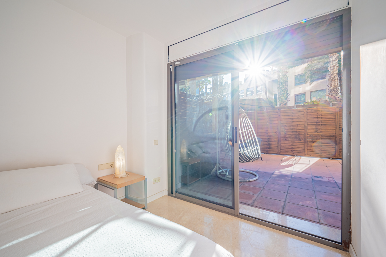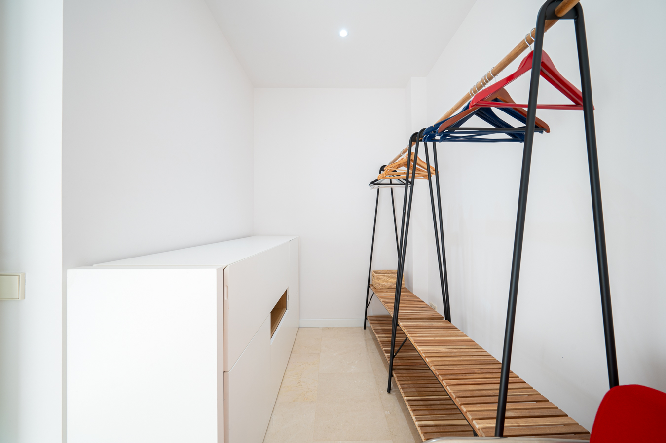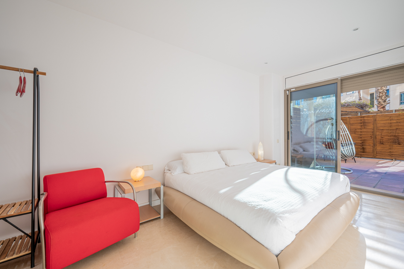 If we go back to the entrance hall, we access a hallway that divides the night area, which has 2 bright bedrooms with access to the aforementioned terrace. The master bedroom is very large, with 17 sqm, and the other one measures 9 sqm. In addition, there’s a separate bathroom and a utility room.