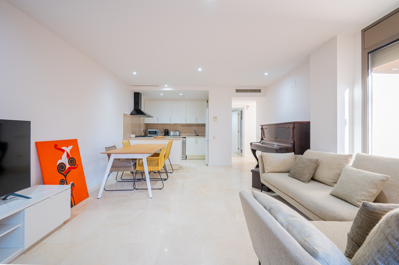 The property is on the ground floor. A spacious entrance hall leads to the day area, a cosy and bright living-dining room with open plan kitchen. It has access to the magnificent west-facing terrace, an ideal place to enjoy outdoor family celebrations, meetings with friends, meals or simply enjoy the sunny weather of Barcelona. From this terrace you can access the communal swimming pool of the building.