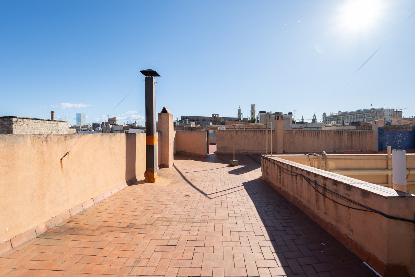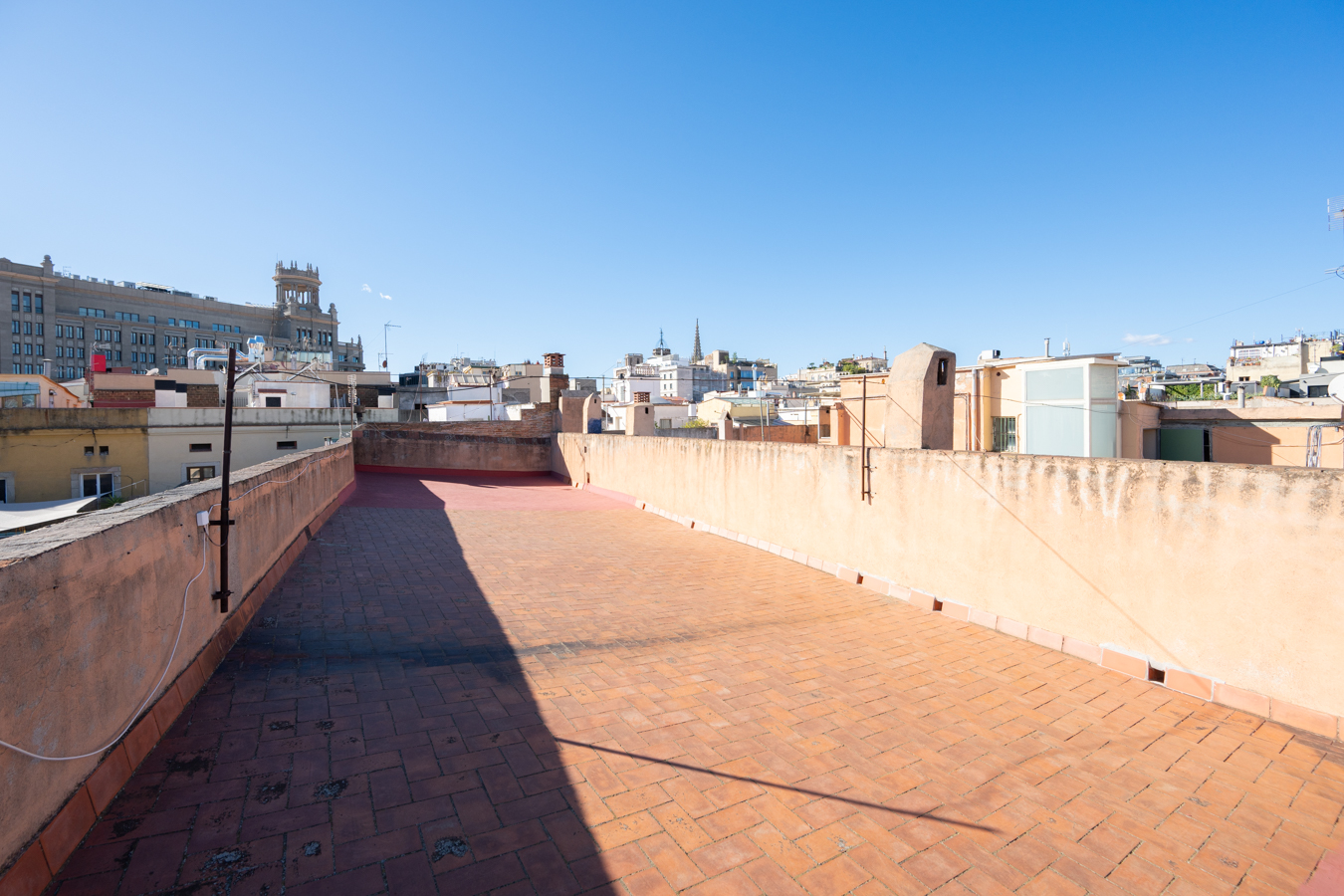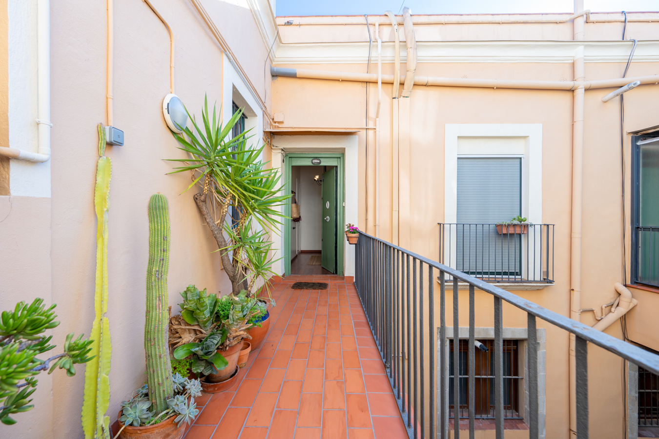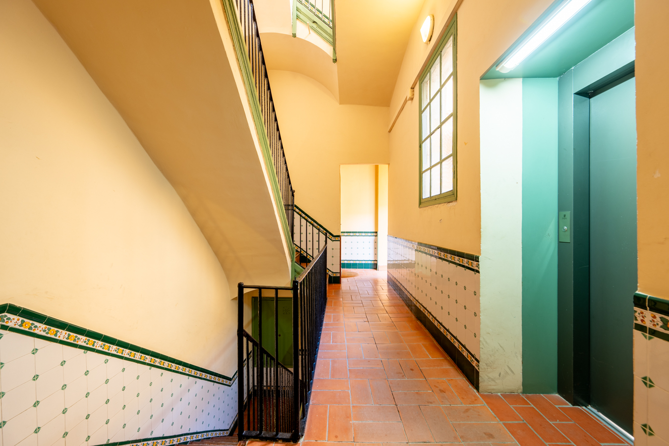 The building itself preserves its historic charm: restored handcrafted mosaics, an automatic entrance door leading to an elevator reserved for the upper floors, and a hidden gem — a 400 m² communal rooftop terrace designed as a true urban oasis, with different areas to relax, sunbathe, or admire the rooftops of El Born.