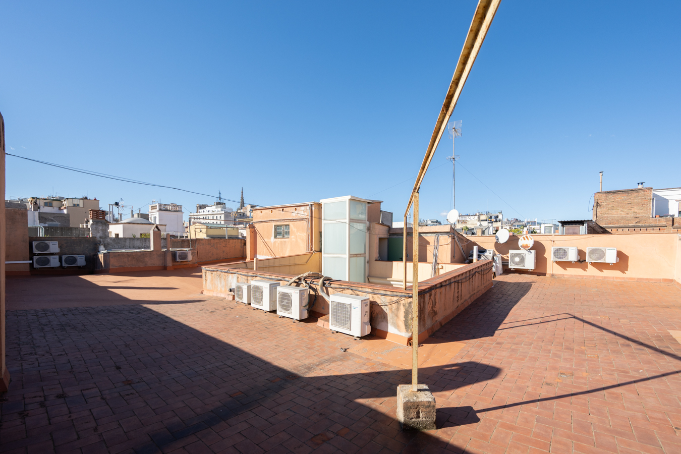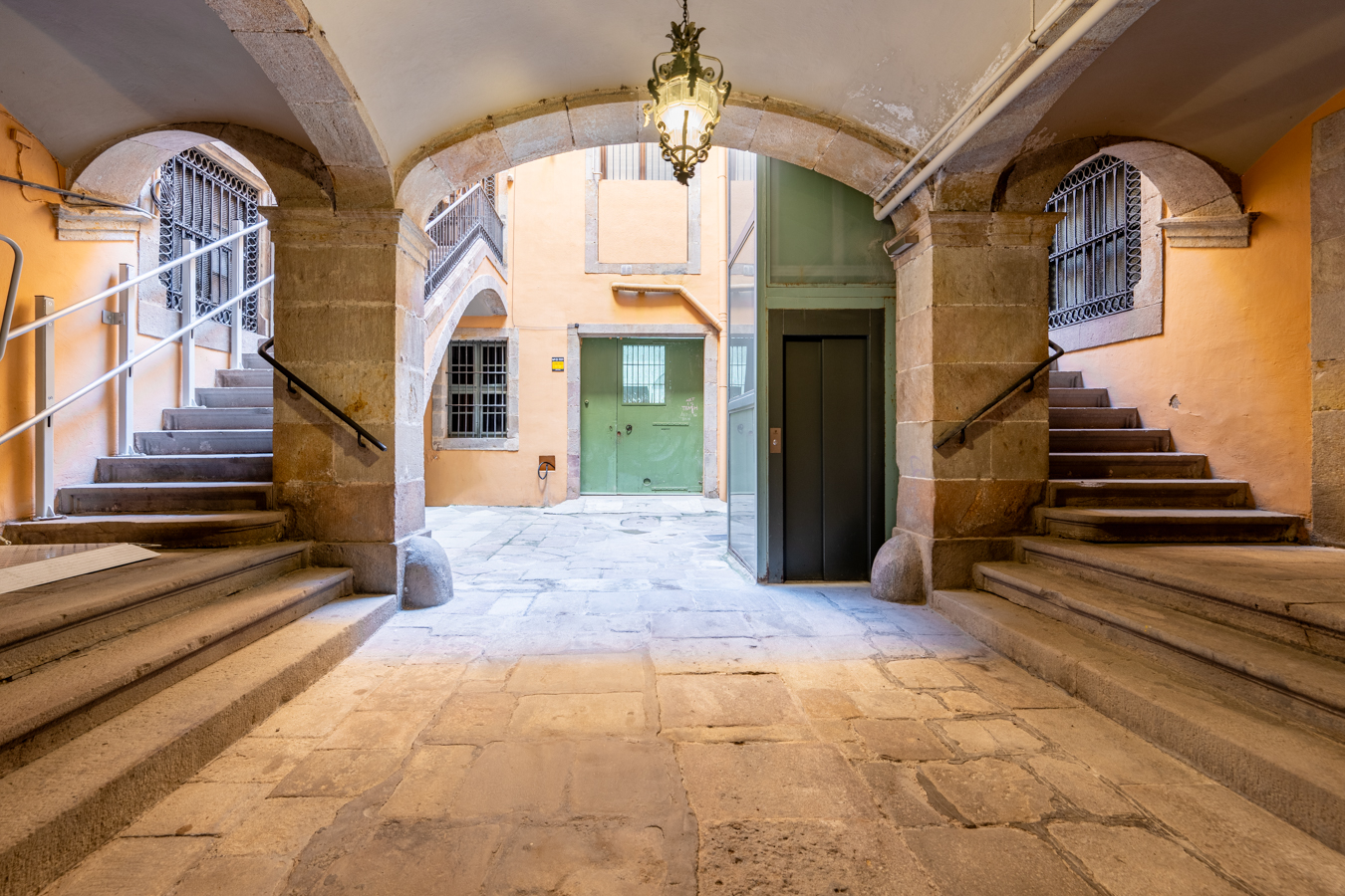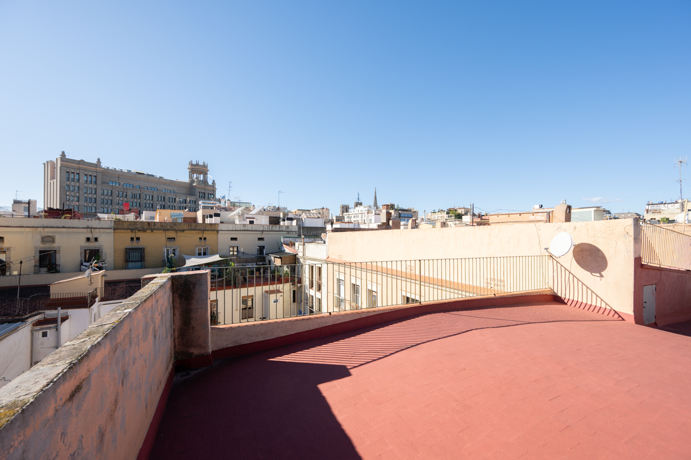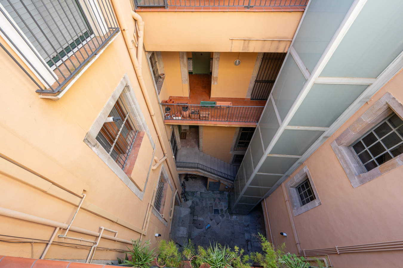 The building itself preserves its historic charm: restored handcrafted mosaics, an automatic entrance door leading to an elevator reserved for the upper floors, and a hidden gem — a 400 m² communal rooftop terrace designed as a true urban oasis, with different areas to relax, sunbathe, or admire the rooftops of El Born.