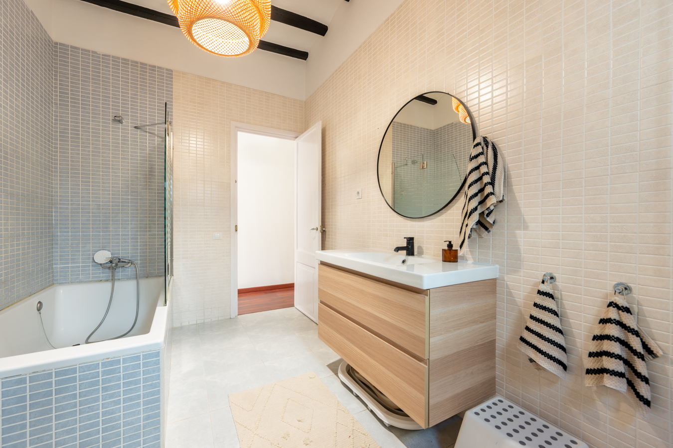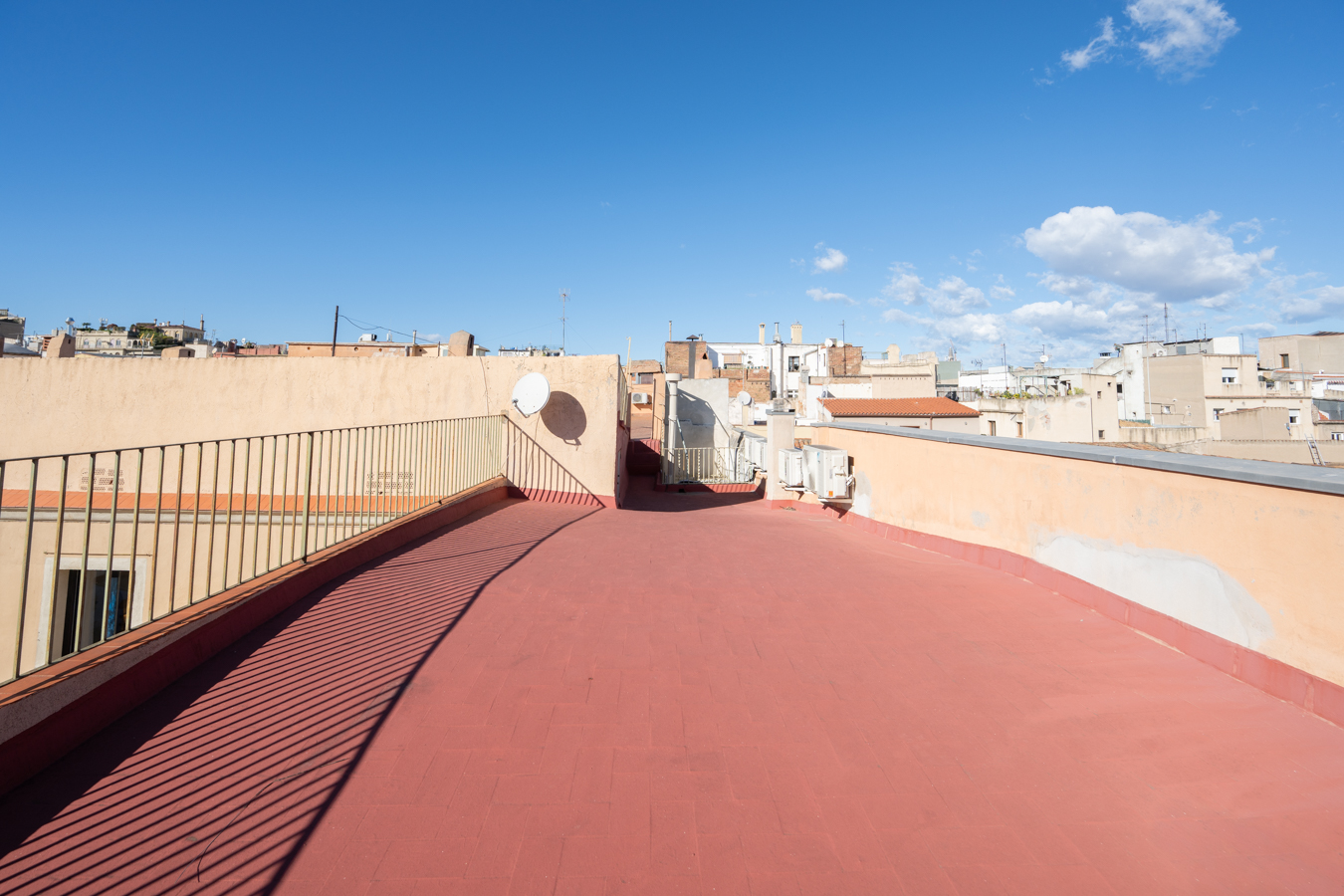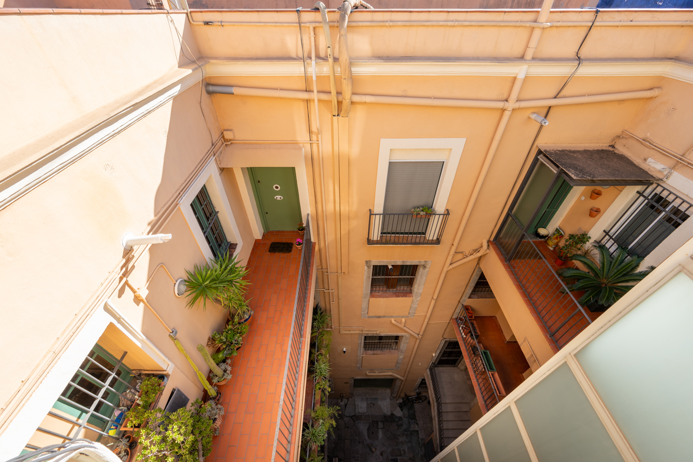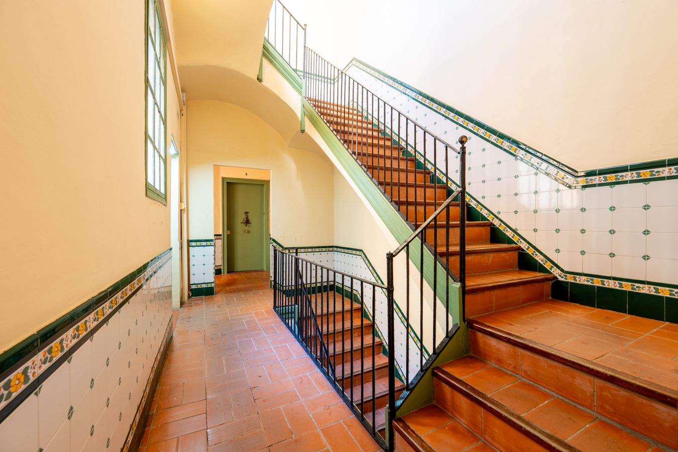 The building itself preserves its historic charm: restored handcrafted mosaics, an automatic entrance door leading to an elevator reserved for the upper floors, and a hidden gem — a 400 m² communal rooftop terrace designed as a true urban oasis, with different areas to relax, sunbathe, or admire the rooftops of El Born.