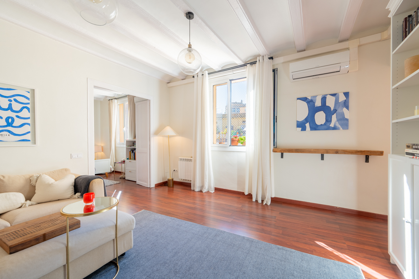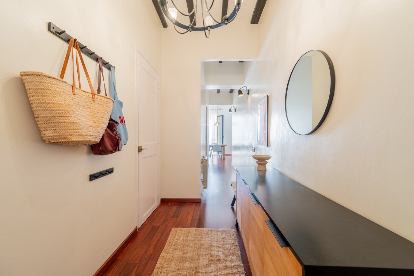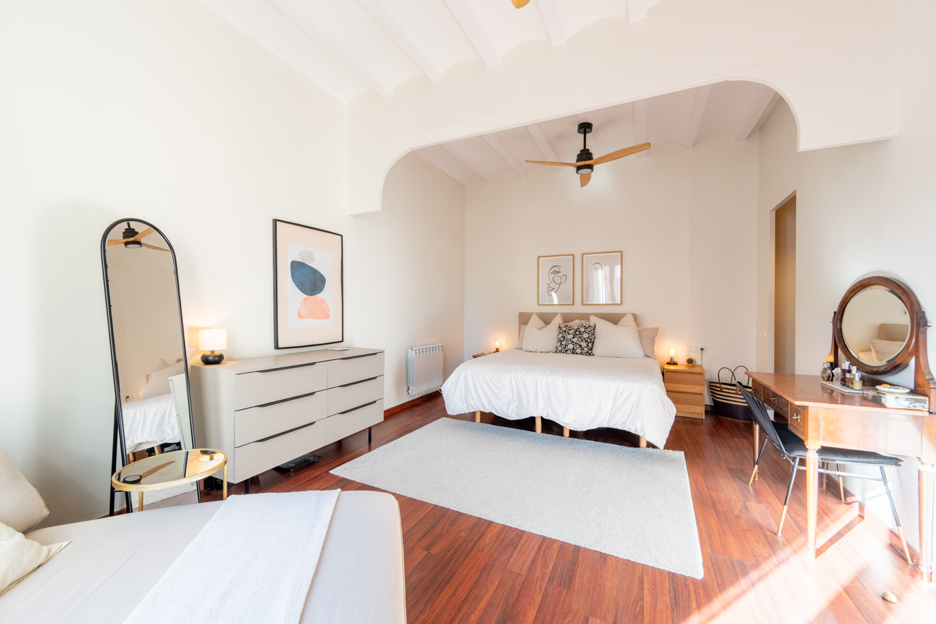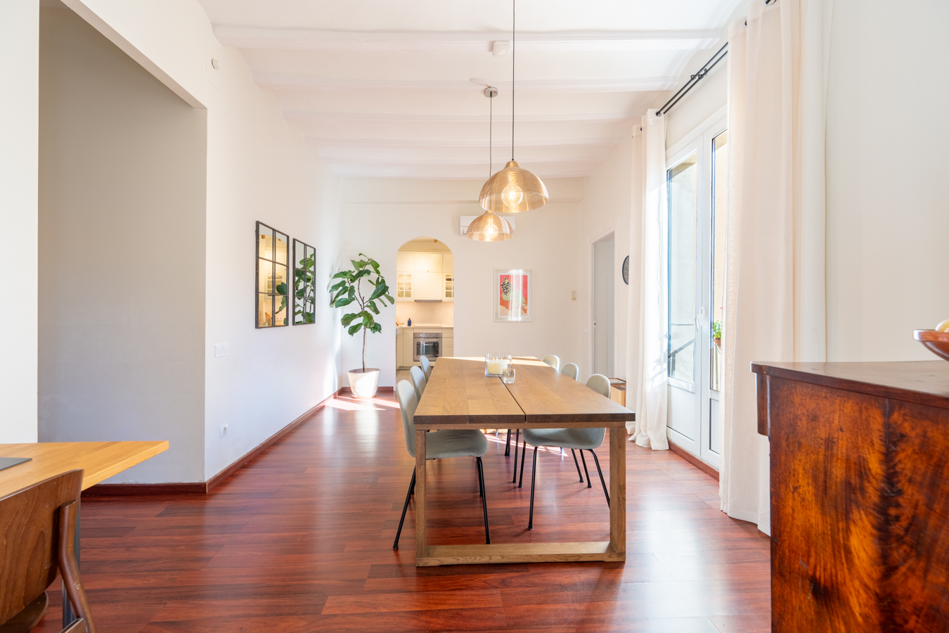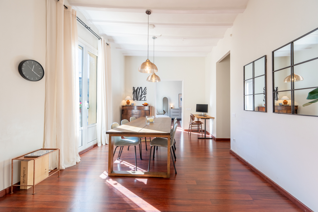 The renovation was designed around a single concept: open the space, let the light flow, and create a rare sense of volume in the heart of El Born. The high Catalan vaulted ceilings pay tribute to Barcelona’s architectural heritage, while the open-plan layout creates a warm, contemporary atmosphere.