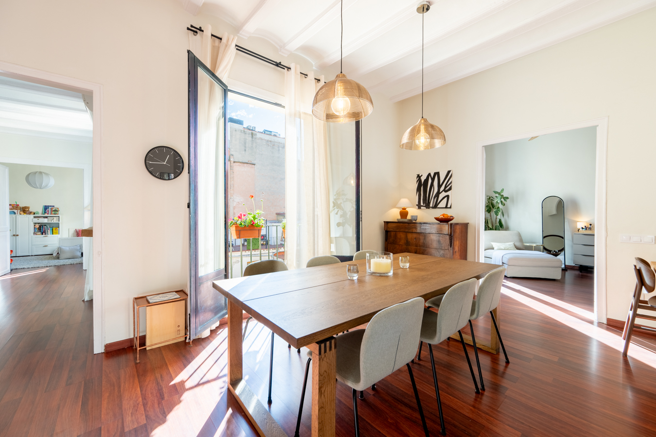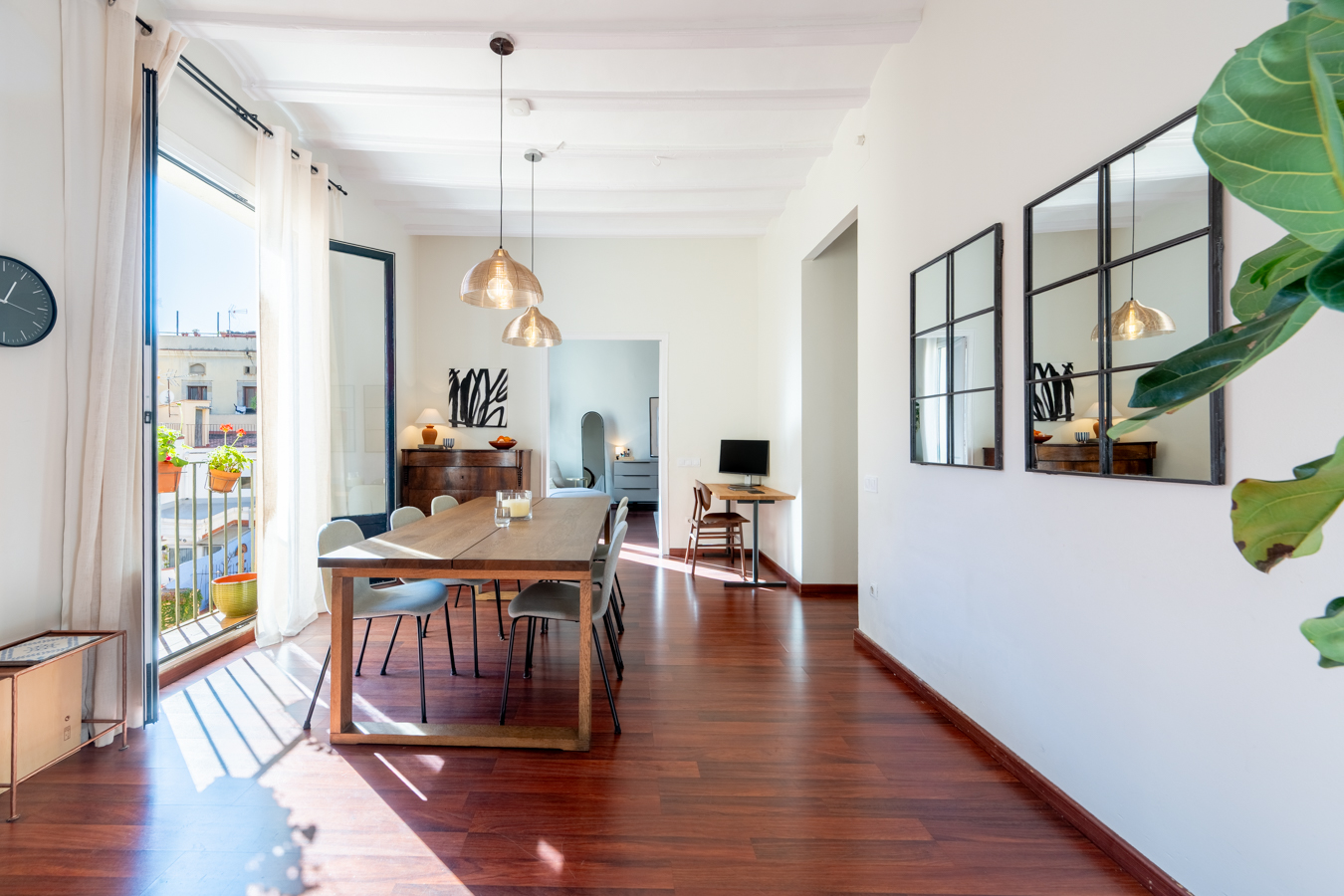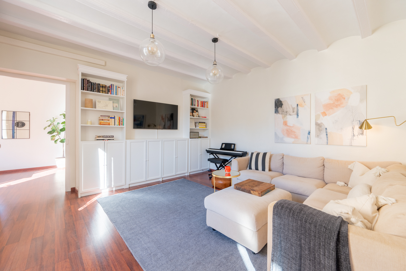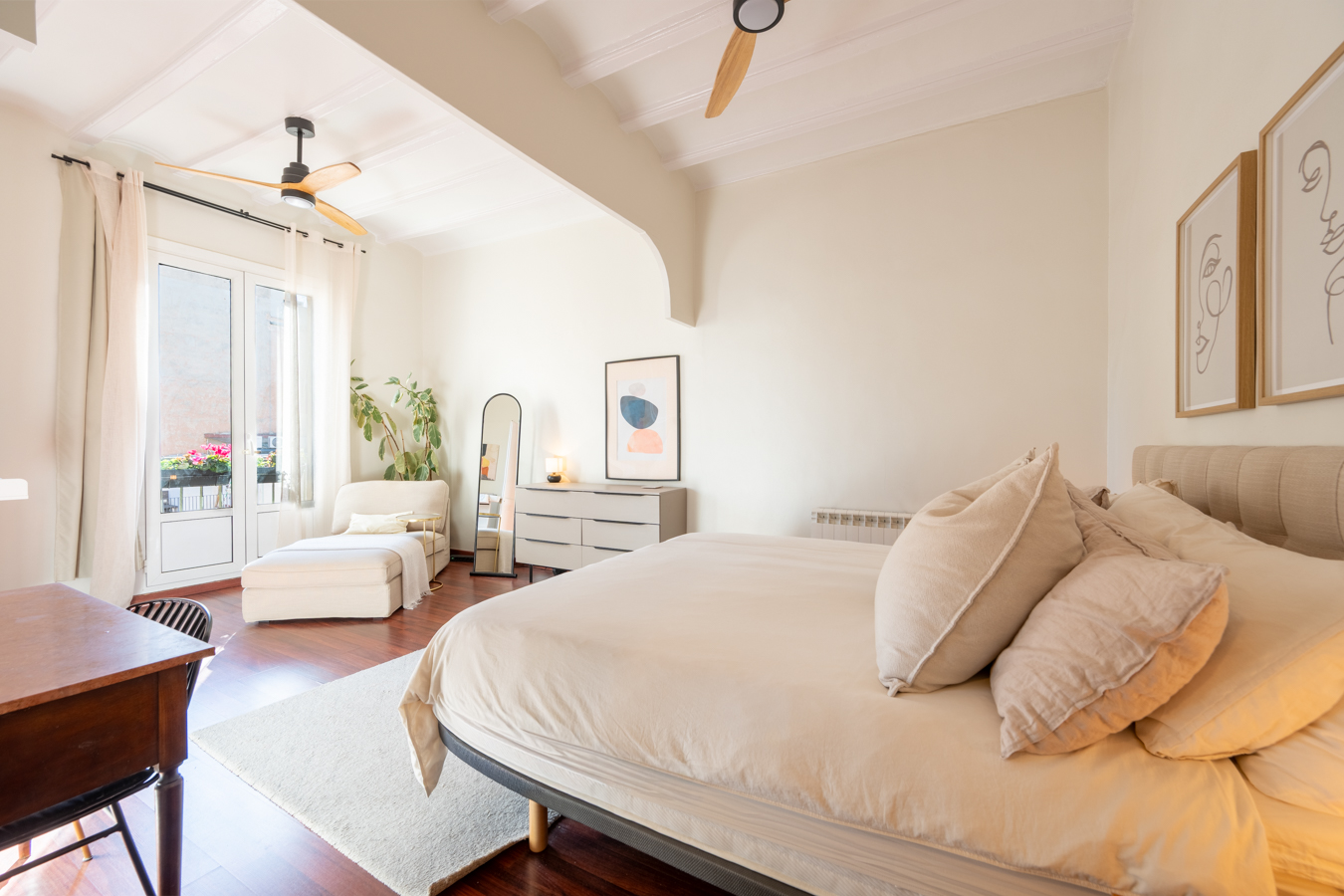 The renovation was designed around a single concept: open the space, let the light flow, and create a rare sense of volume in the heart of El Born. The high Catalan vaulted ceilings pay tribute to Barcelona’s architectural heritage, while the open-plan layout creates a warm, contemporary atmosphere.