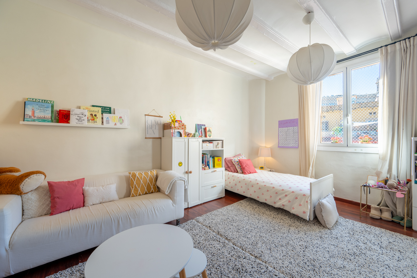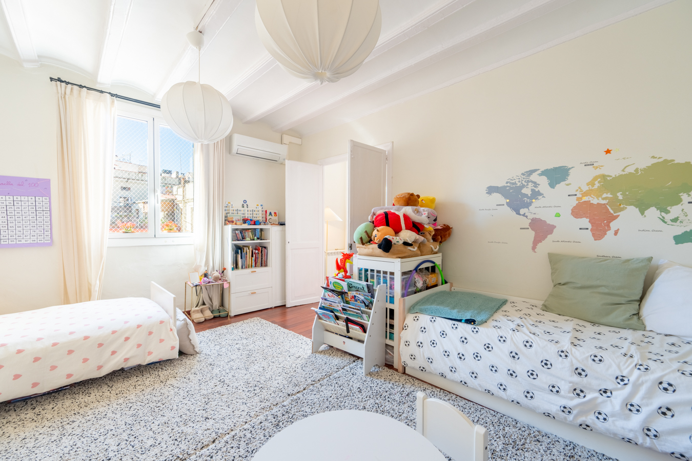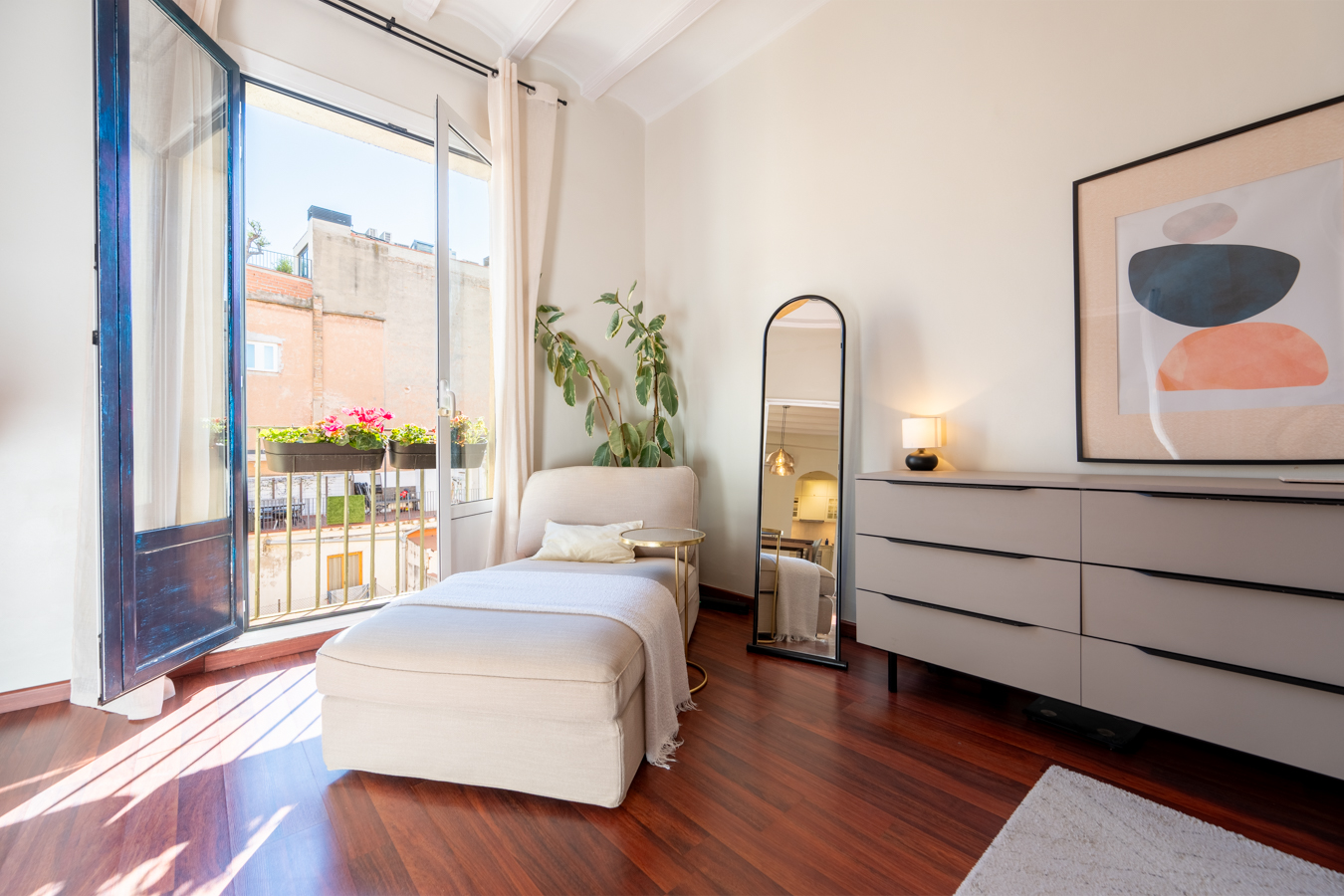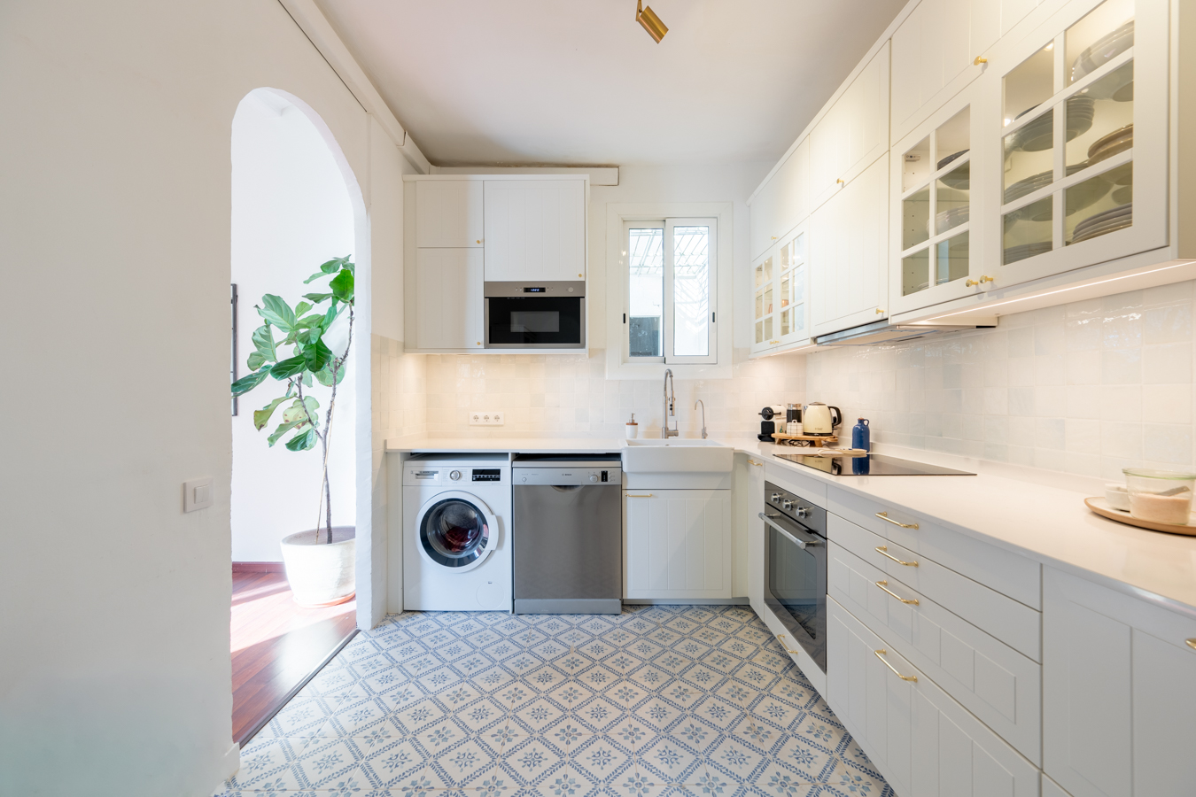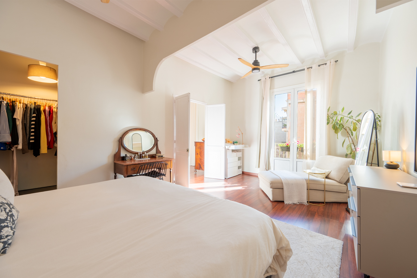 The renovation was designed around a single concept: open the space, let the light flow, and create a rare sense of volume in the heart of El Born. The high Catalan vaulted ceilings pay tribute to Barcelona’s architectural heritage, while the open-plan layout creates a warm, contemporary atmosphere.