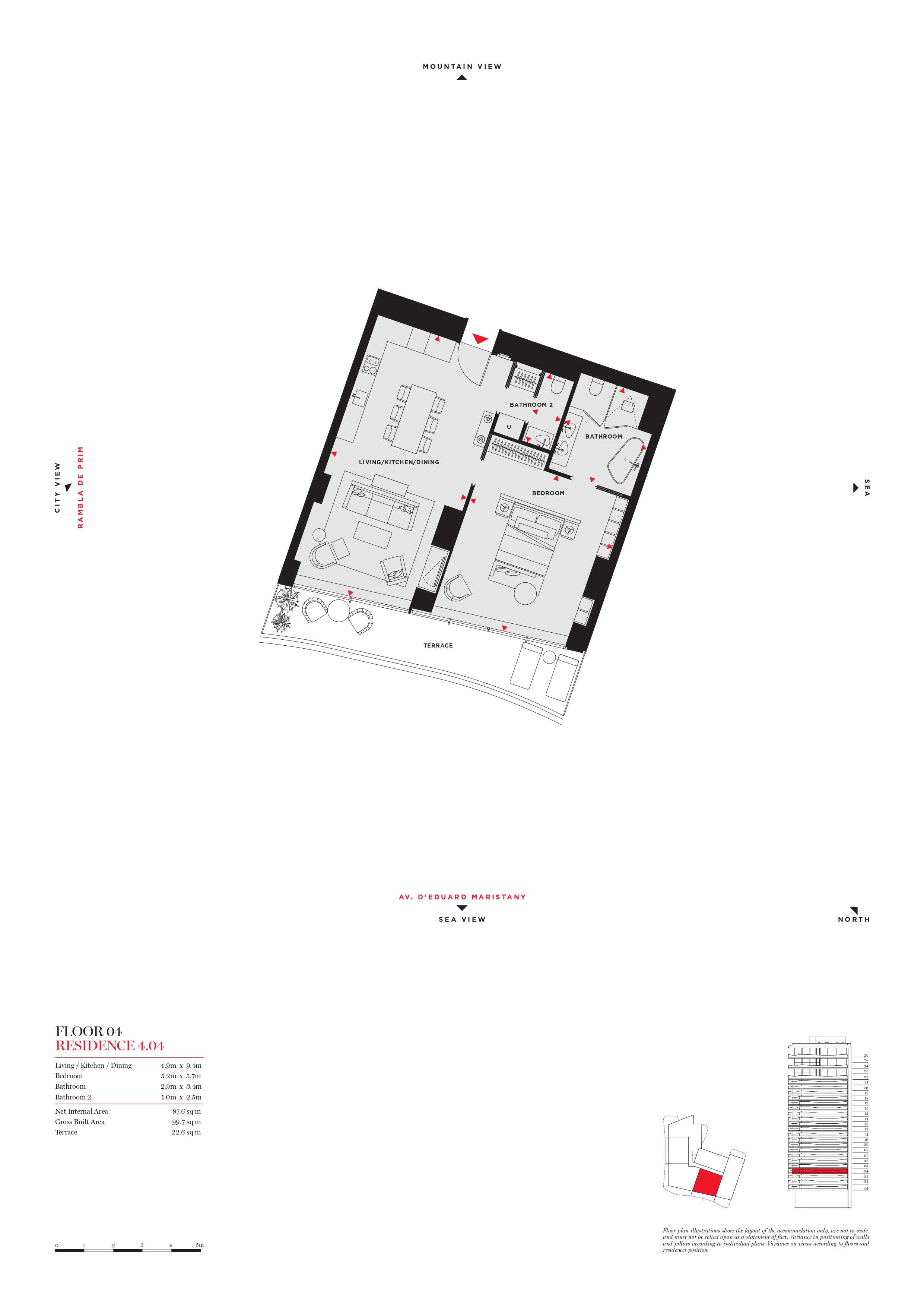 The day area is a spacious living-dining room with an open-plan kitchen equipped with home appliances. The night area has a master suite with private bathroom and bathtub; and a separate bathroom. A parking space is included in the price.