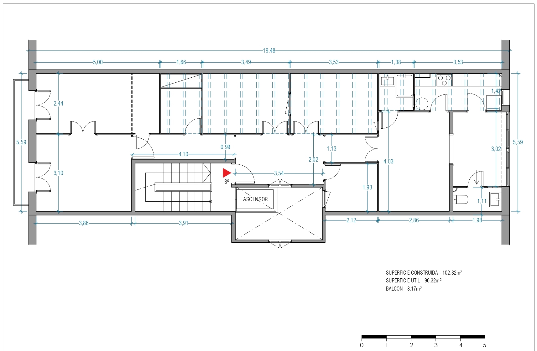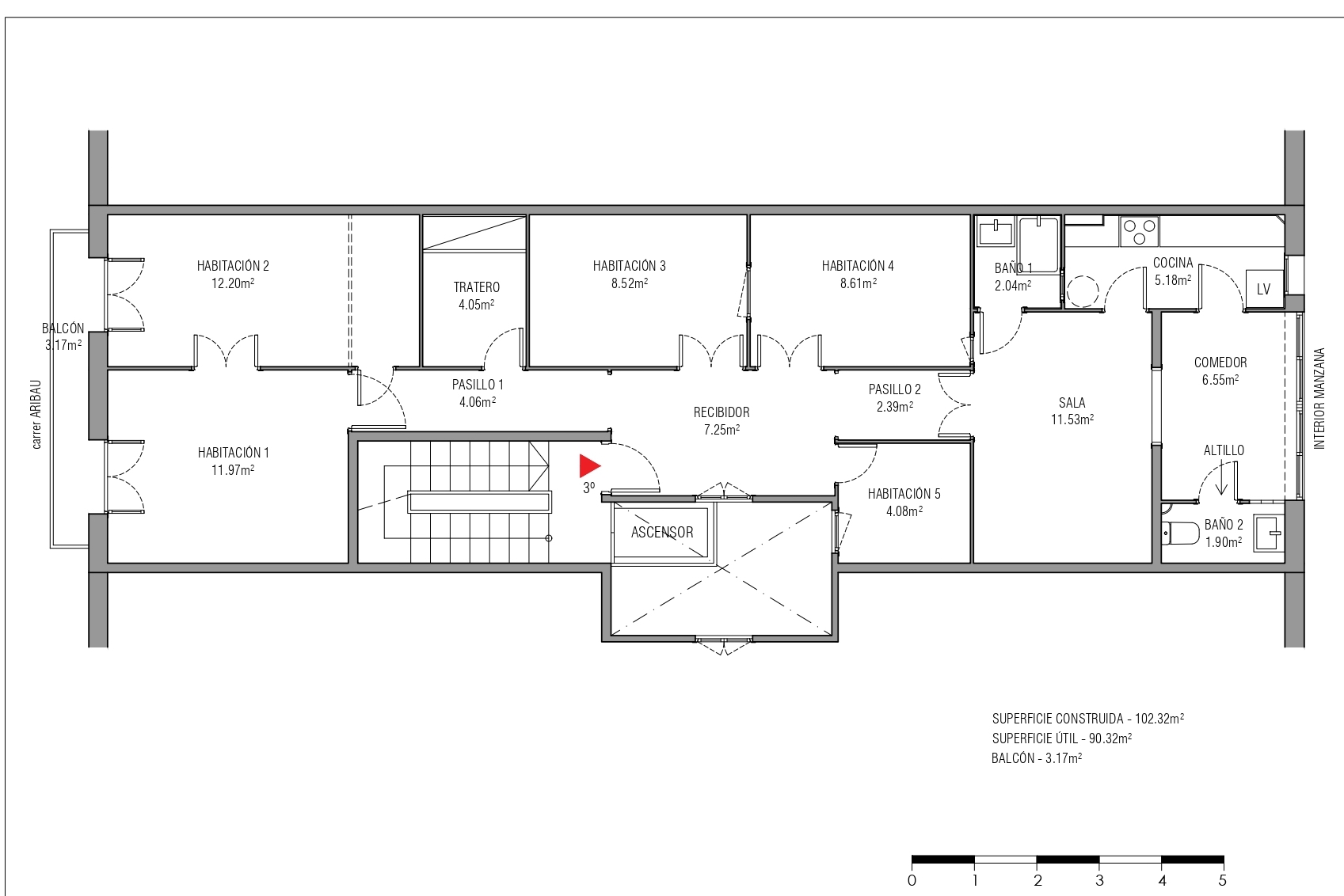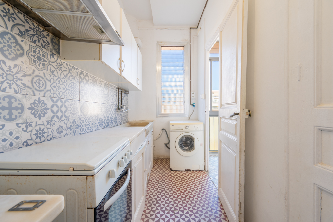 This property is the ideal blank canvas to create your dream home. It has 102 built interior sqm and a 3 sqm balcony. The current layout includes two exterior rooms with access to the balcony, which overlooks the street and, due to its height, offers a wonderful view of the city above the trees. In the central part, there are four interior rooms. Finally, at the rear of the flat, which overlooks the courtyard, there is a room, the kitchen and a gallery.