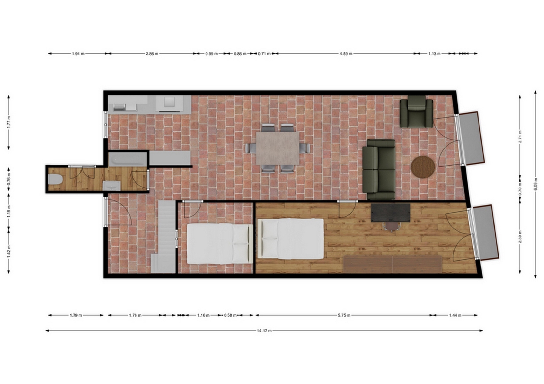 Upon entering, we are welcomed by a hall, where we find the stairs leading up to the terrace. Inside the penthouse, the layout consists of a living-dining room with an open kitchen and access to a balcony, a double bedroom with access to a balcony, a single interior bedroom and a bathroom.