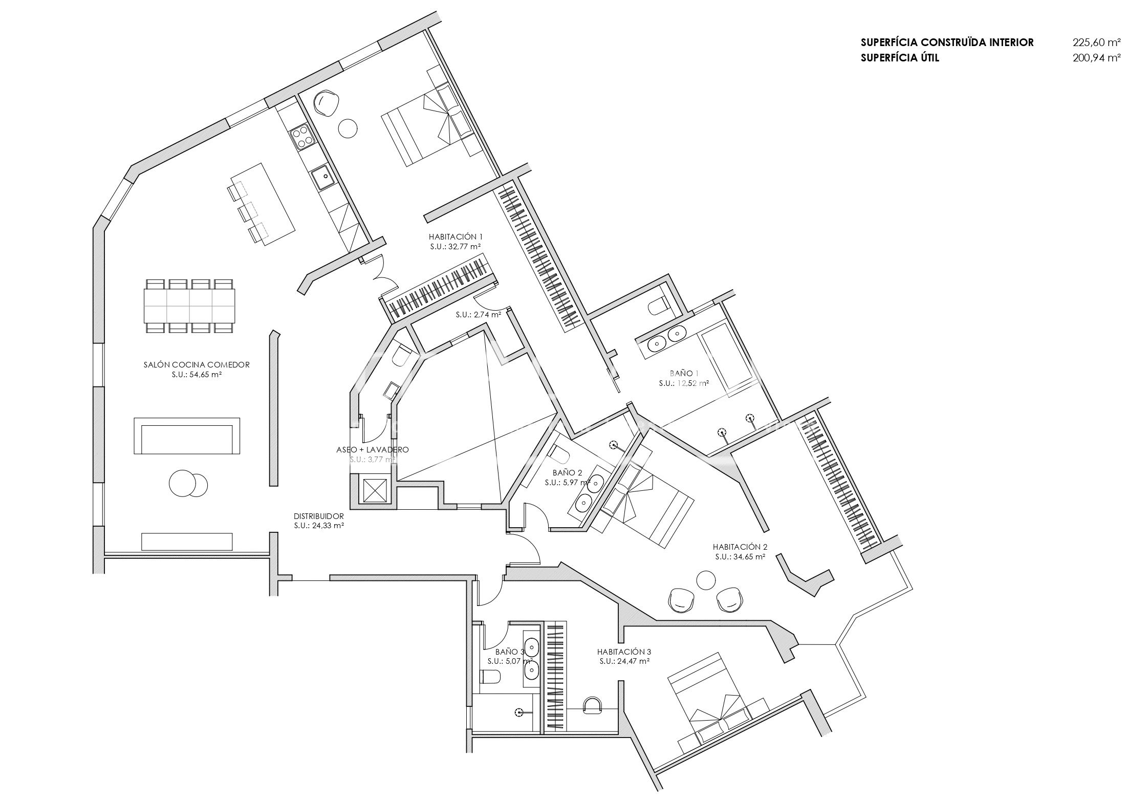 The refurbishment proposal creates a spacious day area and 3 en-suite bedrooms with their own bathrooms. The day area is on the corner and has 4 windows and balconies: it’s a spacious living-dining room with open plan kitchen and central island, fully equipped with household appliances. In the corridor, there’s a toilet with laundry area.